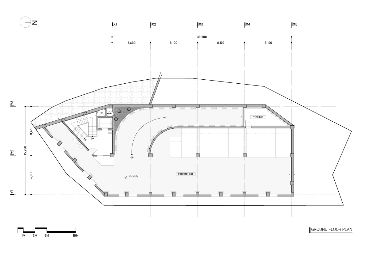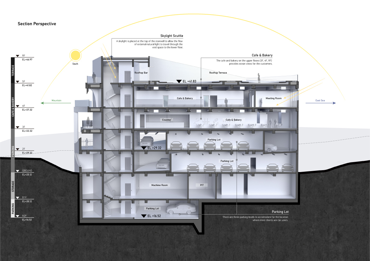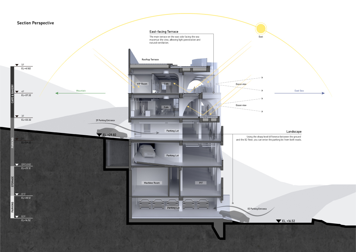 Building area according to the land size of the land. It was necessary to consider the appropriate size of the cafe area, the number of parking lots more than the legal standard, the movement system linking two roads in contact with the land, and the possibility of future expansion. Considering the legal construction rate of the land that can be changed in shape, the maximum width of the building was about 15m. It was also the minimum dimension to create the business feasibility of the project, accounting for the legal minimum standard for the radius of rotation of the vehicle. The upper two floors are high with a dramatic view of the sea and consist of a coffee shop along with a rooftop. Visitors can access the upper coffee shop by entering the second floor above the ground on the main road connected to the outer city center