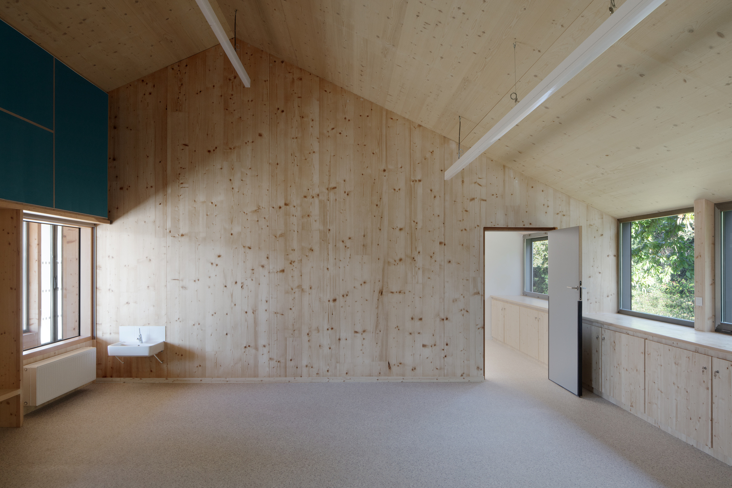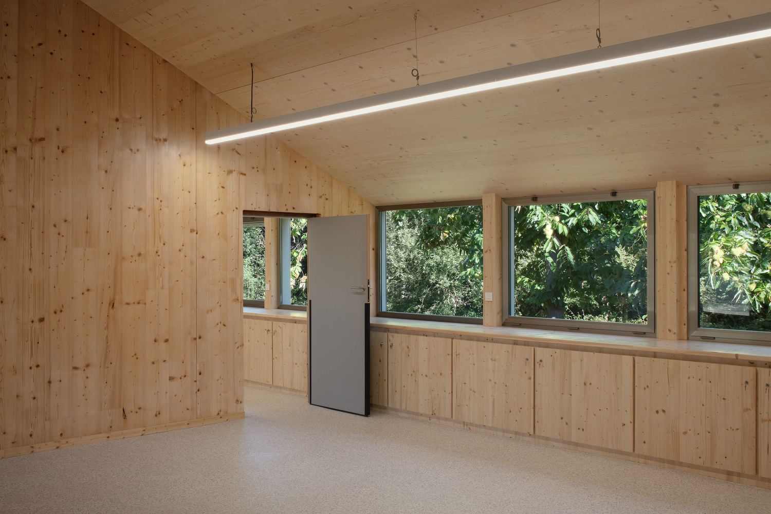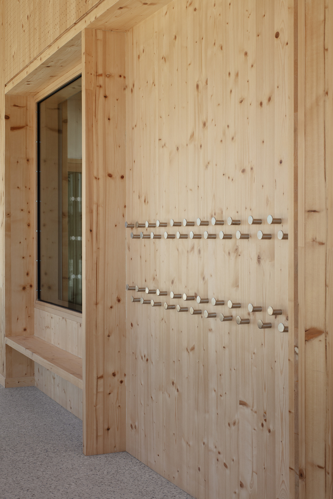 The activity spaces, all identical, bright and generous, look at the forest and open onto a large circulation bathed in light. More than a serving space, it is a real living one, creating the link between the courtyard and the classrooms, opening onto the outside. All the spaces are composed with structural wood panels end wood furnitures, offering children a warm and healthy place to learn and create.