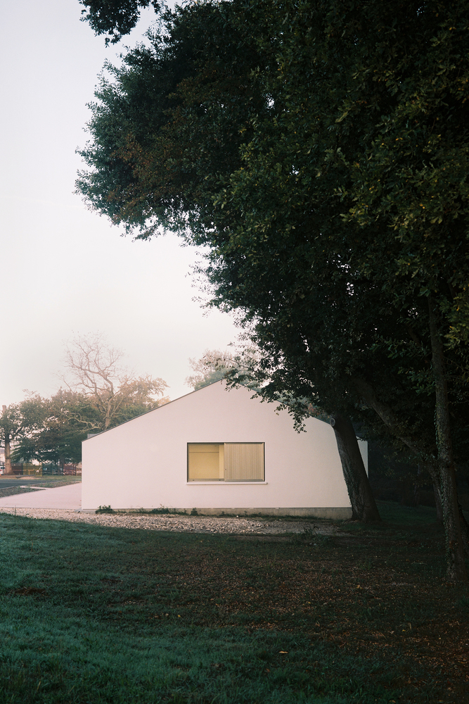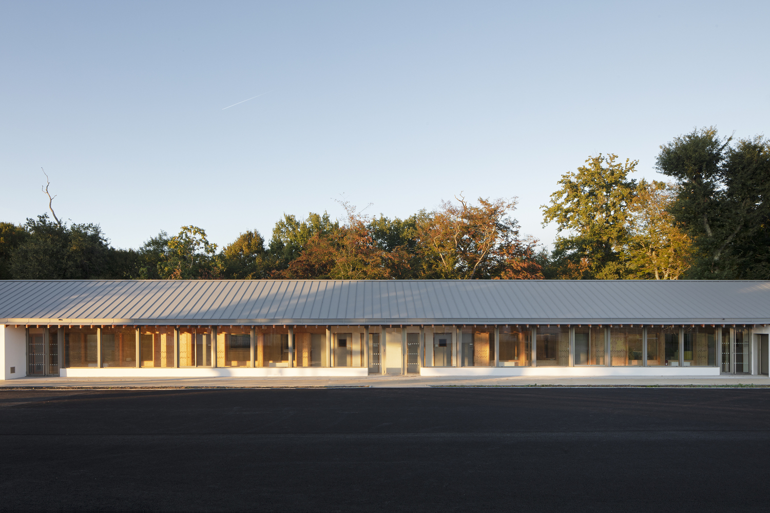 At the edge of a forest, our intervention create the limit. Facing the South and framing the trees, the building captures the views and the light. The apparent structure in wood and concrete creates the space partition, expressed through a simple, rational and repetitive plan for the sake of economy.