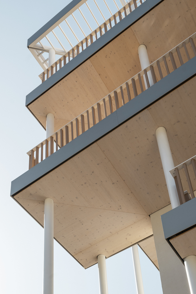 Innovations and technical specifications. Solar panels installed on the roof ensure a virtuous cycle of exploitation of natural resources. The floors of the balconies are made from the recovery of CLT window off-cuts. The facade coating was made with an ATEX (a French label for the creation of technical innovation) developed specifically for the project. The railings are made of Geolam composite wood resin, a durable and weather-resistant material.