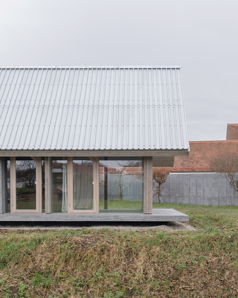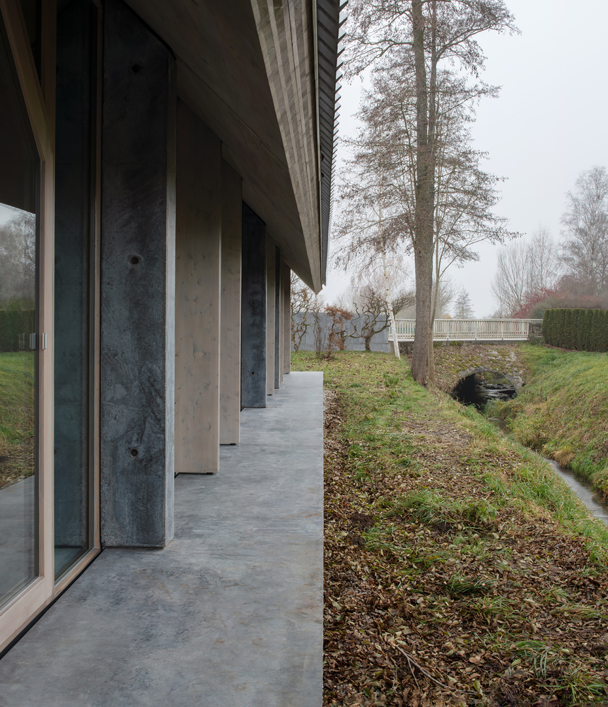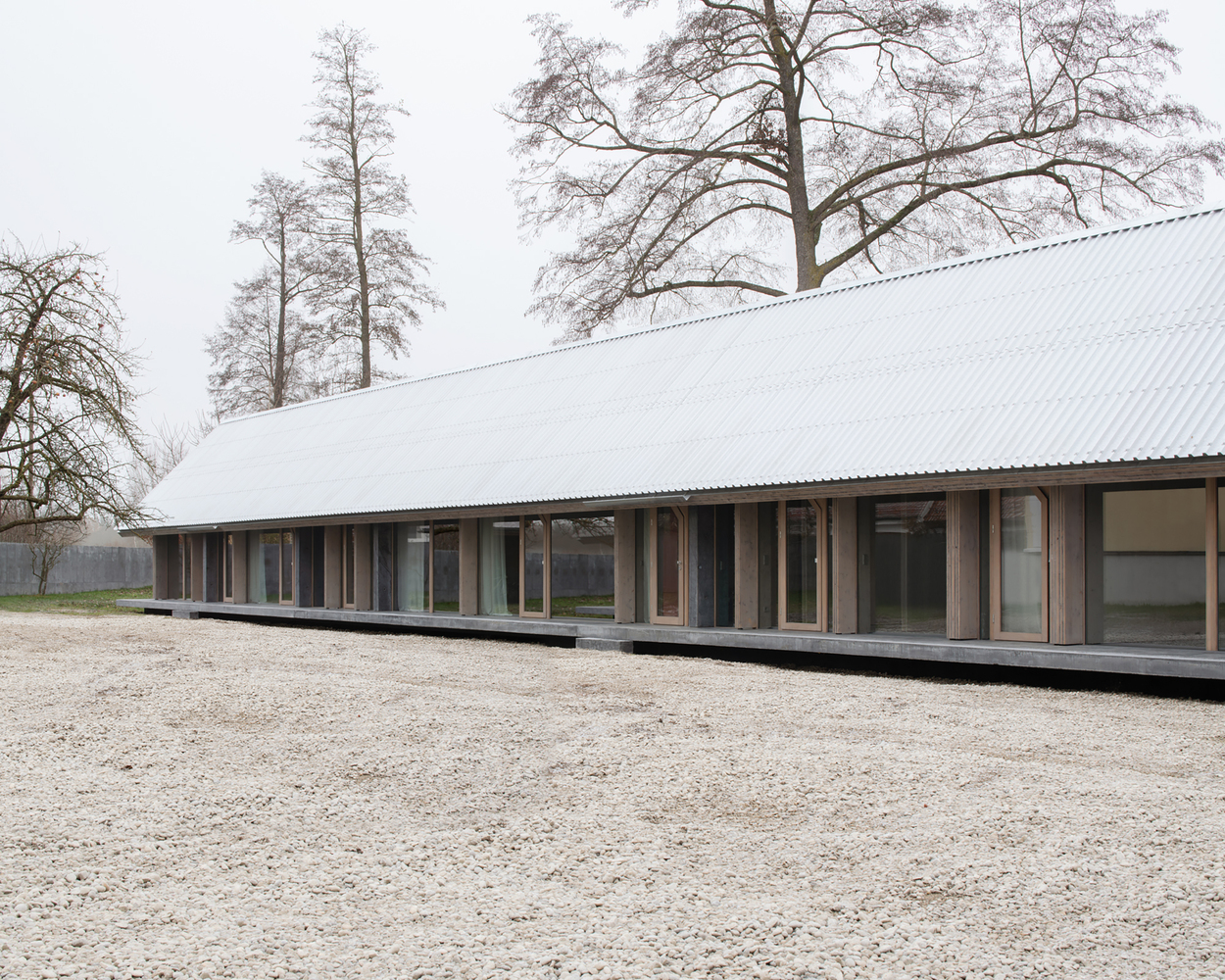 6x60 House is a one-storey building settled along a stream. It hosts three apartments with different dimensions, belonging to three members of the same family. The building is located between two different surroundings: wide agricultural fields and a far forest on one side, and the main road of the village on the other. In order to detach the house from the ground, a system of piles has been used to support the concrete slab on which 21 parallel walls are resting and supporting a pitched roof. 3 concrete steps located along the South-East side permit to access to the porch on the platform, from where it is possible to walk all around the building and access the apartments.