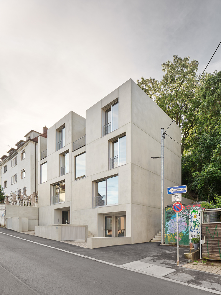 In Stuttgart South, on one of the Heslach slopes, the VON M office has found one of those still open plots of land that are becoming so rare in the city. Because of its topography, on a slope that rises sharply to the south, it was long considered almost impossible to build on. The architects have developed two almost identical houses, each with an almost square floor plan. The design incorporates both the eaves height of the neighboring house to the east and its building depth as a scale-setting element. Since the building had to dig up to three stories into the ground due to the extreme slope of the site, it was quickly determined that a large part of the house would have to be built in concrete. To keep planning and construction costs low, VON M developed a catalog of simple details and joints using precast concrete elements that now characterize the entire duplex.