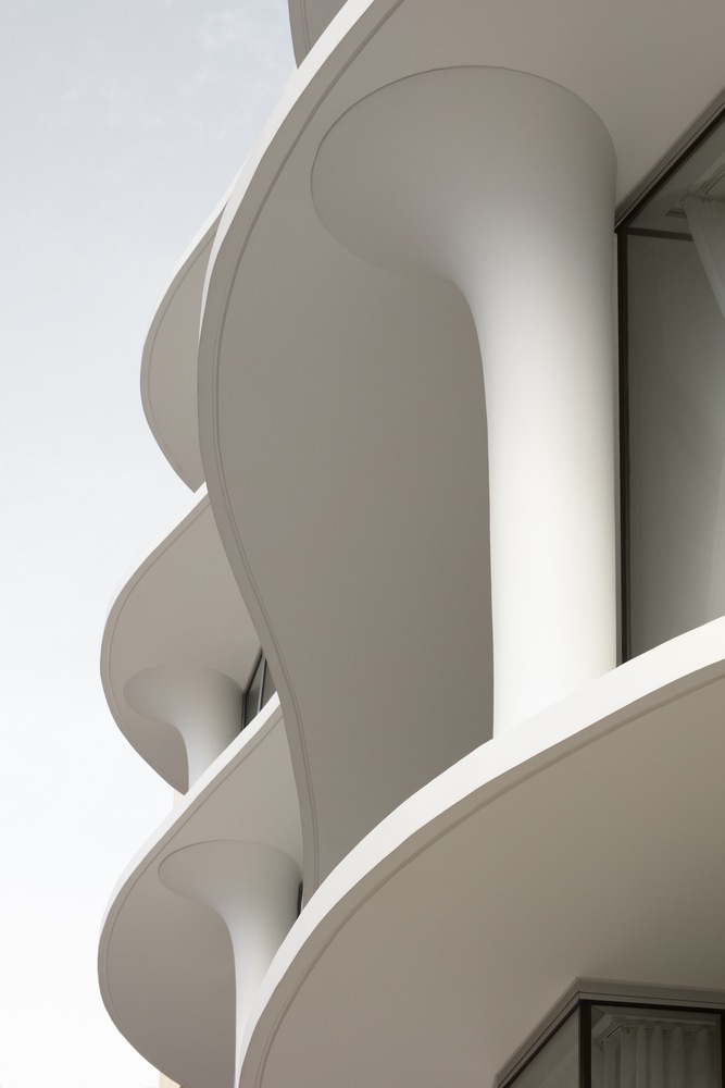 Referencing the sinuous curves of nature, the asymmetrical building appears to be carved from a singular raw material, abstracting its formal composition. Its softened floorplates read as the primary element subtly molded into fine blades resting on an irregular grid of feature-fluted columns. The interplay of flowing forms gives the building a sense of visual movement. Deep rippling along the undulant facades results in a conscious layering of positive and negative spaces allowing the integration of intermittent gardens with vegetation growing to further soften the forms.