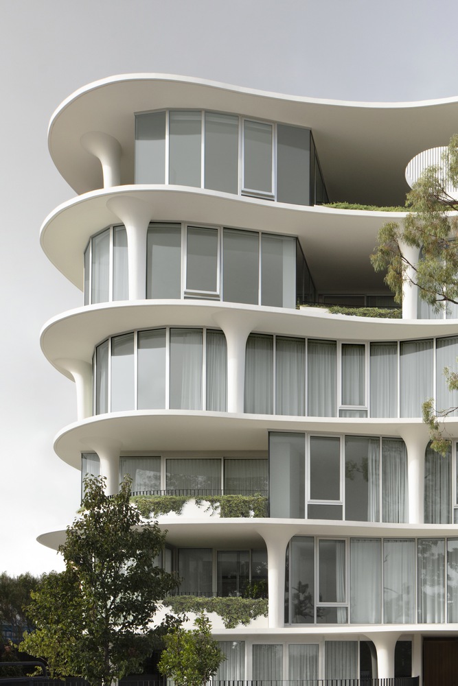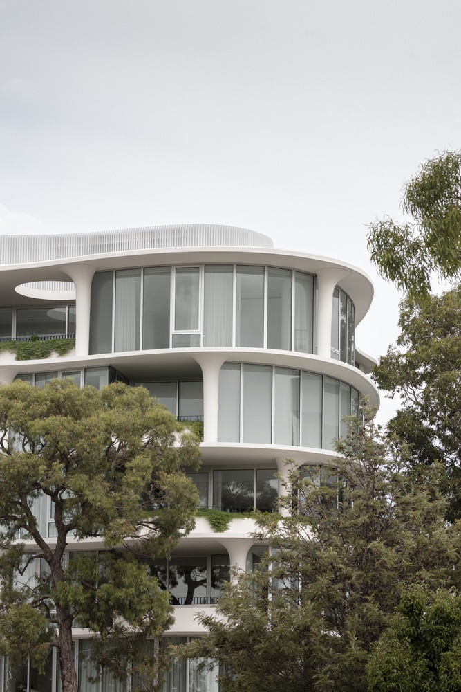 Developed in collaboration with V-Leader, No. 6 Sydney Street is a curvaceous result of carving out its urban block, breaking down the walled streetscape created by its rectilinear neighbors. Its polished form carefully experiments with ideas of solid and void, in a monochromatic visual quality. Its connection to nature and use of movement, and artistry have produced a unique outcome that sits in contrast to its surrounding residential context.