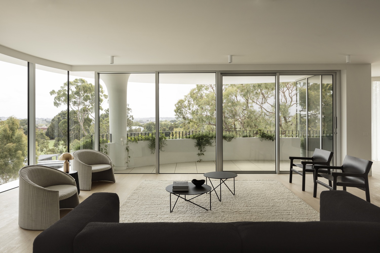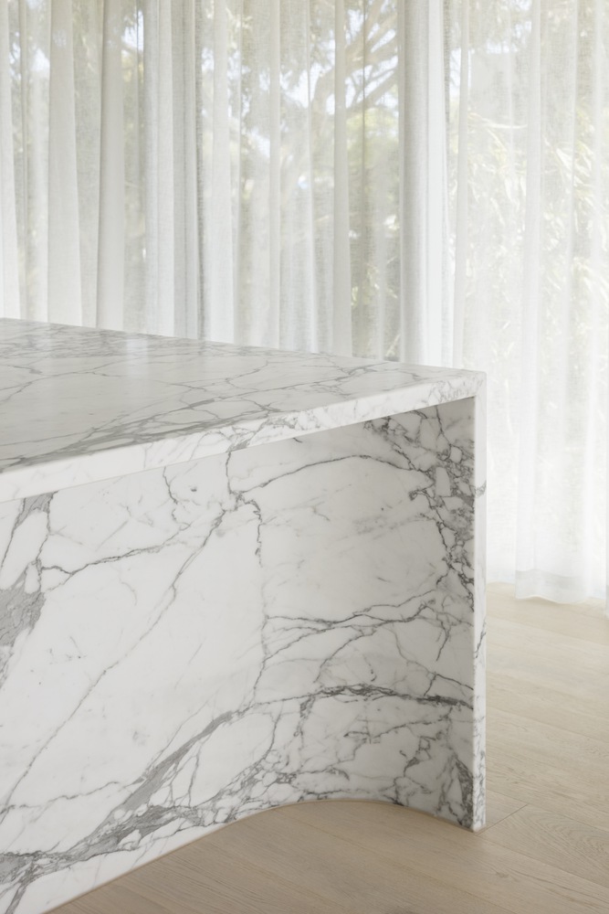 Each of the residences is unique with different access to light, sightlines, and terraces. Planting, park, and city views beyond are framed by the expanse of glazing and horizontal planes. Many of the interior surfaces are softened with the use of curving volumes and plaster, taking cues from the exterior form. Highly crafted joinery in natural timber and book-matched marble add to the overall feeling of warmth, contrast, and a refined approach to pared-down luxury. The bathrooms are wrapped in a travertine mosaic providing a subtle textural quality to the space and contrasting with the solid vanity unit of stained timber and stone.