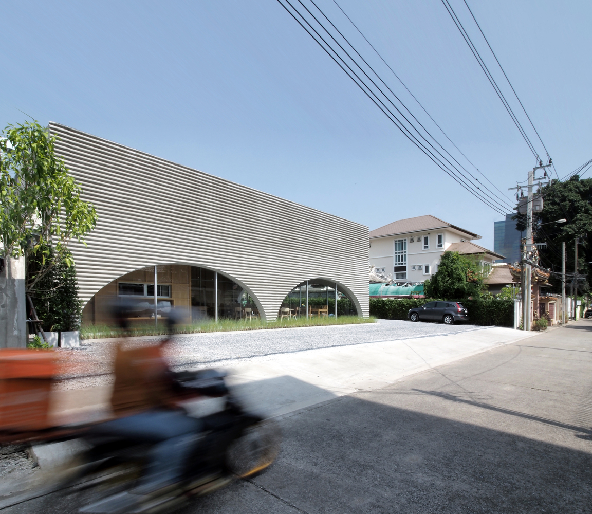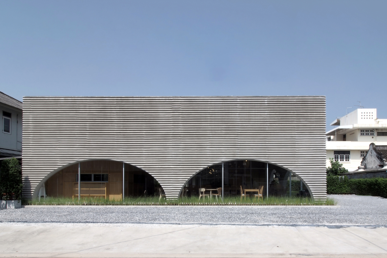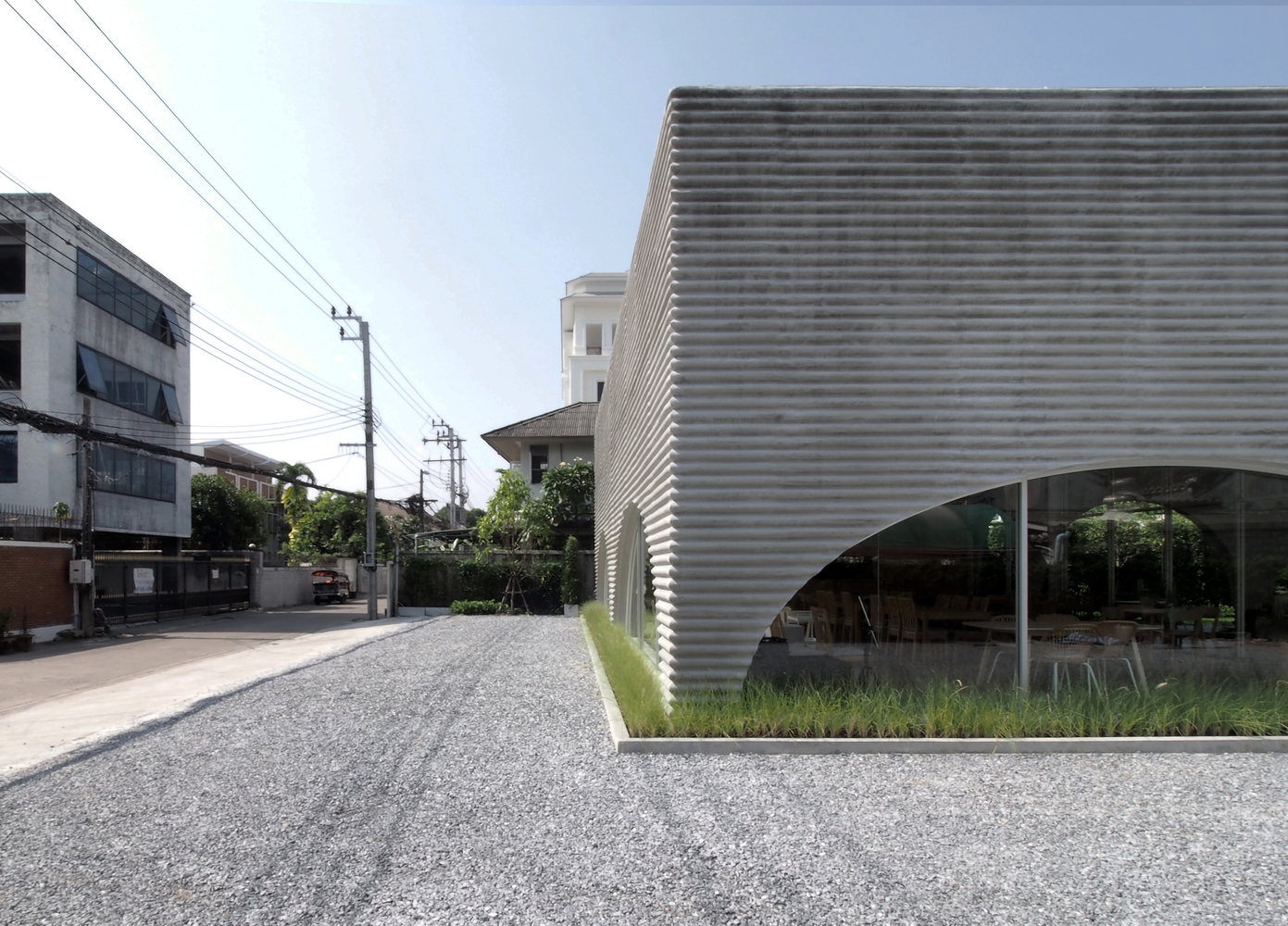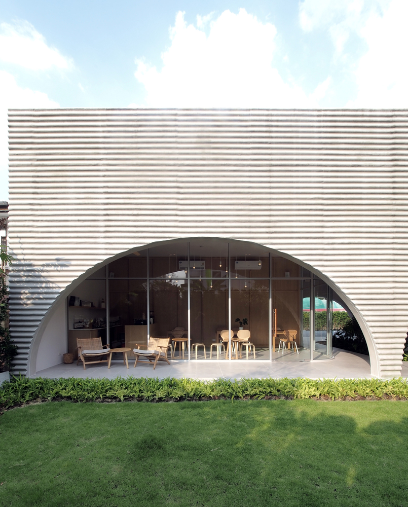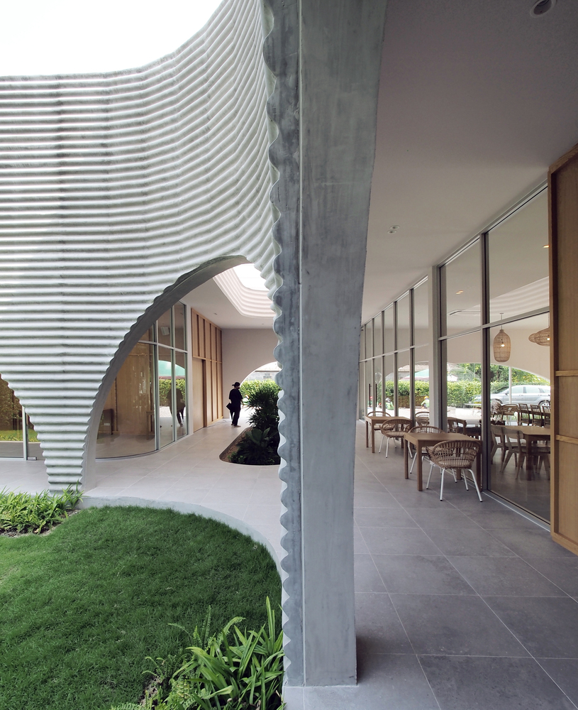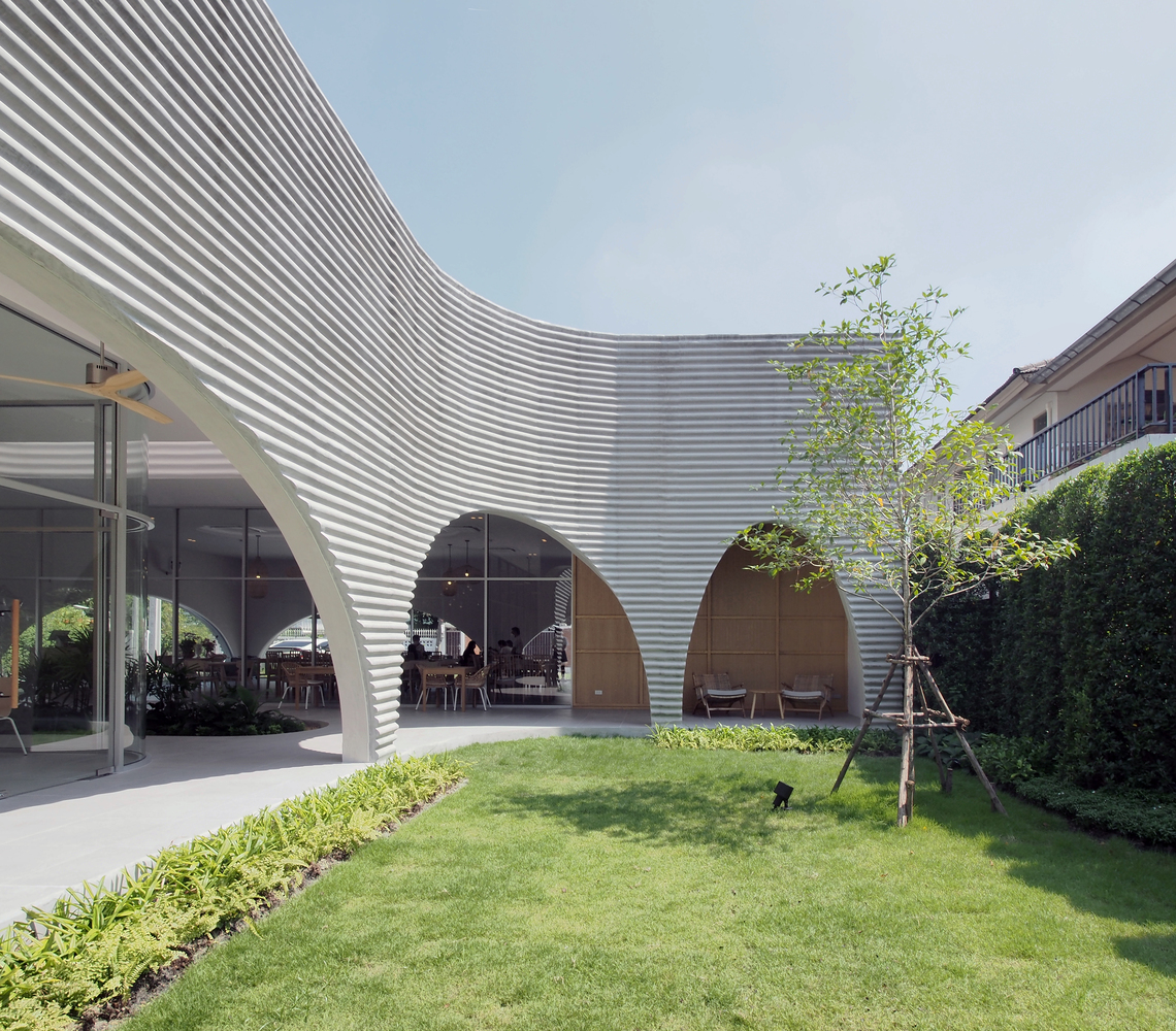A wavy precast concrete facade formed by an onsite concrete mold for a new restaurant designed by ASWA for Khao Niao restaurant + Onda cafe around Ari, Bangkok, Thailand, surrounded by residential buildings with some restaurants and cafes.