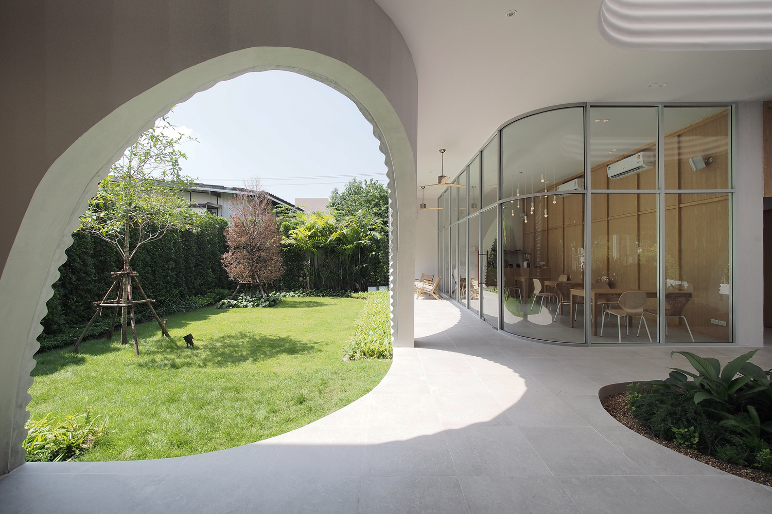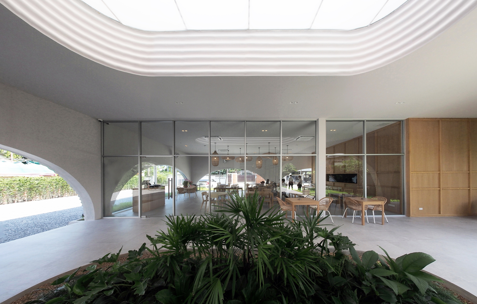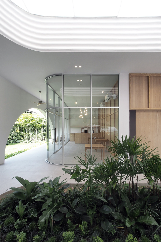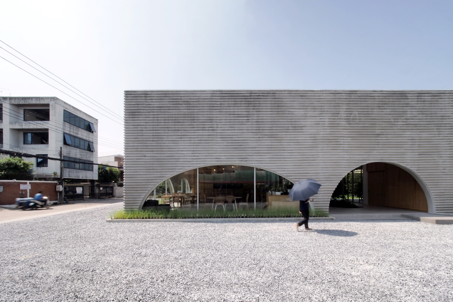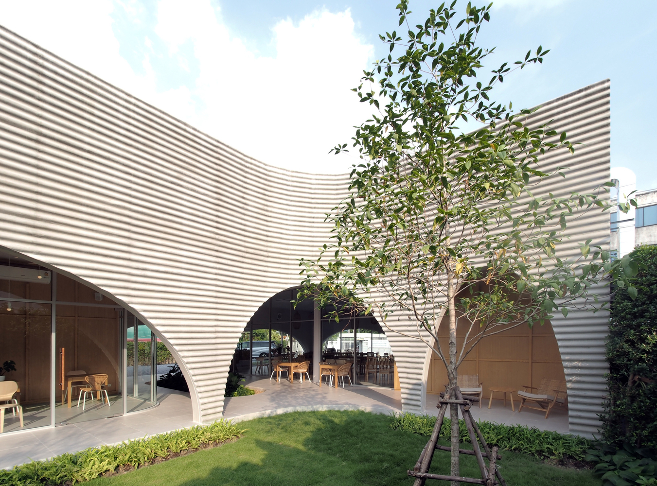 A wavy precast concrete facade formed by an onsite concrete mold for a new restaurant designed by ASWA for Khao Niao restaurant + Onda cafe around Ari, Bangkok, Thailand, surrounded by residential buildings with some restaurants and cafes.