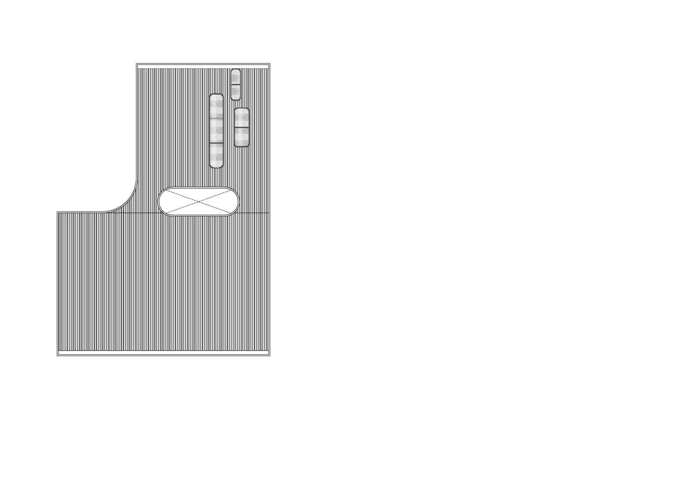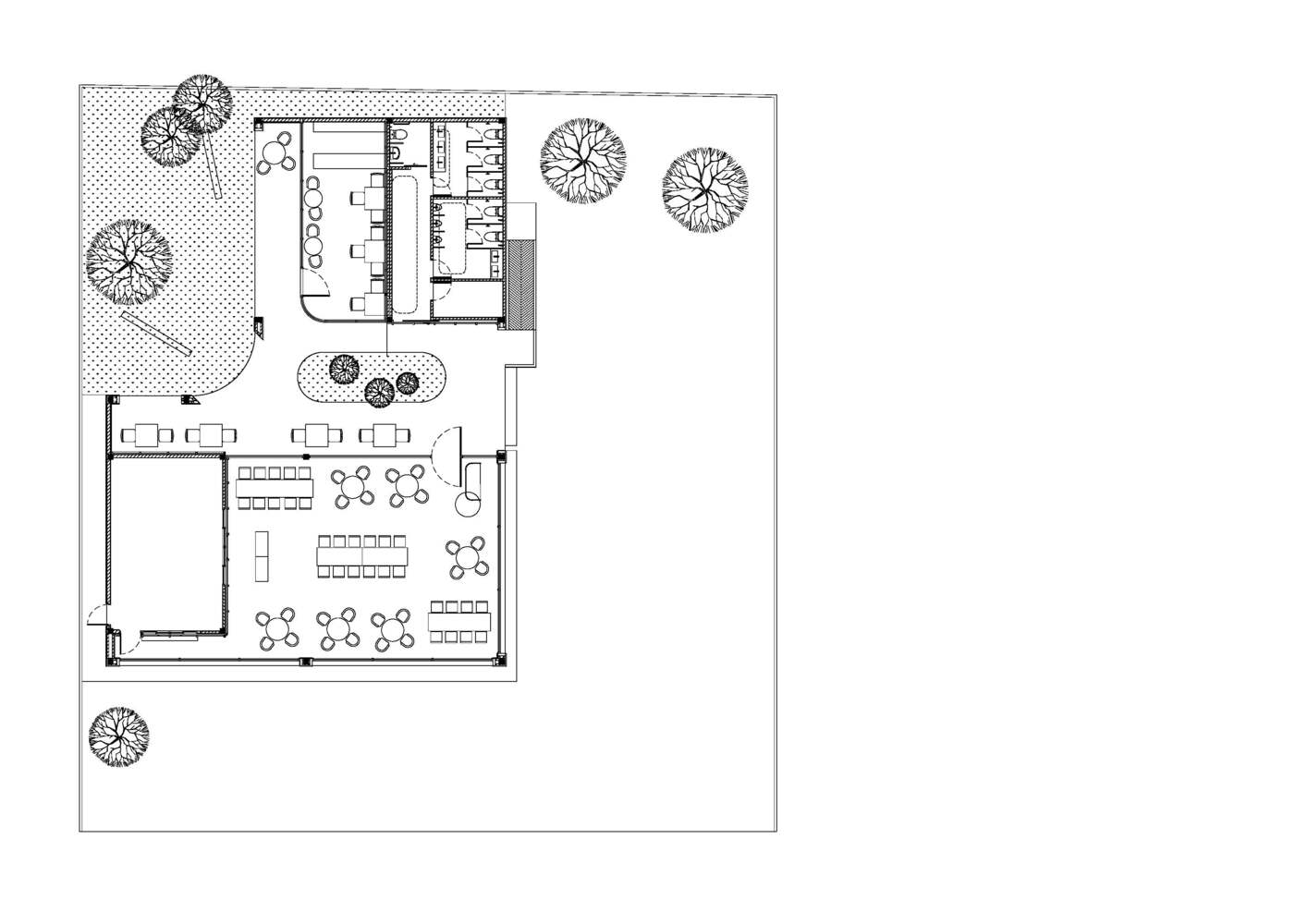 The 6-meter height building can be separated into two main parts by L's legs: the main restaurant with the kitchen and the cafe with all service areas, divided by the central semi-indoor courtyard from the main entrance. At the same time, both spaces can celebrate the view of the enclosed courtyard altogether— this courtyard can arrange small events.