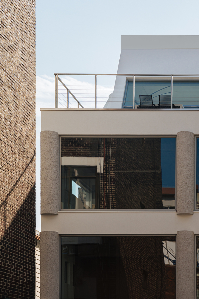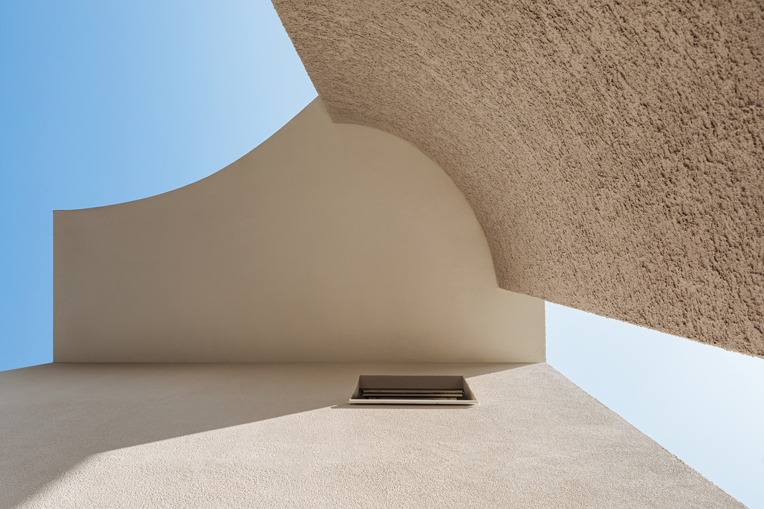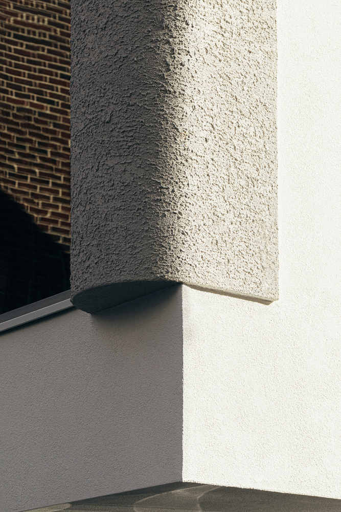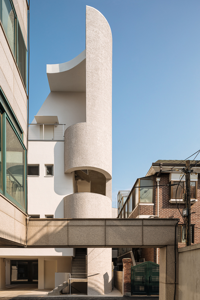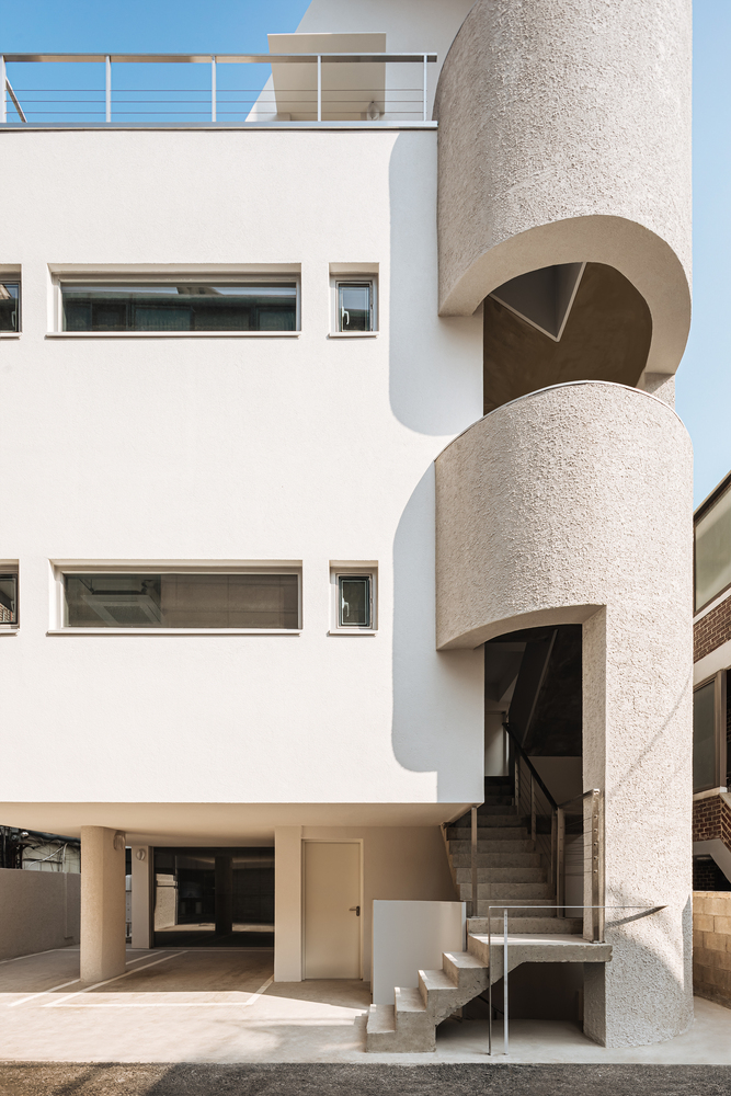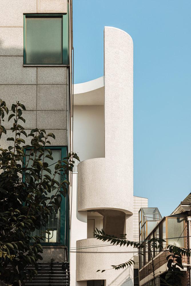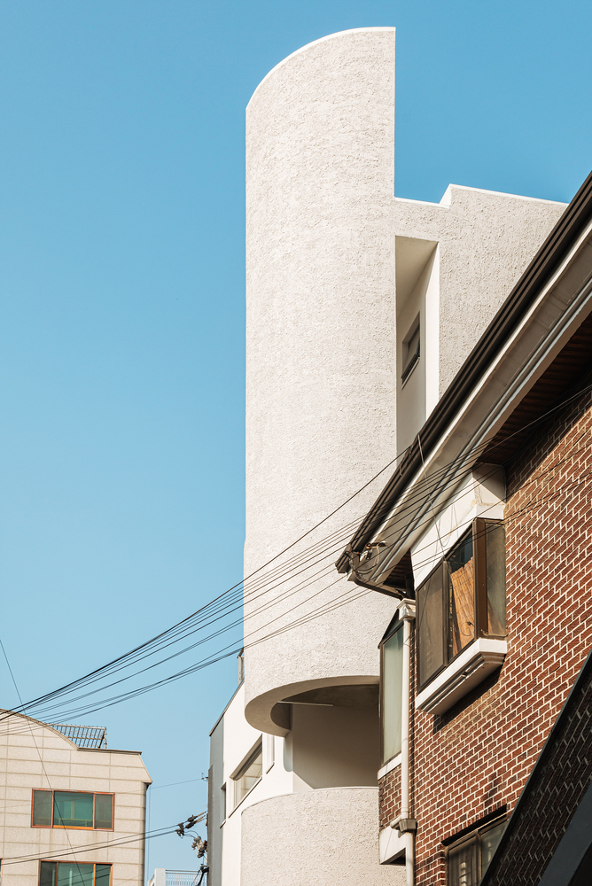 A flagpole for a flag: The staircase resembles a flagpole, rising above the roof and into the sky. We wanted the building to be symbolic, like the act of putting up a flag. The flagpole is rounded to wrap around the corners of the building, forming the outer skin of the staircase. The round shape of the flagpole became a design language, applied not only to the staircase but also to the shape of the columns that appear outside. The prominent semicircular shape was finished darker and rougher than the color and texture of the entire building.