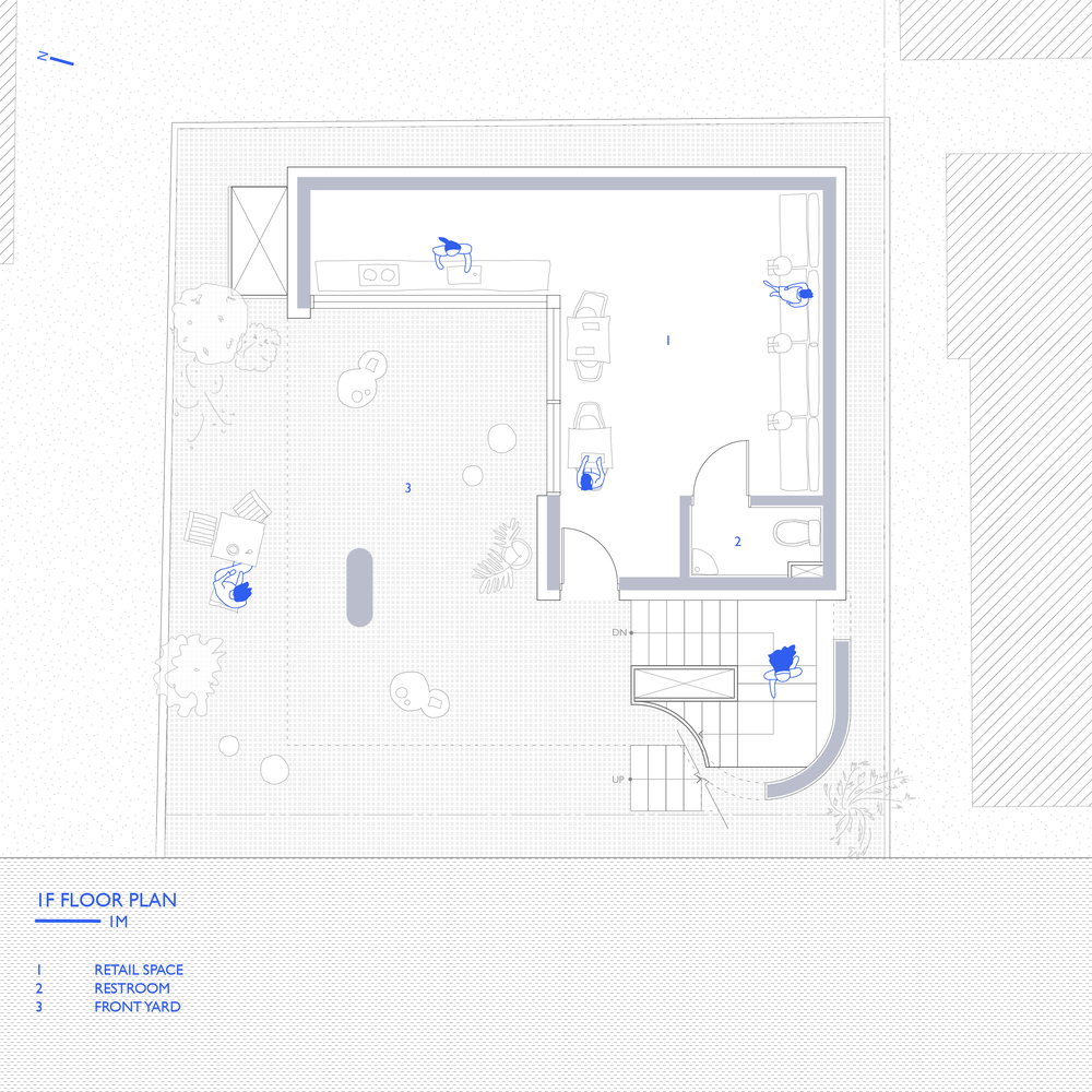 2 Design considering various positions - Common use space: entrance and stairs open to the outside: We made the process of entering the building and visiting the store an extension of the road. Sunlight comes in and the wind blows in the staircase that is open to the outside. You can see people going up and down, and when you are going up the stairs, you can see the sky through small holes in the staircase. The hallway connected to the staircase was planned wider than usual because we wanted it to be used like the small garden of stores. We hoped that it would be a promenade with a variety of things to see such as displaying products with decorations and plants, which is showing the characteristics of each store on each floor.