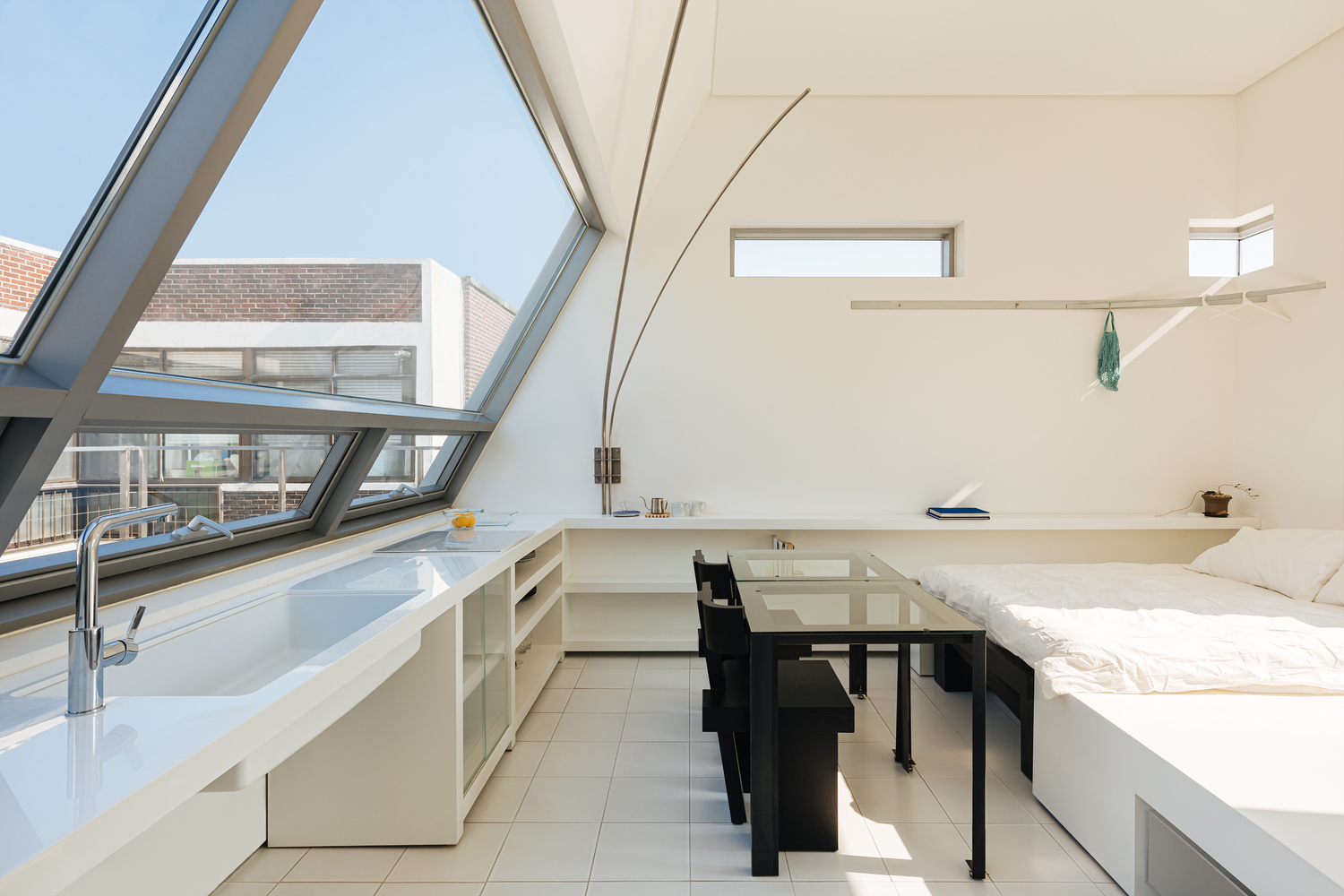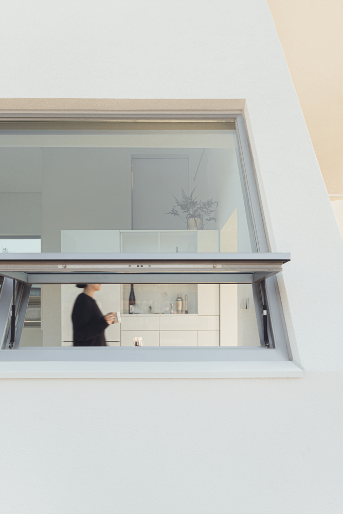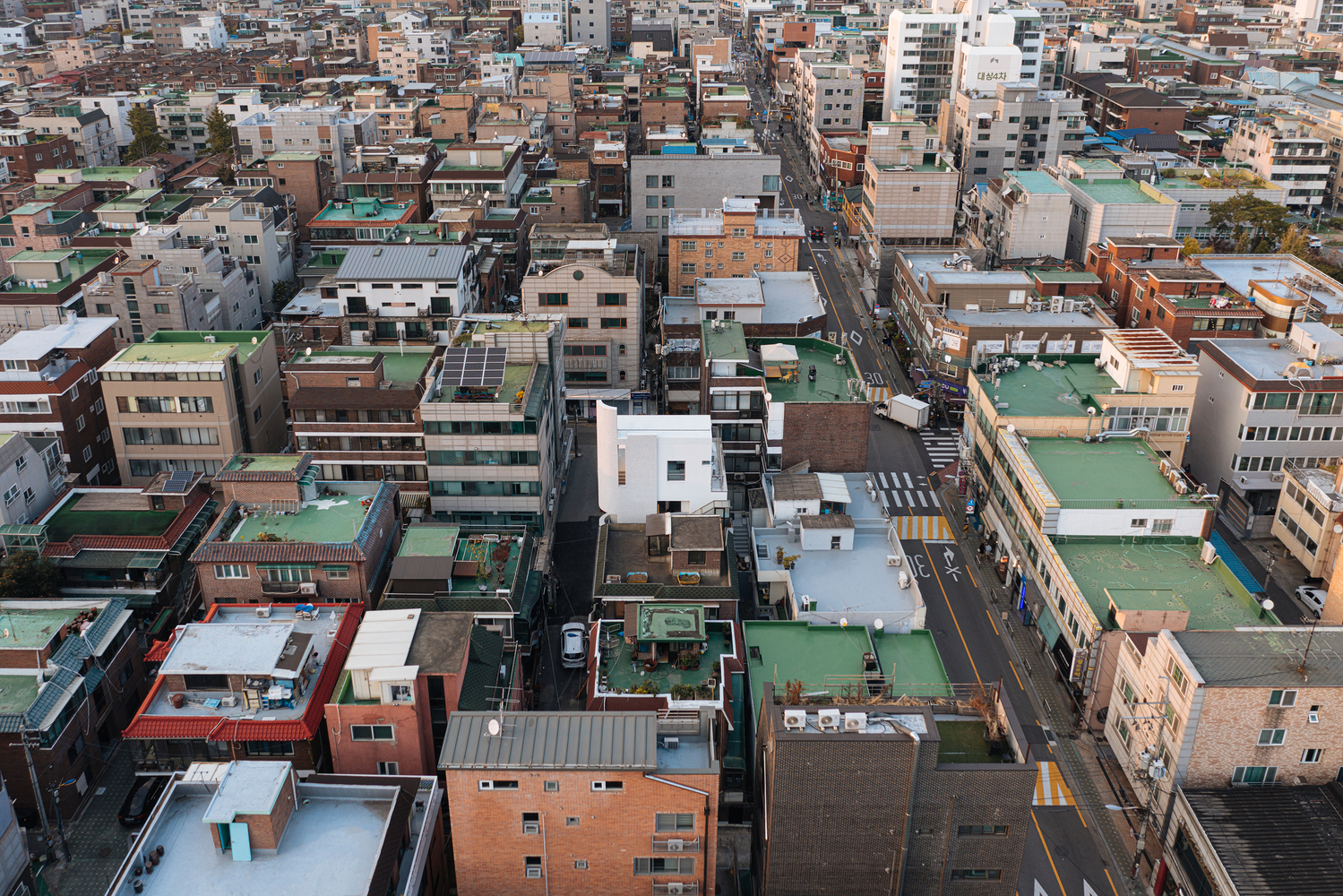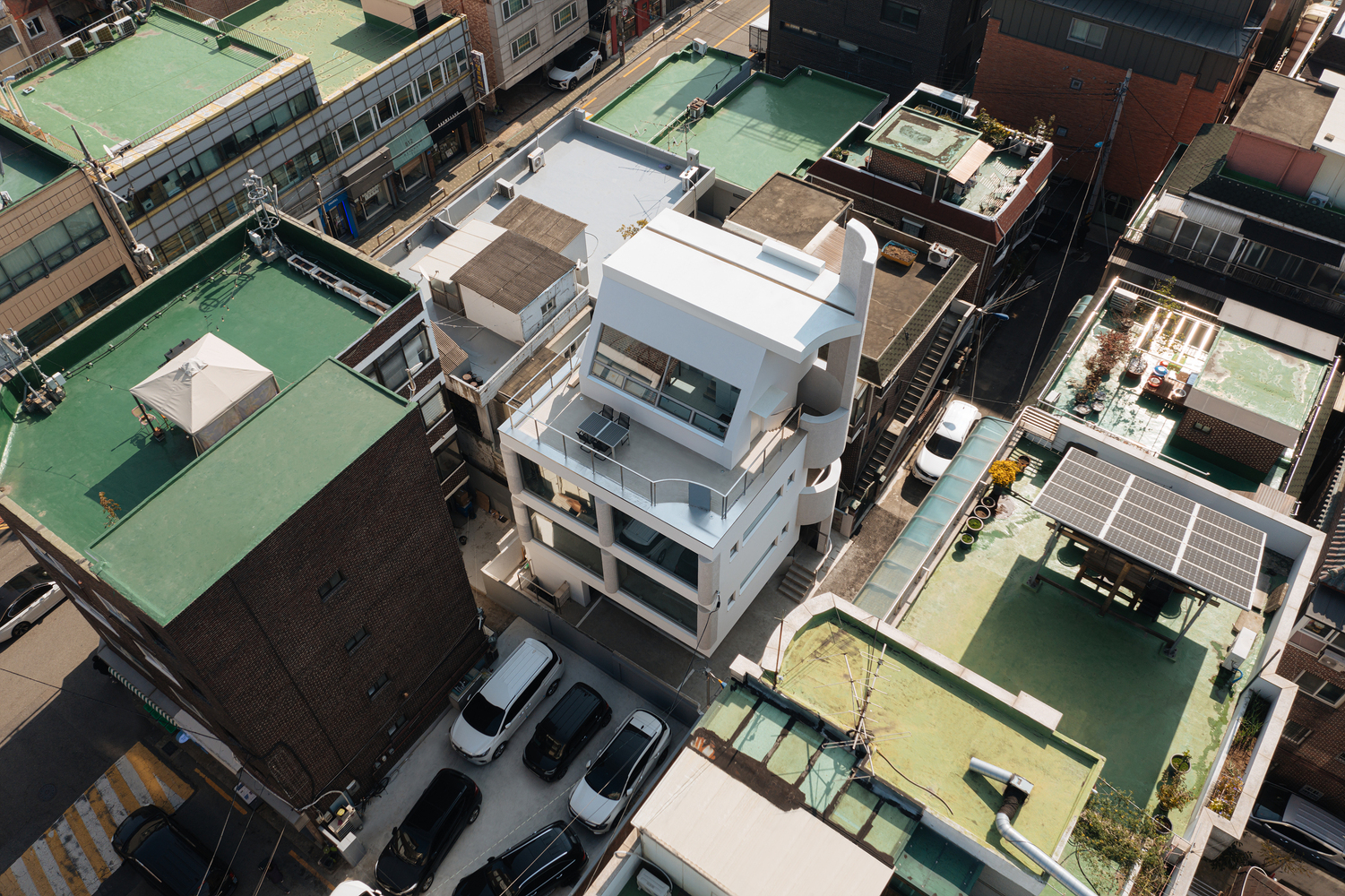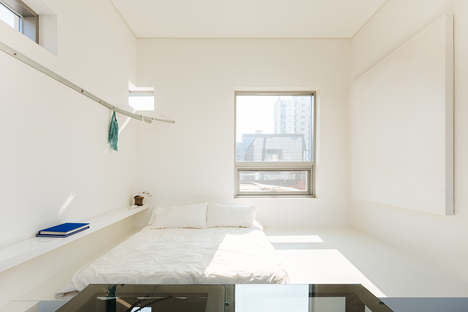 Composition of rental space: combine, separate, or use by ourselves: Mangwon is a town with many small shops. Shops facing Mangridangil are very small. Even 16-square-meter stores are common. There are many small places which are more famous than large spaces, so considering the demand we planned the 2nd and 3rd floors can be divided into two. During the design process, we decided to use the fourth floor ourselves which was cut due to the legal restriction. Although it is a small area of 30 square meters, there are windows on three sides, so it has a sense of openness. The cut side on the 4th floor is the north side but faces the terrace. A window on this side enables physical interaction between inside and outside, increasing convenience. Facing this window, we made a kitchen so that prepared food can be quickly delivered to the terrace for outdoor dining.