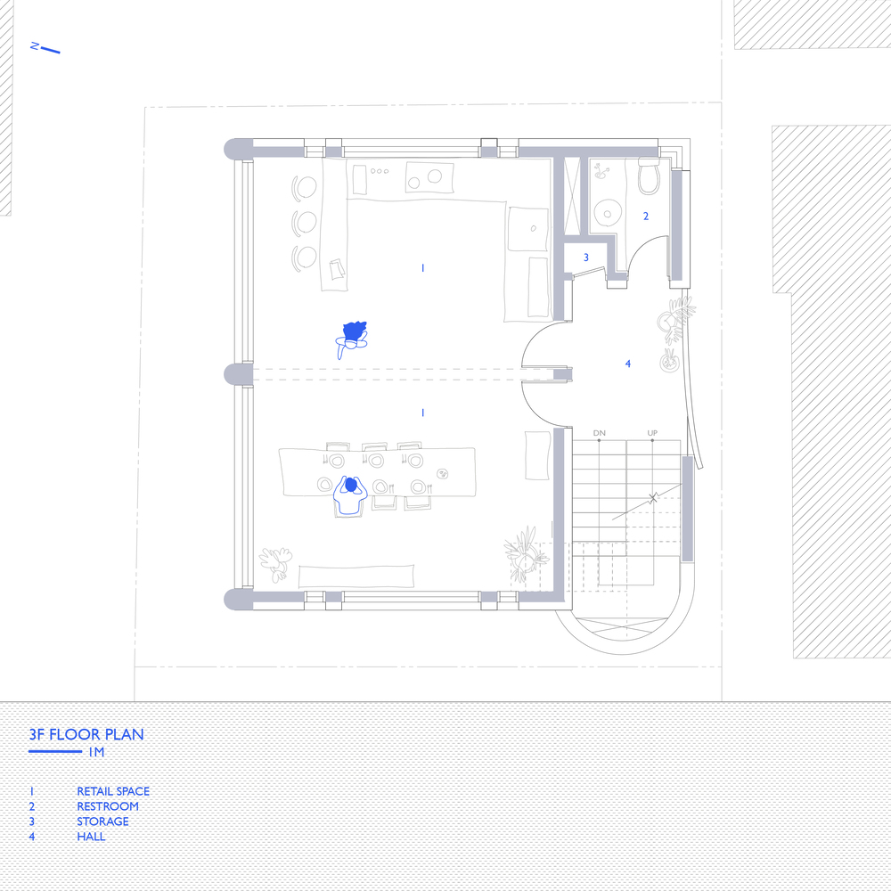 1 Commerciality under closer examination - The reason why the project started here in Mangwon : Visibility. We visited many places in various areas to find the right place, but Mangwon was the first place where all three partners agreed that it would be good. The reason why Mangwon caught our eye is that it has a distinctive feature from other commercial areas in Seoul. Mangwon has the Mangwon Market(a famous traditional market). Just like shops in Mangwon Market, small shops line up on the street which is called mangridangil. As it is a residential area, Mangwon is always crowded even on weekdays. On weekends, visitors come to look around the area known as manridangil. The commercial building, we developed and designed “Reikis” is located on the back side of the road leading from Mangwon Market. However, it is right next to the parking lot of another building, so Reikis is immediately visible on a big road. As it is more recognizable on the big road than on the adjacent road, the elevation on the big roadside is designed as the main elevation of the building and full-wide windows are installed on this side. Through the large windows, customers will feel the space is larger than it is, and people on the street outside can see the inside of the stores with curiosity. You can see people choosing items or sitting at a table and eating, and if it is a gallery, you can see the artwork through the window. In fact, it is currently attracting the attention of people passing through the big road.