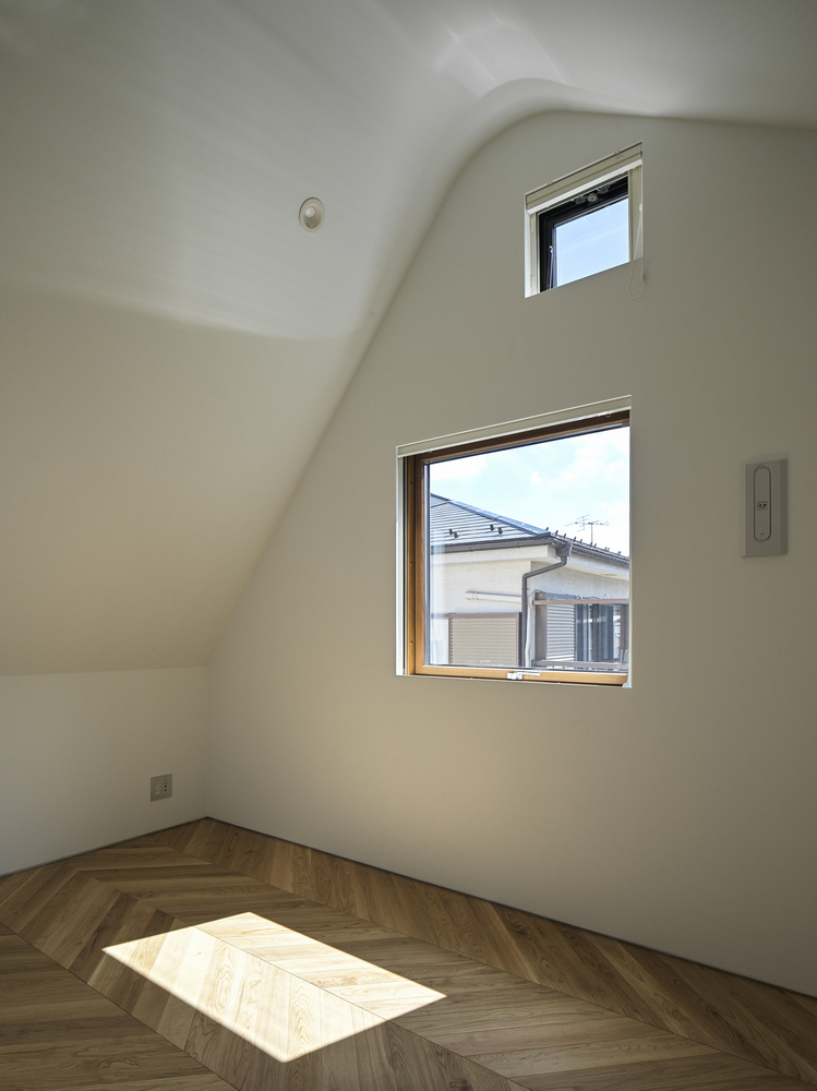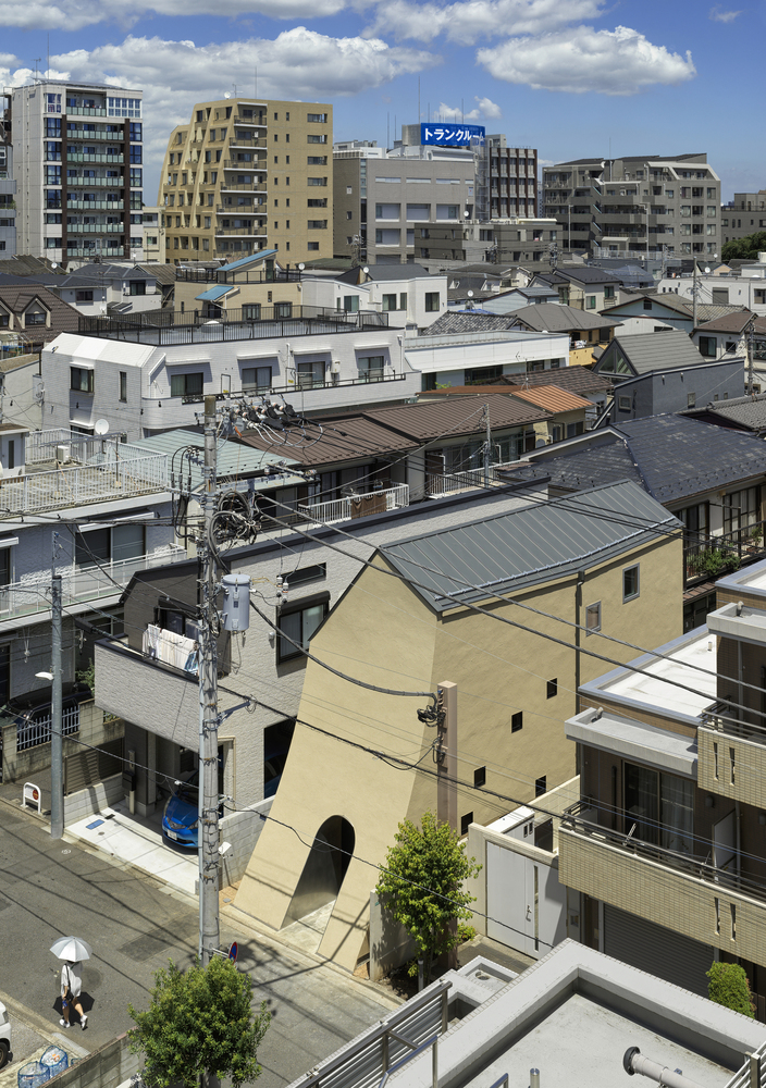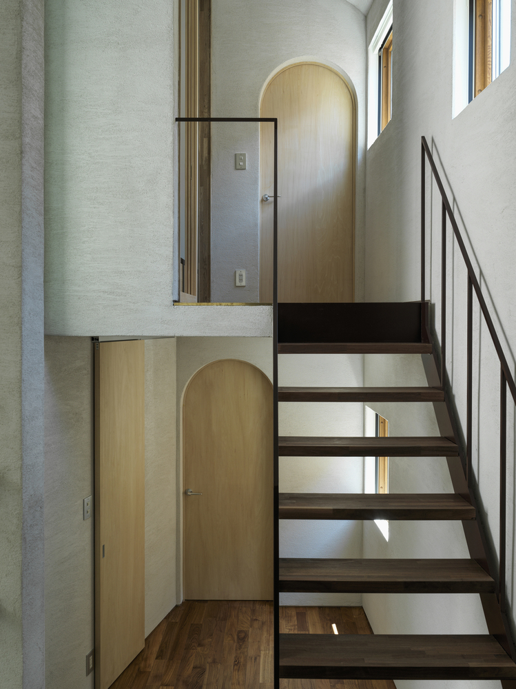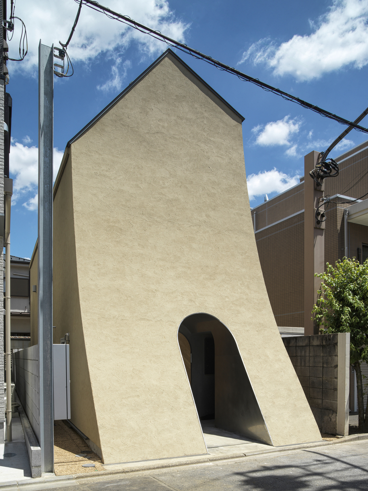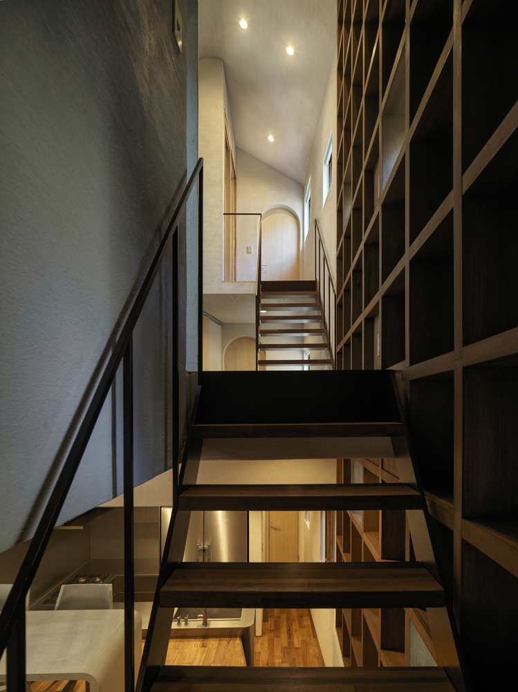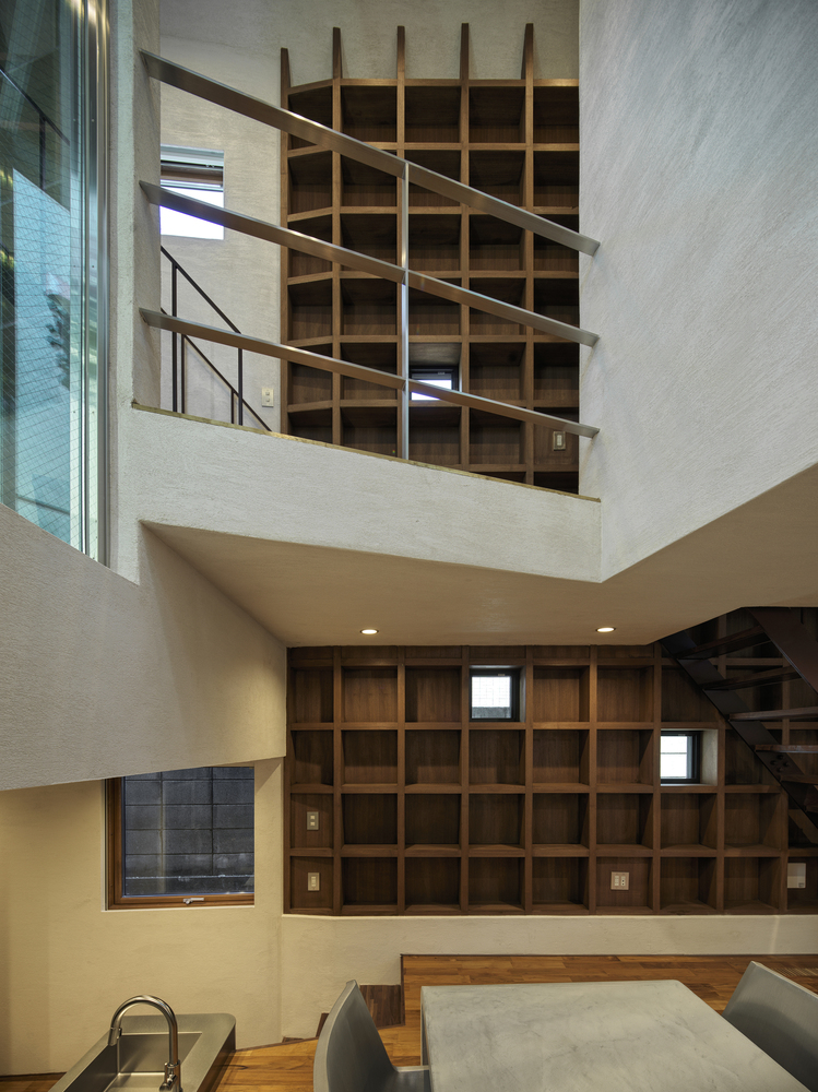 The project began by selecting a plot closely linked to manga artists. The west facade facing the front road is designed as a warped seismic wall evoking earth rising dynamically from the ground, with a tunnel penetrating the wall leading to the entrance. The opening in the solid wall invites visitors to step out from their ordinary and into the extraordinary, evoking a scene in a movie. The overall plan is designed to maximize the narrow and long plot of land, comprising the east area with three-floor levels at the rear of the site and the west area with two-floor levels to create a split-level floor plan. The architect rearranged the sequence of alternating split levels and created substantial differences in elevation. A light court (1.2 m wide, 5.5 m maximum height) is provided on the north side of the house, and the number of other openings was limited as much as possible to create a contrast between light and dark in a “void” spreading throughout the house like an amoeba. A stairway runs up through the void space filled with contrasts of high/low and light/dark, making a three-dimensional composition that evokes a narrative experienced through the body.