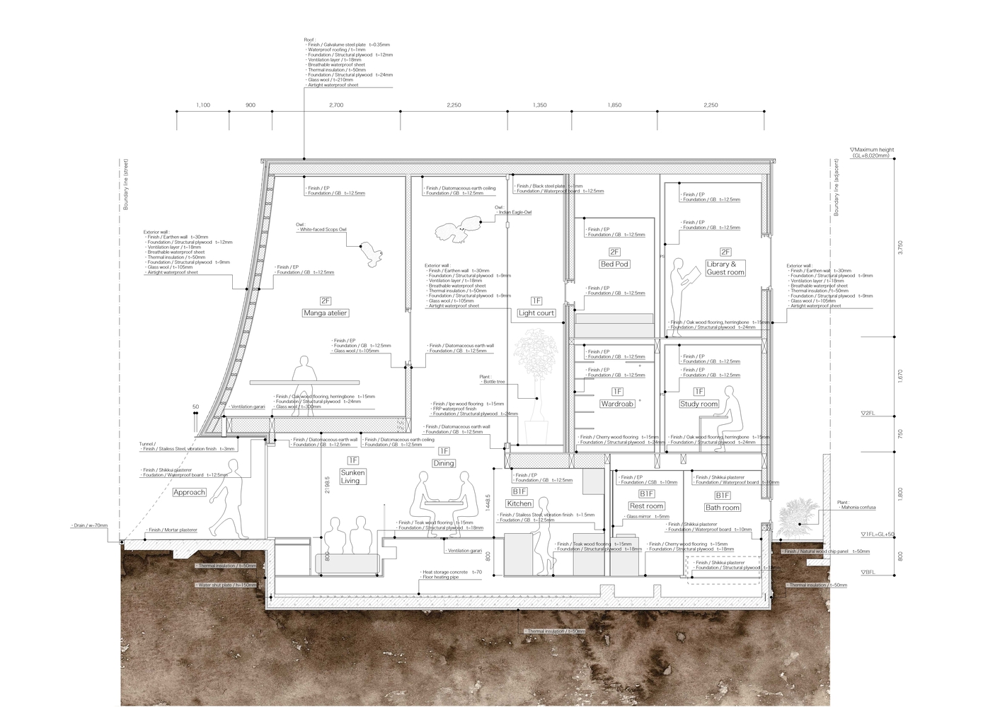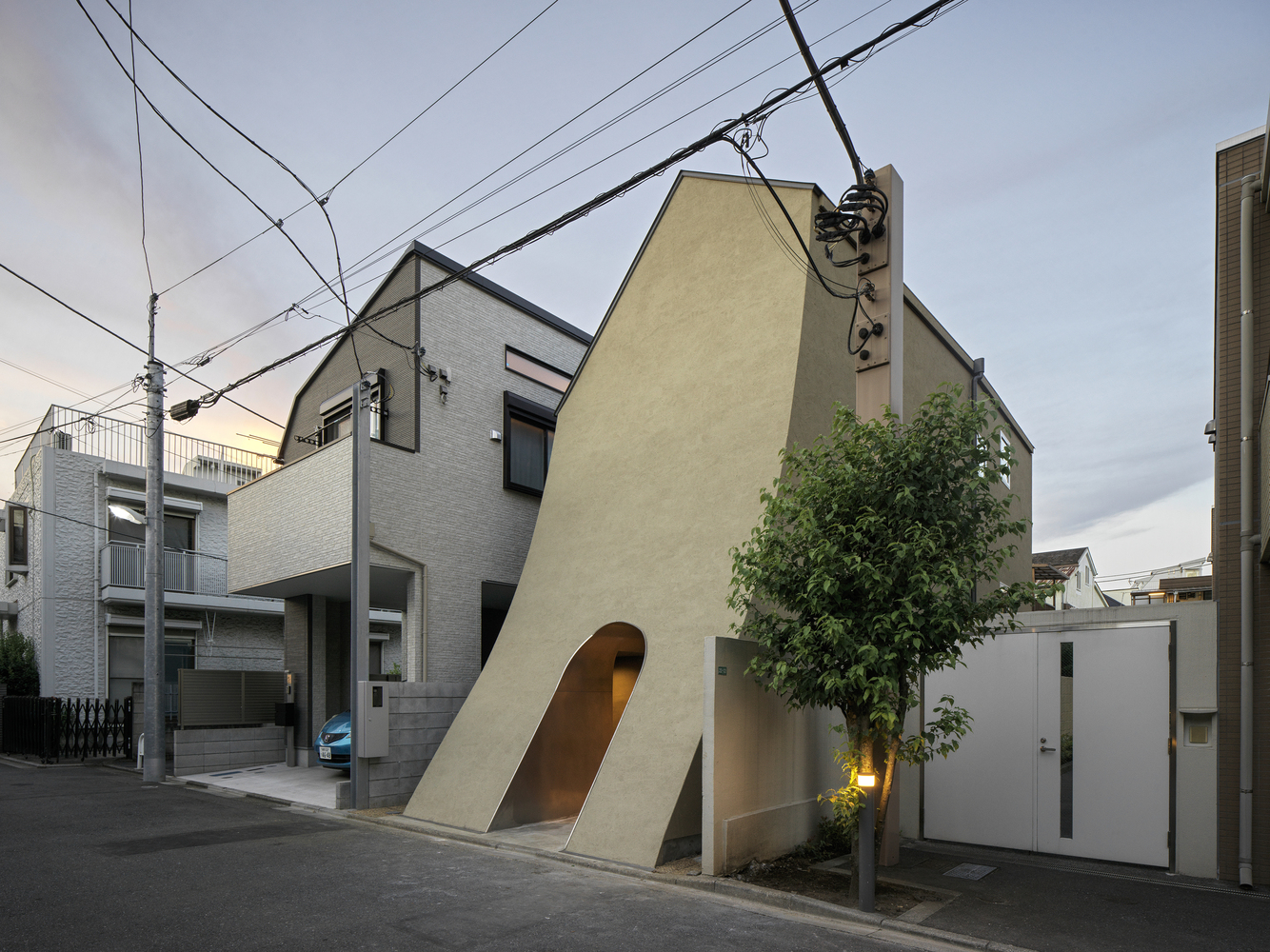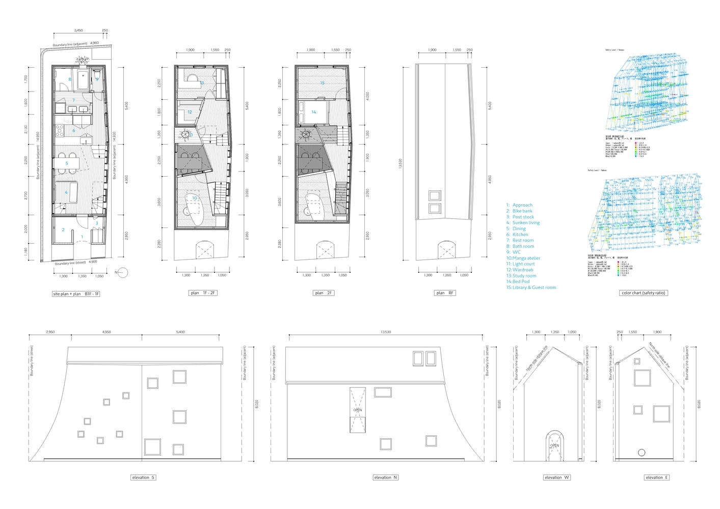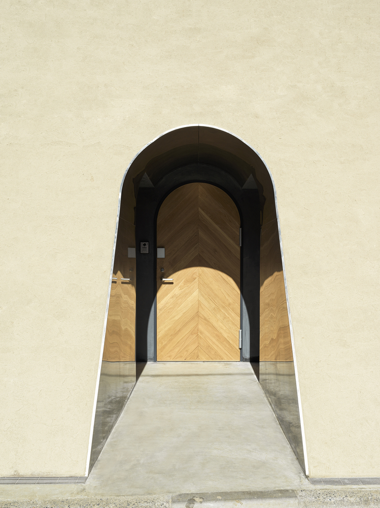 The project began by selecting a plot closely linked to manga artists. The west facade facing the front road is designed as a warped seismic wall evoking earth rising dynamically from the ground, with a tunnel penetrating the wall leading to the entrance. The opening in the solid wall invites visitors to step out from their ordinary and into the extraordinary, evoking a scene in a movie. The overall plan is designed to maximize the narrow and long plot of land, comprising the east area with three-floor levels at the rear of the site and the west area with two-floor levels to create a split-level floor plan. The architect rearranged the sequence of alternating split levels and created substantial differences in elevation. A light court (1.2 m wide, 5.5 m maximum height) is provided on the north side of the house, and the number of other openings was limited as much as possible to create a contrast between light and dark in a “void” spreading throughout the house like an amoeba. A stairway runs up through the void space filled with contrasts of high/low and light/dark, making a three-dimensional composition that evokes a narrative experienced through the body.