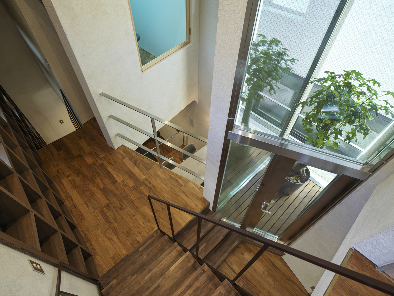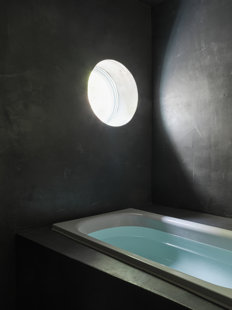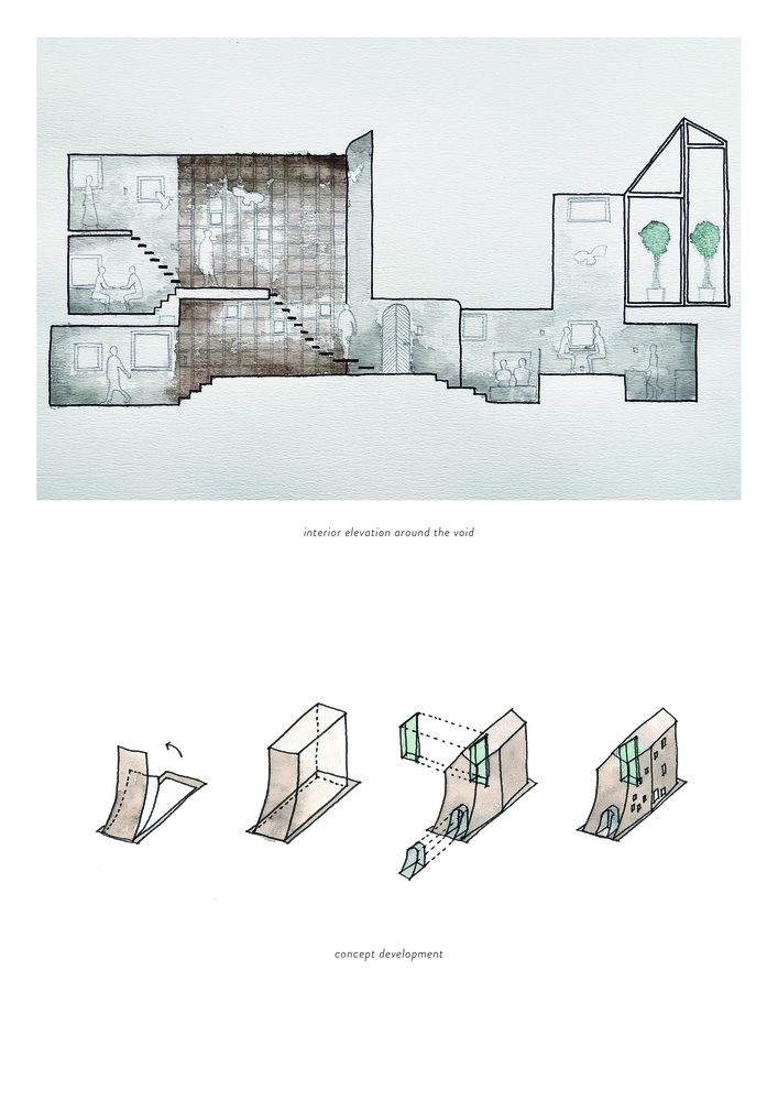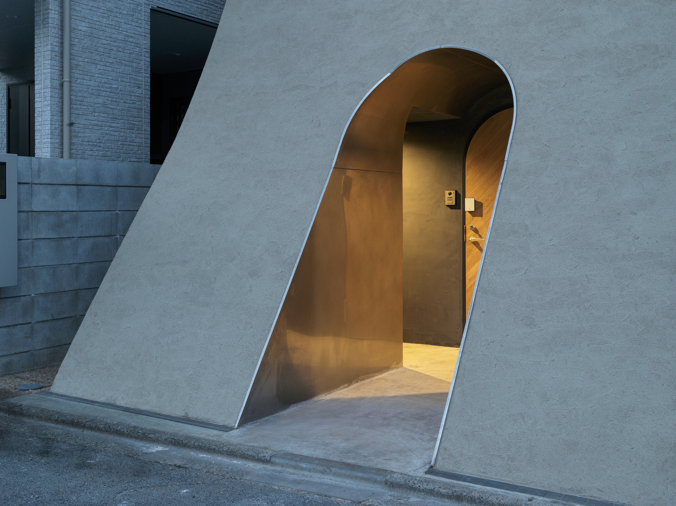 The project began by selecting a plot closely linked to manga artists. The west facade facing the front road is designed as a warped seismic wall evoking earth rising dynamically from the ground, with a tunnel penetrating the wall leading to the entrance. The opening in the solid wall invites visitors to step out from their ordinary and into the extraordinary, evoking a scene in a movie. The overall plan is designed to maximize the narrow and long plot of land, comprising the east area with three-floor levels at the rear of the site and the west area with two-floor levels to create a split-level floor plan. The architect rearranged the sequence of alternating split levels and created substantial differences in elevation. A light court (1.2 m wide, 5.5 m maximum height) is provided on the north side of the house, and the number of other openings was limited as much as possible to create a contrast between light and dark in a “void” spreading throughout the house like an amoeba. A stairway runs up through the void space filled with contrasts of high/low and light/dark, making a three-dimensional composition that evokes a narrative experienced through the body.