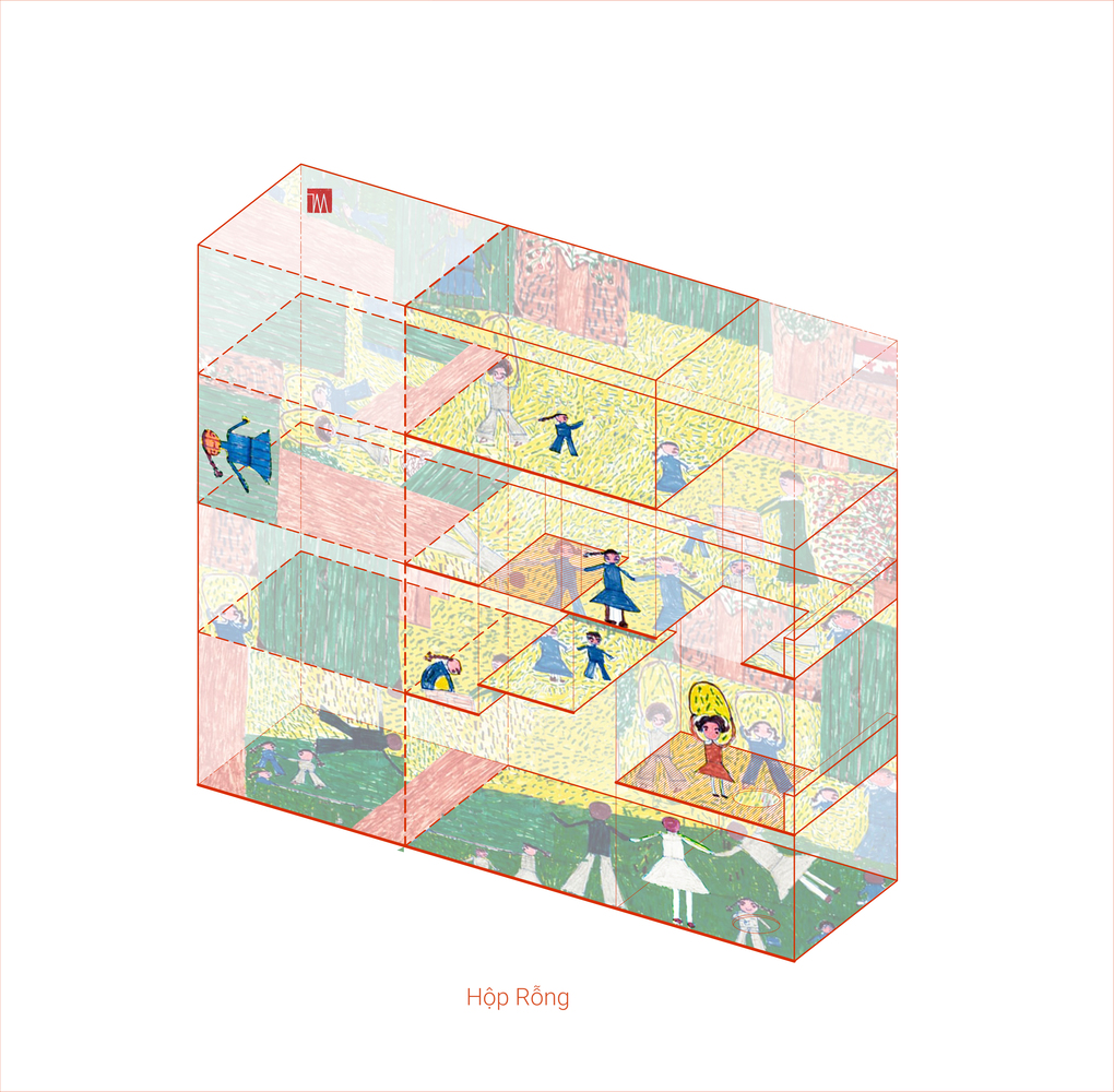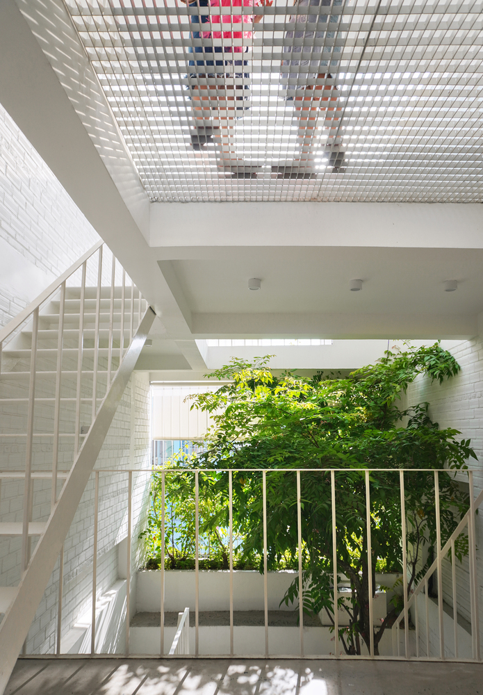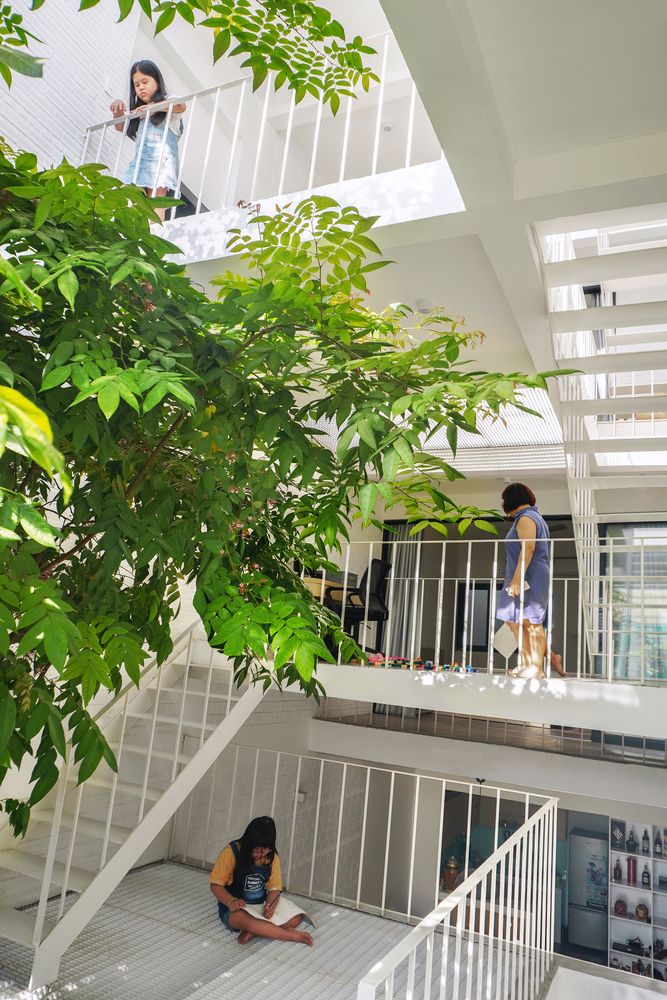 The "Empty Box" contains a playing ground filled with nature such as light, trees, and wind. The method of raising and lowering the floor creates staggered floors and every corner of the house is connected view with a big green tree. Playing spaces of the children connect to the parents' workspace and bedroom, the atmosphere filled with sunlight and birdsong. Hollow iron floor material helps light and wind easy ventilation from the roof to the ground floor.