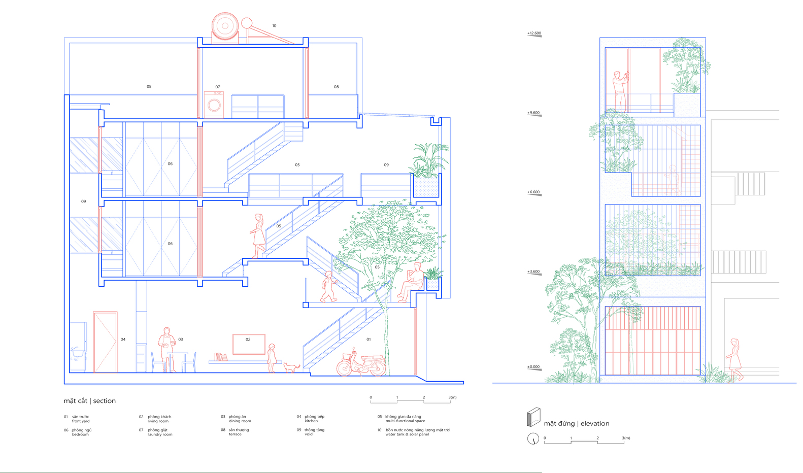 이 프로젝트는 호치민시의 혼잡한 도시 지역에 사는 젊은 가족들에게 생활 공간의 질을 향상시킵니다. 놀이 공간, 아이들을 위한 공부 공간, 부모님의 작업 공간, 야채 정원 등을 갖춘 밝고 나무가 우거진 집으로 - 천연 환기를 갖춘 집입니다.