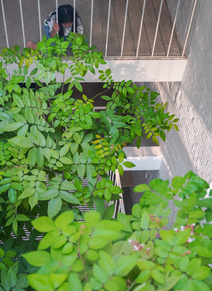 집의 구조는 각 층 앞에 놀이터에 부착되어 있으며, 내부 공간은 뒷부분의 1/3이 침실, 화장실 및 부엌이고, 앞쪽 2/3은 천연 조명과 나무가 있는 다기능 놀이터와 공부 공간으로 구성되어 있으며, 서로 연결된 구역입니다."빈 박스"에는 빛, 나무, 바람과 같은 자연이 가득한 놀이터가 있습니다. 바닥을 올리고 내리는 방식으로 단계적인 층을 만들어 집의 모든 구석이 큰 녹색 나무와 연결되어 있습니다. 아이들의 놀이 공간은 부모님의 작업 공간과 침실과 연결되어 있으며, 태양과 새소리가 가득한 분위기입니다. 중공 철 바닥재는 지붕에서 1층까지 쉽게 환기되도록 도와줍니다.