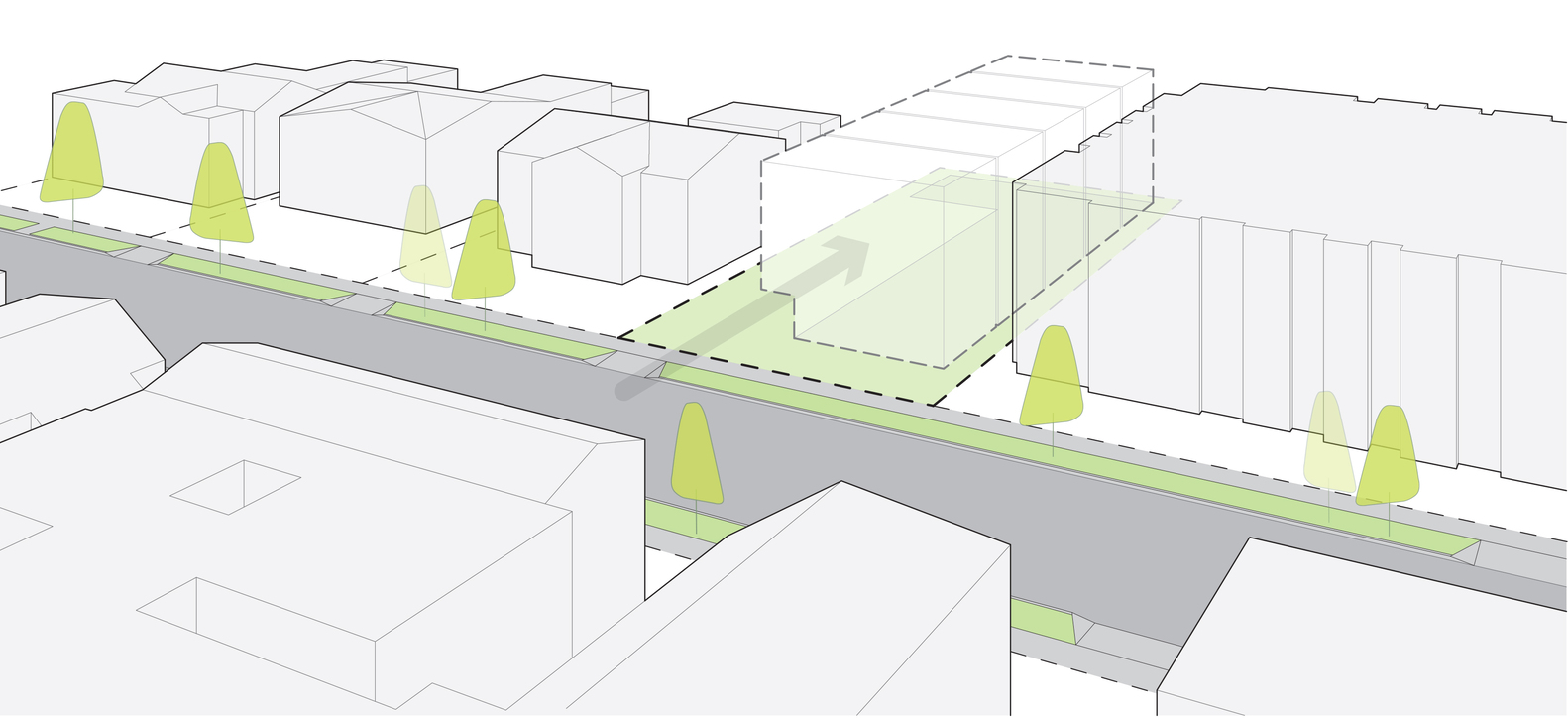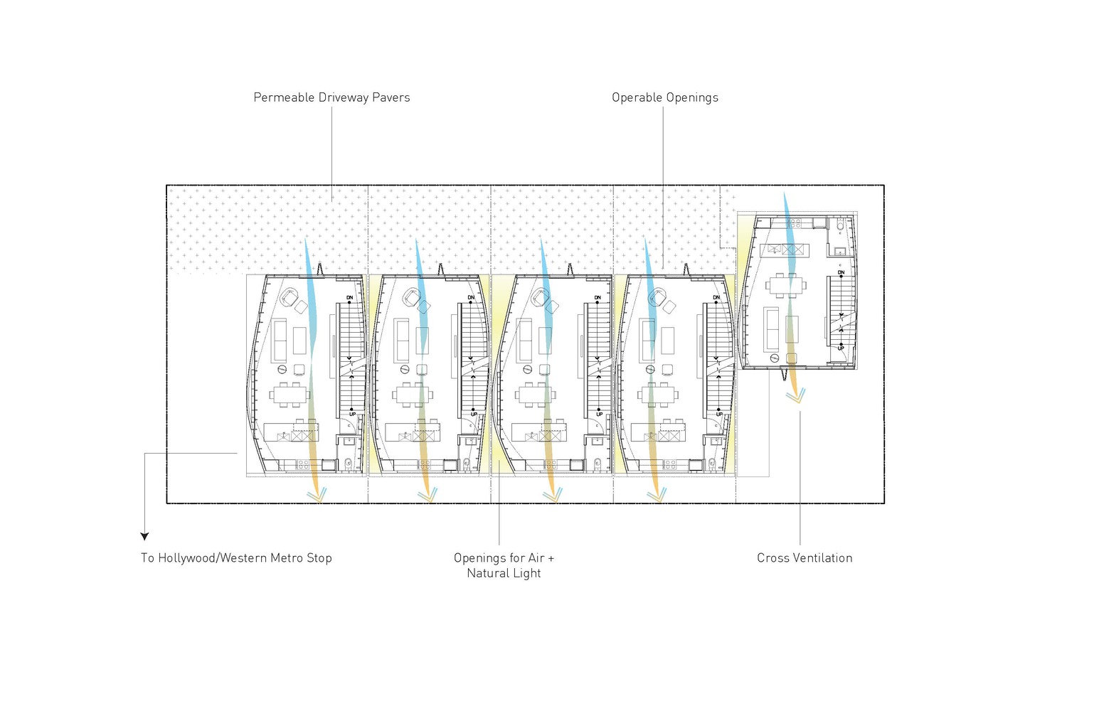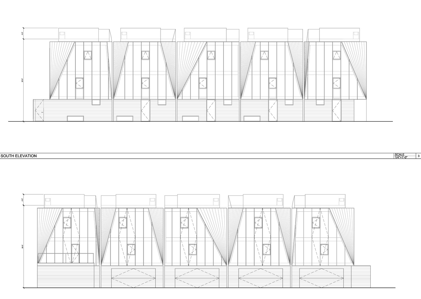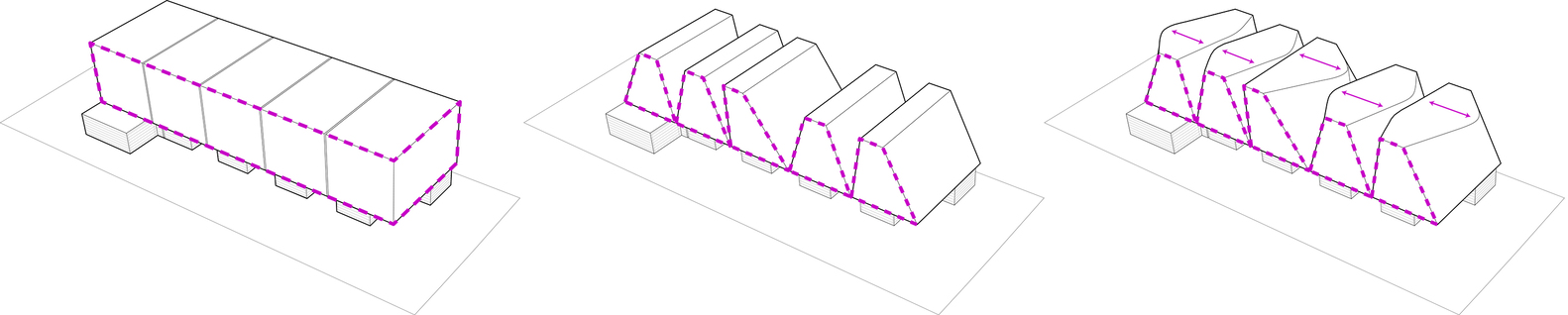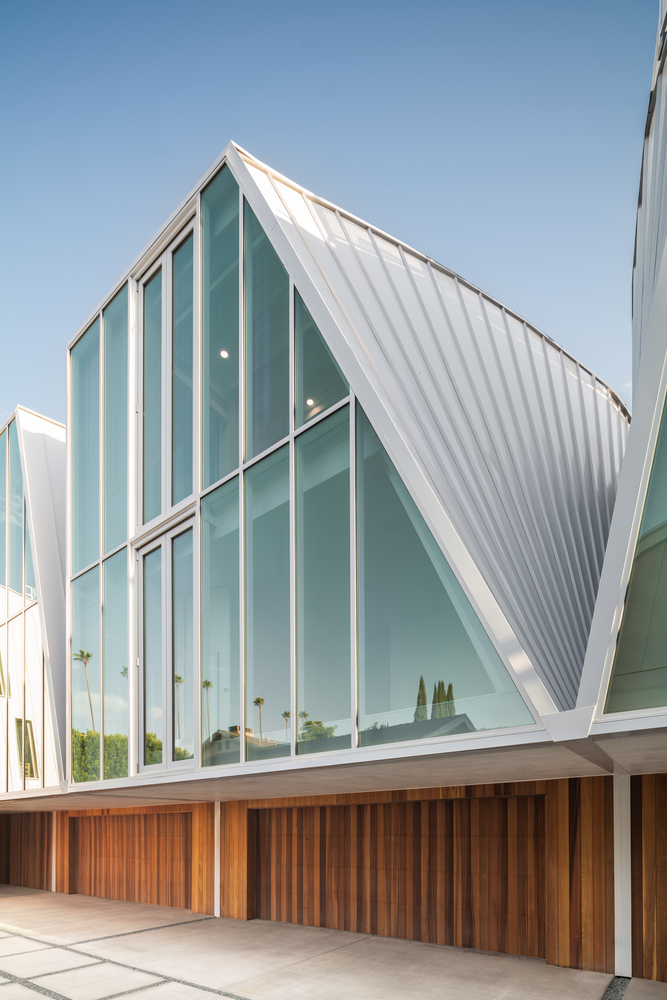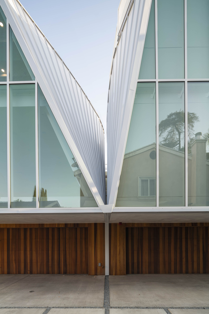 From their initial A-frame-like shapes, the volumes are expanded at their centers to maximize usable square footage while maintaining the angular end facades. This injects a sense of the individuality of single-family homes, missing from many small lot subdivision developments.