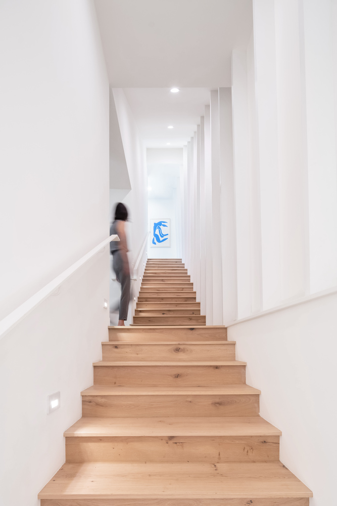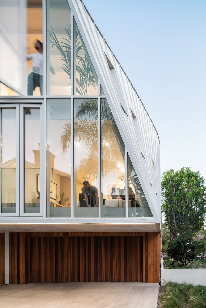 곡선 모양은 각도 있는 벽 보드와 패널화된 시스템을 통해 달성됩니다. 이는 간단한 프레임 전략입니다. 목조 프레임은 내부적으로 표현되어 전반적인 기하학적 모양이 집 안에서도 알아볼 수 있습니다. 차고로 사용되는 2대 차를 수용하는 1층은 삼나무로 코팅되어 있고, 가벼운 상층은 알루미늄 패널과 스토어 프론트 유리로 구성됩니다. 이러한 소재 선택은 자연적인 빛을 거실로 스며들게 하지만 인근 건물에 가까이 지을 때 필수적인 프라이버시를 유지합니다.