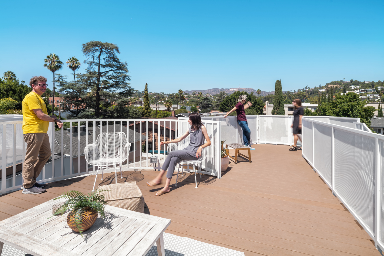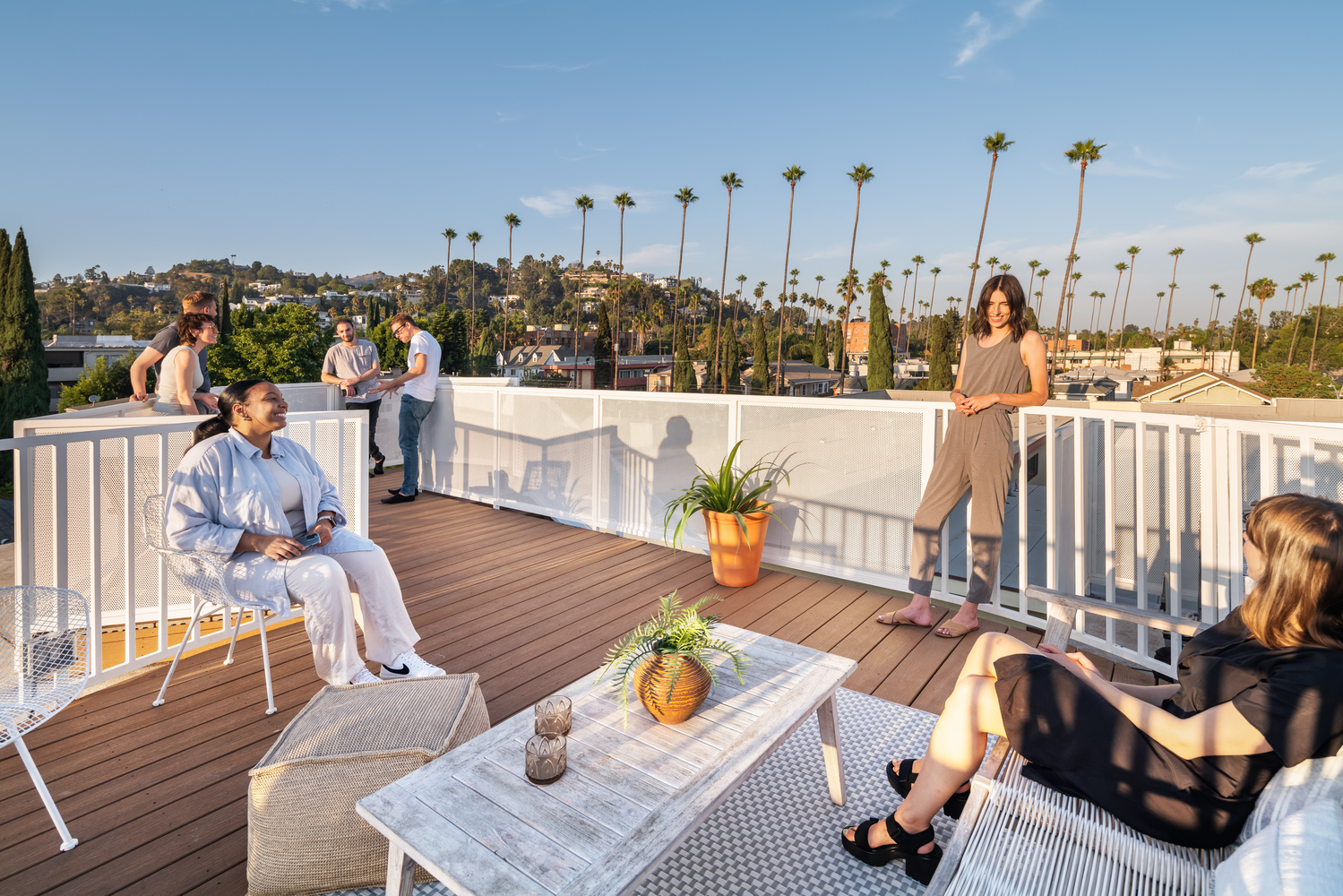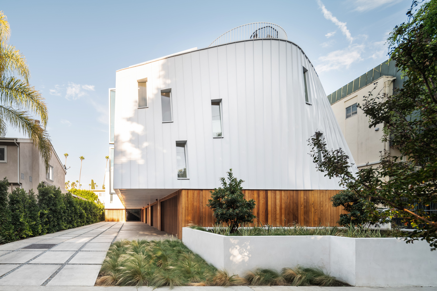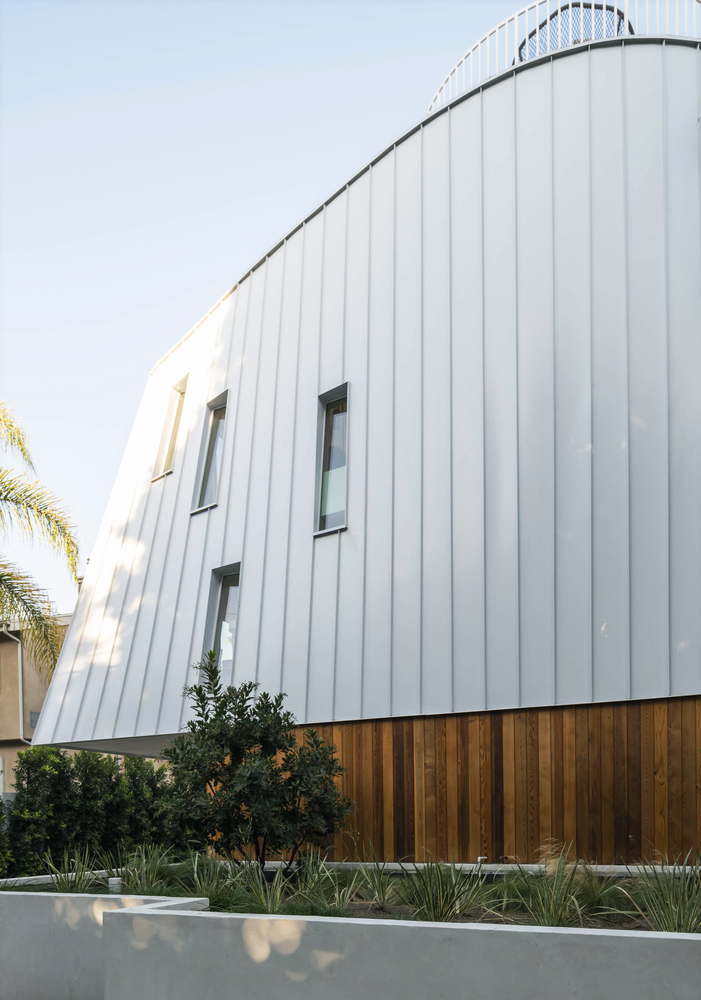 The curving, almost nautical forms are achieved through angled wall studs and panelized systems: a simple framing strategy. The wood framing is expressed internally so the overall geometry is legible inside the home. The cedar-clad first floor for the two-car garages contrasts the light upper units, which are composed of aluminum panels and storefront glazing. These material choices filter natural light into the living areas but maintain privacy, essential when building close to other properties. Replacing the traditional backyard, the design of each house incorporates a roof deck to create access to more outdoor space.