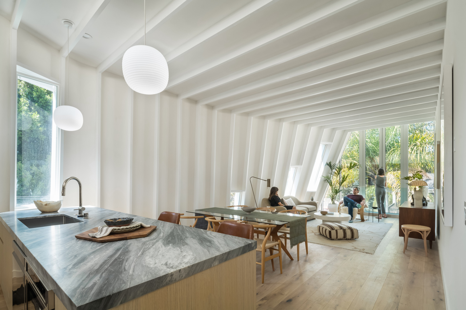 초기 A 프레임 모양에서 시작된 이 볼륨들은 중심에서 확장하여 사용 가능한 평방 피트를 최대화하면서 각도 있는 종단 파사드를 유지합니다. 이를 통해 다른 소형 부지 분양 개발에서 빠진 단일 가정의 개성을 살릴 수 있습니다.