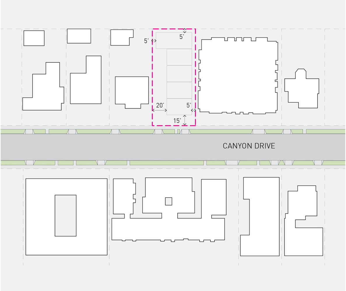 Located just south of LA’s Beachwood Canyon, our Canyon5 project examines the small lot subdivision typology by taking advantage of its efficiencies of footprint and density while creating unique homes filled with light and air. Starting from the maximum allowable envelope, the single mass is divided by tilting the exterior walls away from the lot lines at different angles to define the individual homes and create opportunities for solar exposure and natural ventilation.