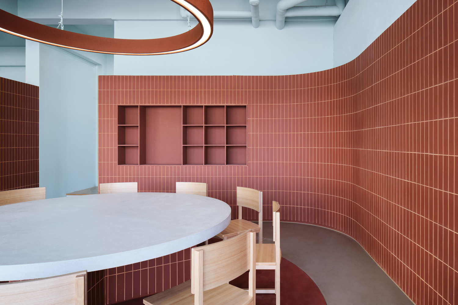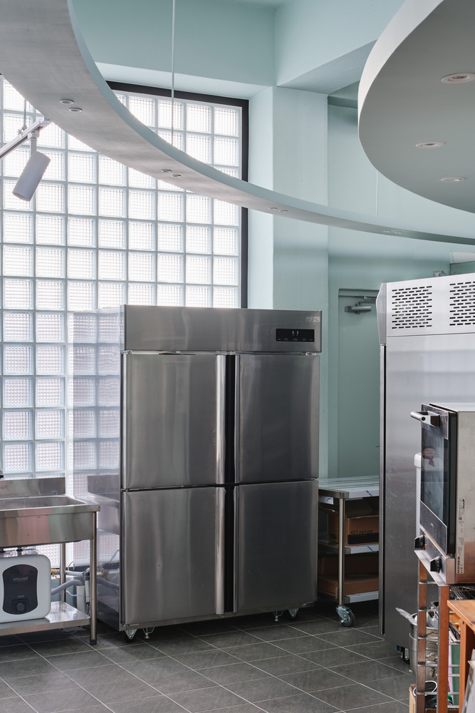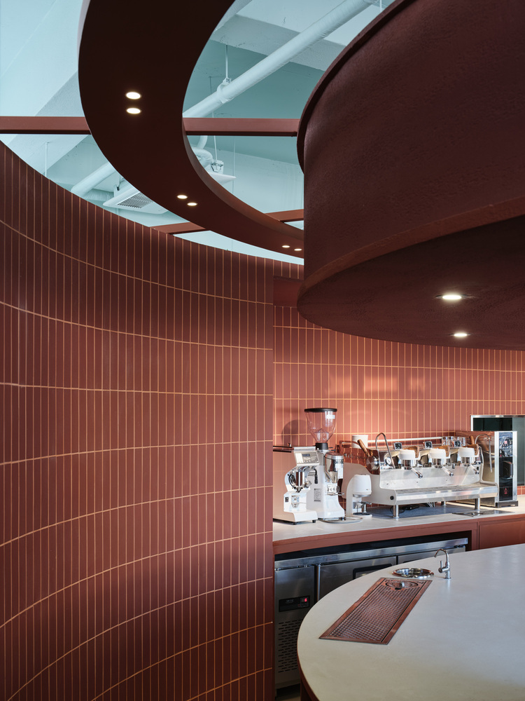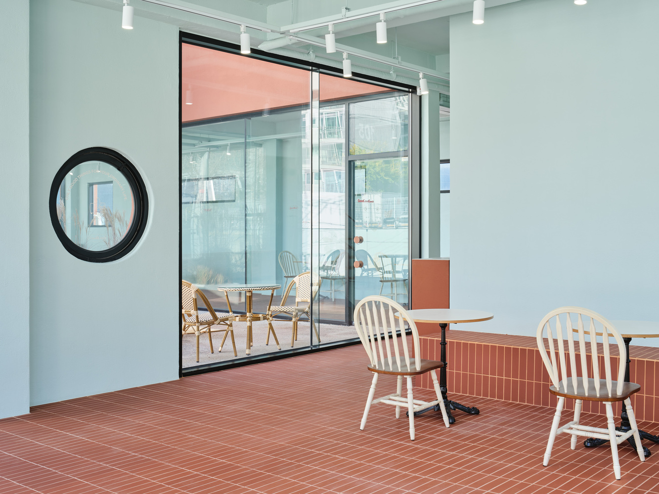 아침식사 카페의 특성상 일반 카페와 달리 넓은 주방 공간이 필요하다는 고객의 의견을 반영하여 기능적으로 배치되었으며, 테라코타 벽돌 타일 마감은 일관된 느낌의 대량성을 강조하기 위해 의도되었습니다.