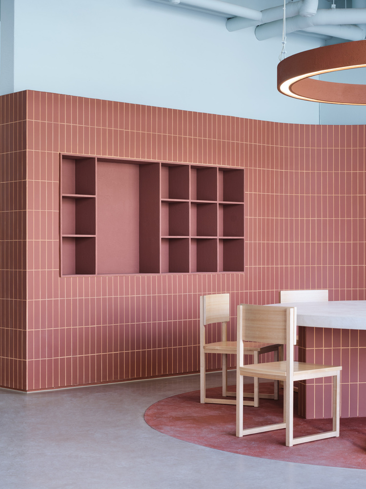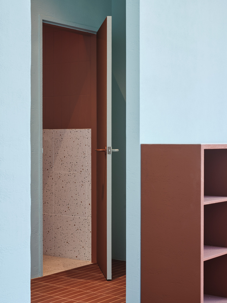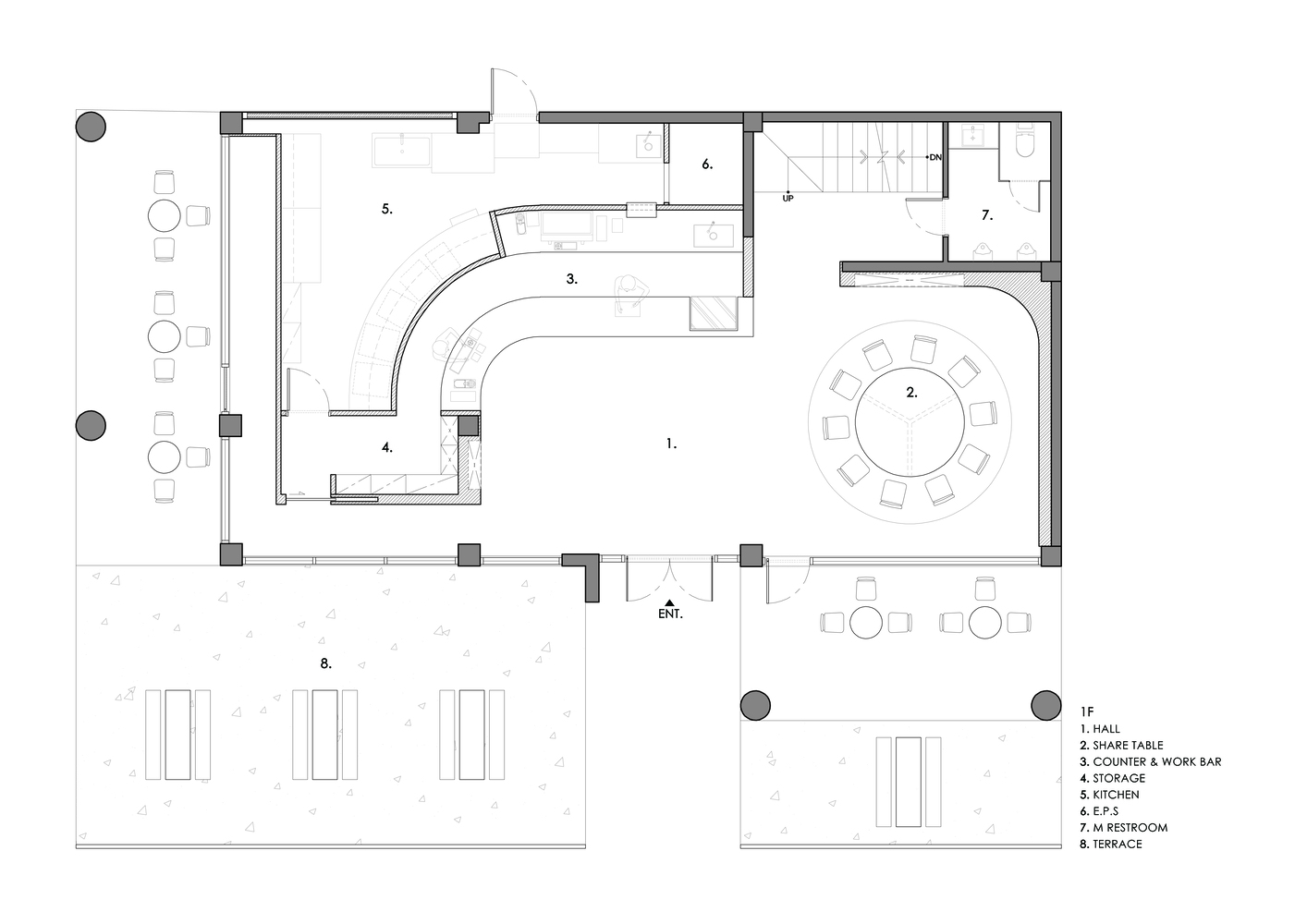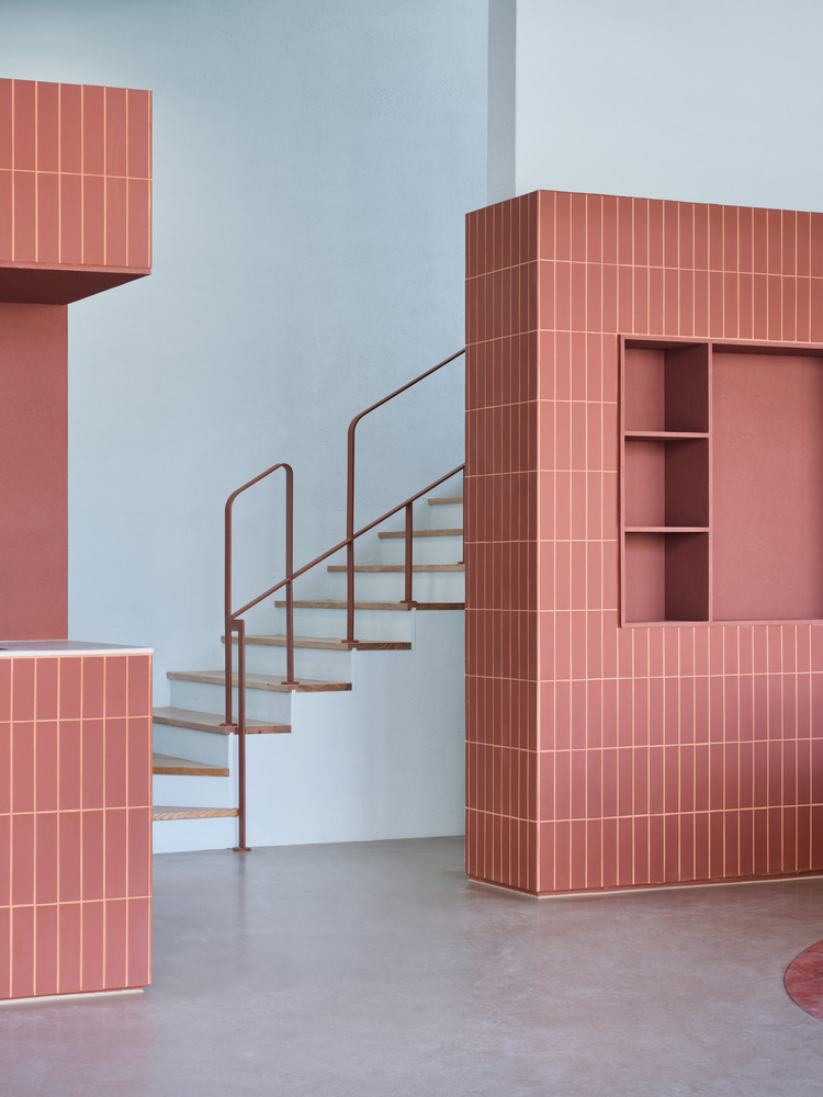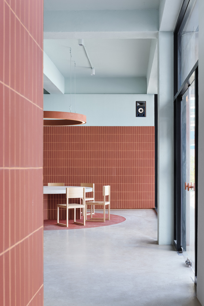 아침식사 카페의 특성상 일반 카페와 달리 넓은 주방 공간이 필요하다는 고객의 의견을 반영하여 기능적으로 배치되었으며, 테라코타 벽돌 타일 마감은 일관된 느낌의 대량성을 강조하기 위해 의도되었습니다.
