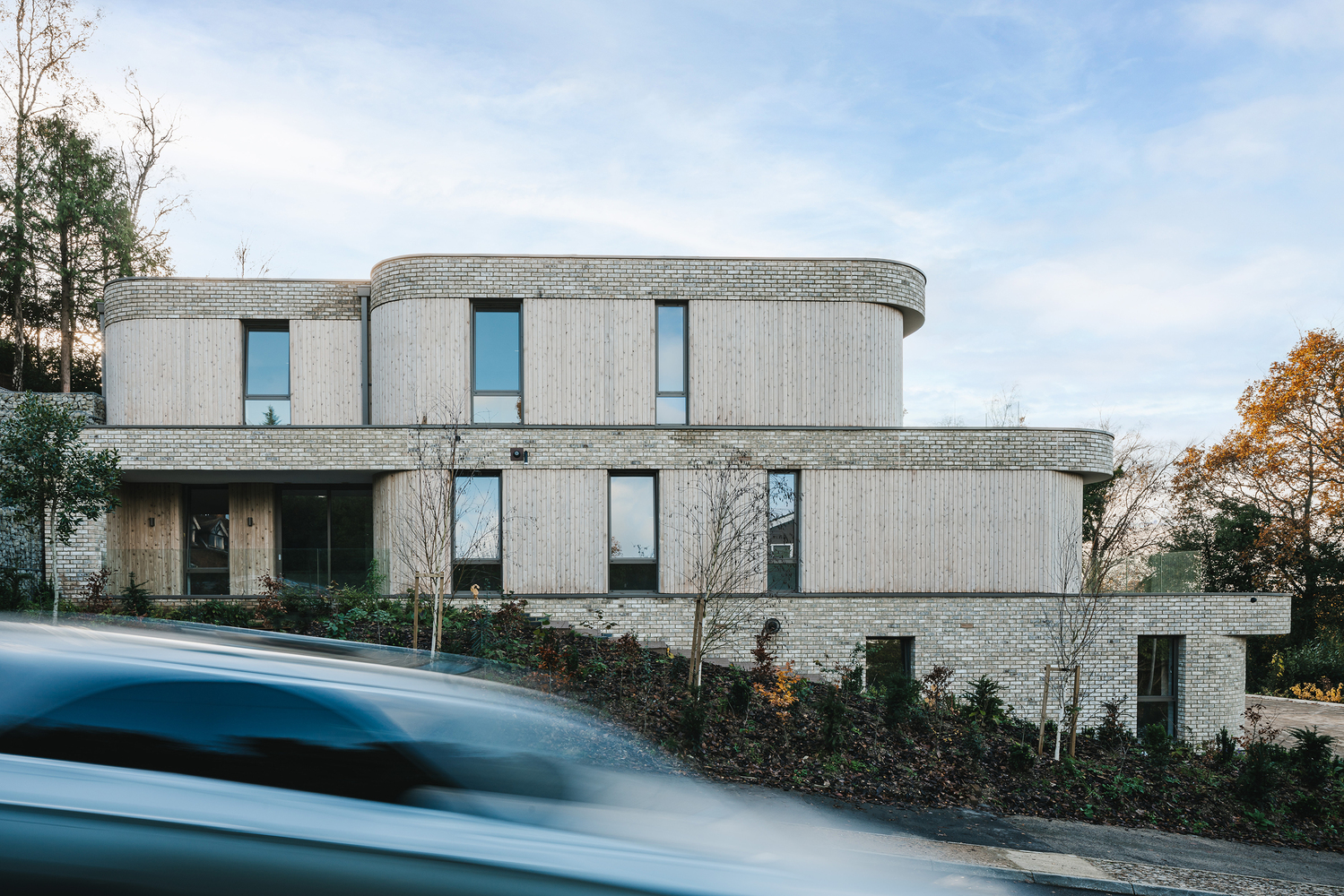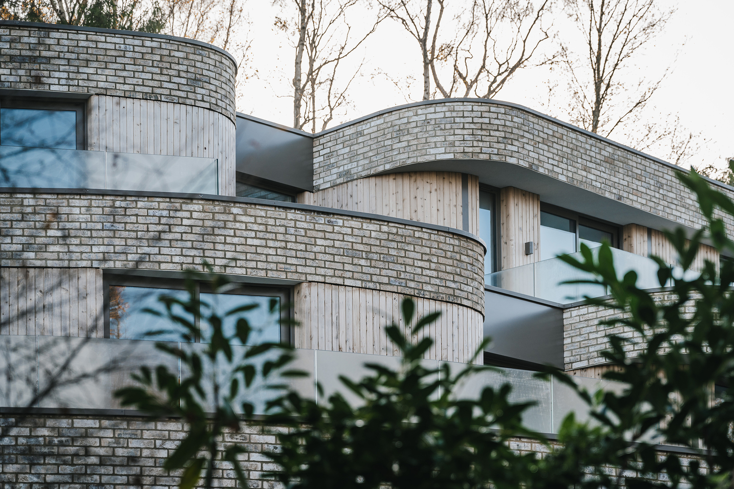 A palette of varied materials allows the buildings to further blend into their verdant surroundings. The robust earthy brick of the ground floor supports light vertical timber cladding and oversailing brick banding of the upper floors, which appears lightweight in contrast.