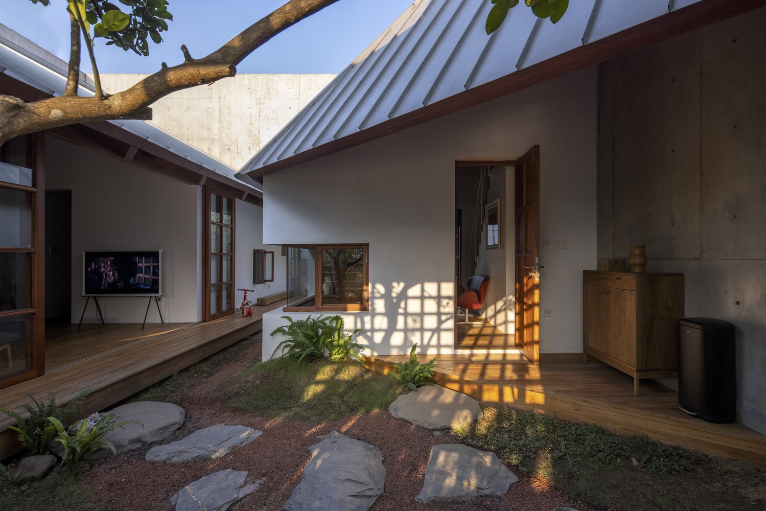 DHY house has almost 4 opening sides because of the setback with the edge. Combined with the main living areas being deeply reclined and covered by the sloping system, the courtyards with shade trees, the entire living space of DHY house can be opened, and combined with ceiling fans and natural ventilation, the owner can live without AC on the hottest day.