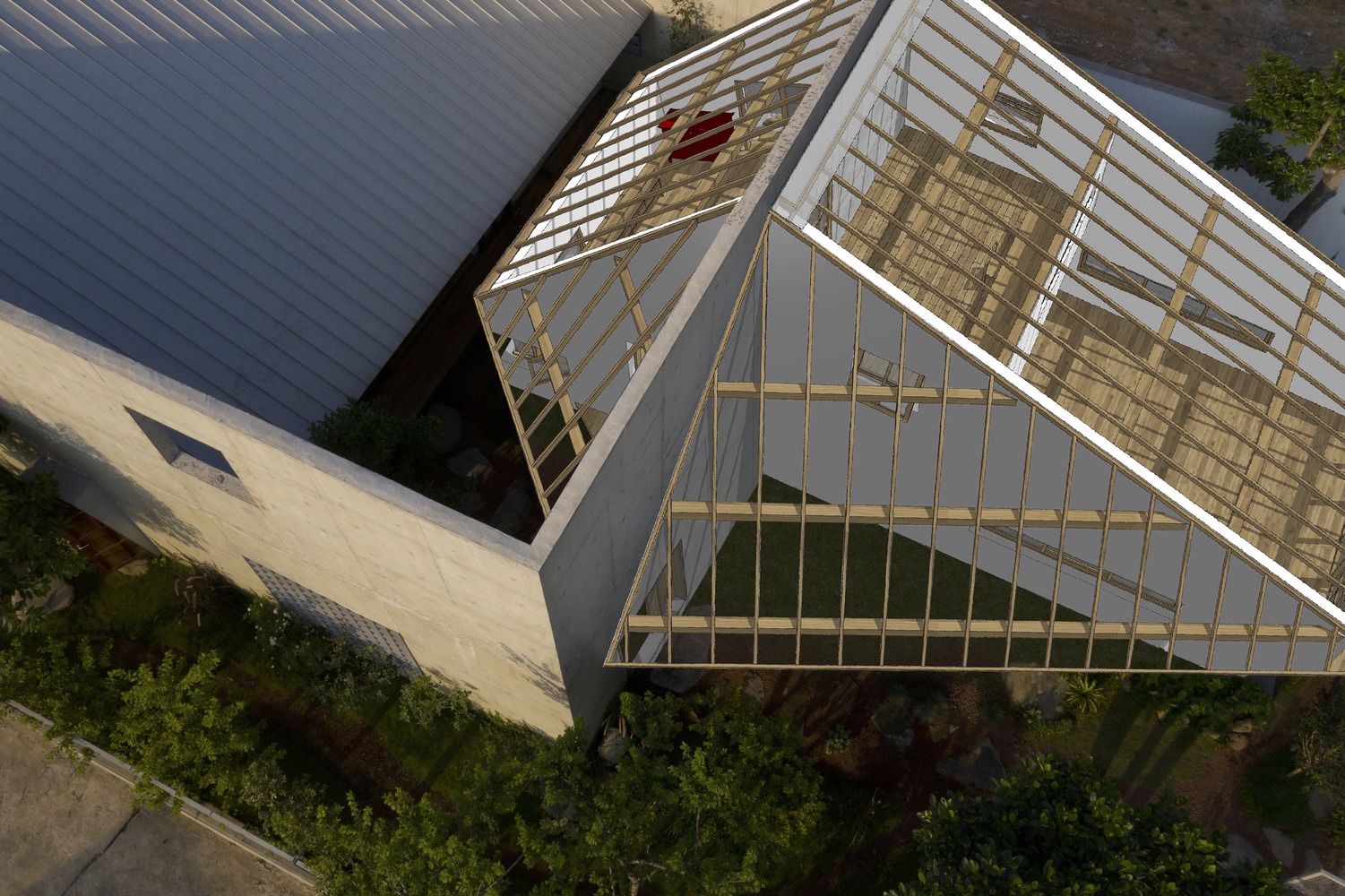 The concrete wall with the size of 12x12x7m is a visual shaping element as well as a functional division between the public area (coffee shop) outside and the private area (house) inside. The entire function of living space is encapsulated in a volume of 1008m3 behind that concrete wall, protected and sheltered by a sloped roof system with a lowered roof ridge (2m) with different elevations, depending on the sun direction, and wind direction of that block.