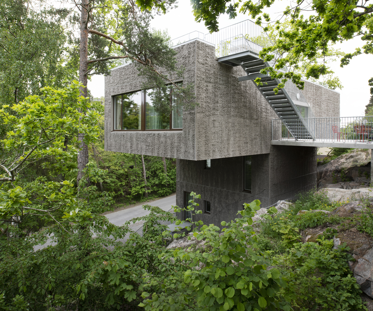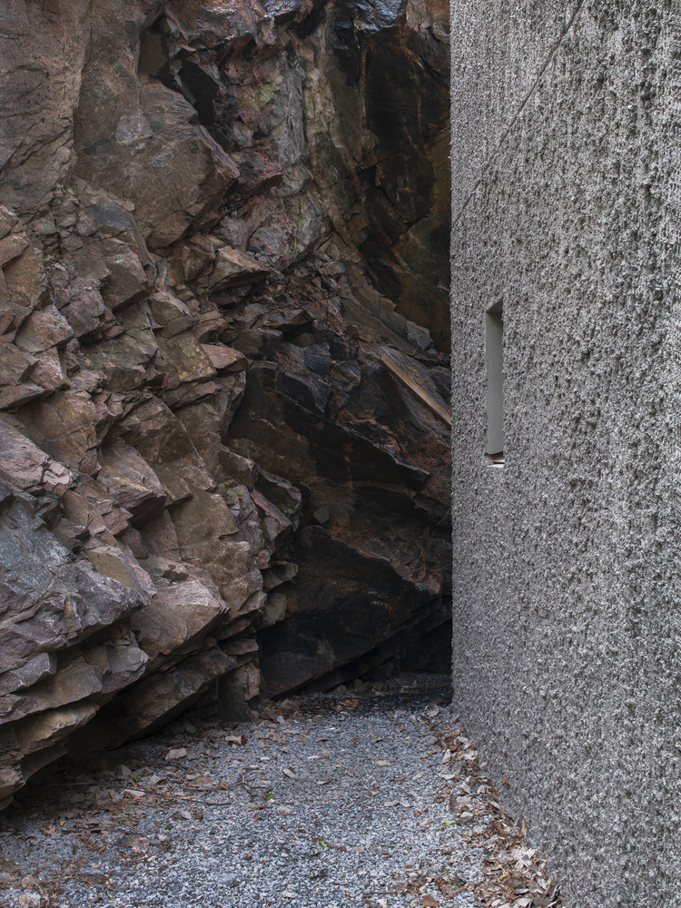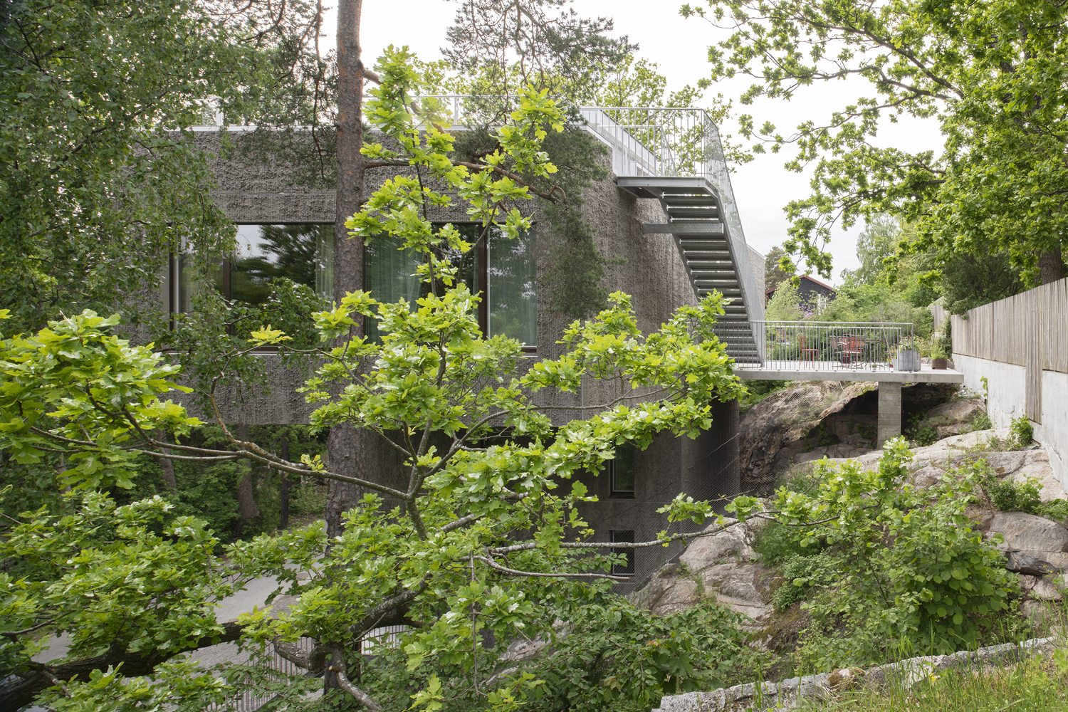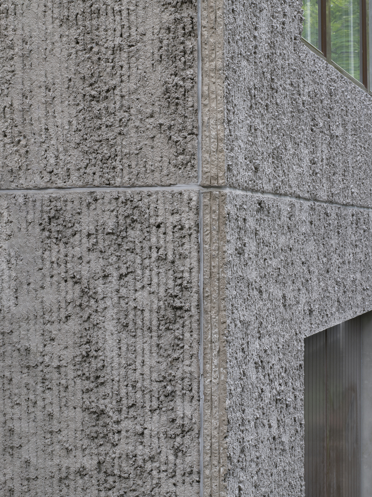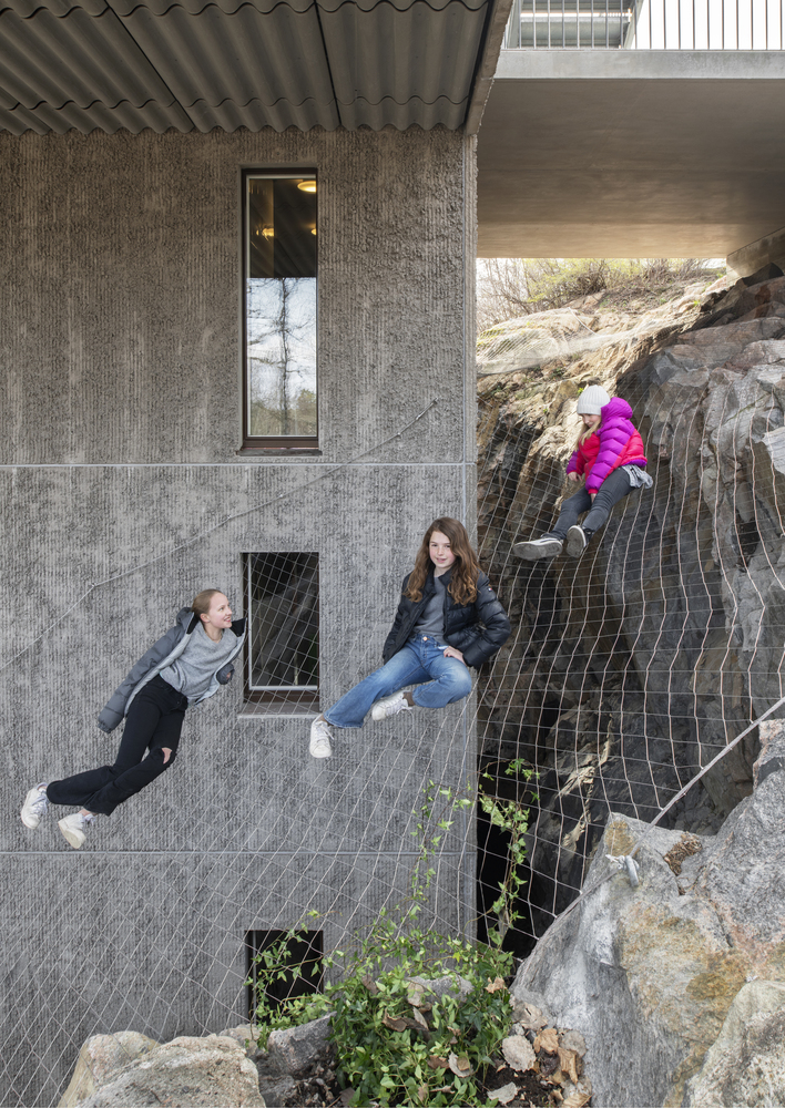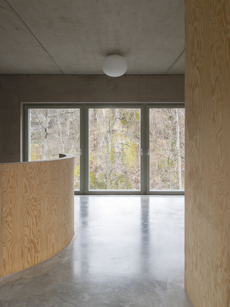 The sandwich panel with the mold side inwards allows for a manually raked treatment of the facade surface which visually blends with the bark of the trees. The choice of concrete as a building material derives from the moisture-exposed position in the rock. Materials have been used with untreated surfaces together with simple technology solutions such as the use of thermal inertia. The interior has a warm character with the exposed wooden surfaces in contrast with the hard exterior.