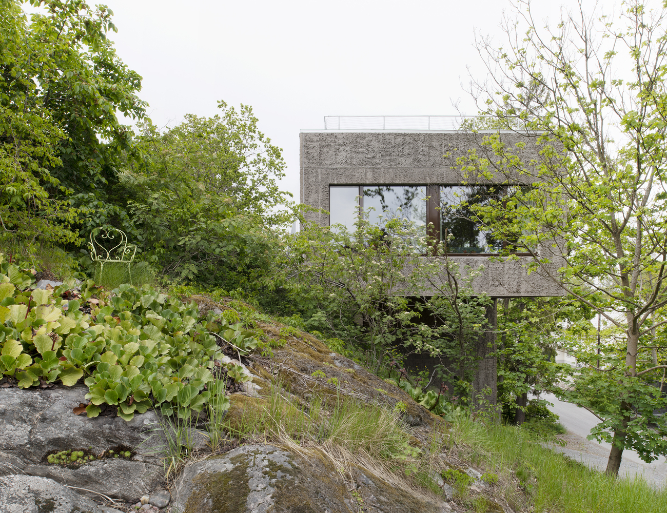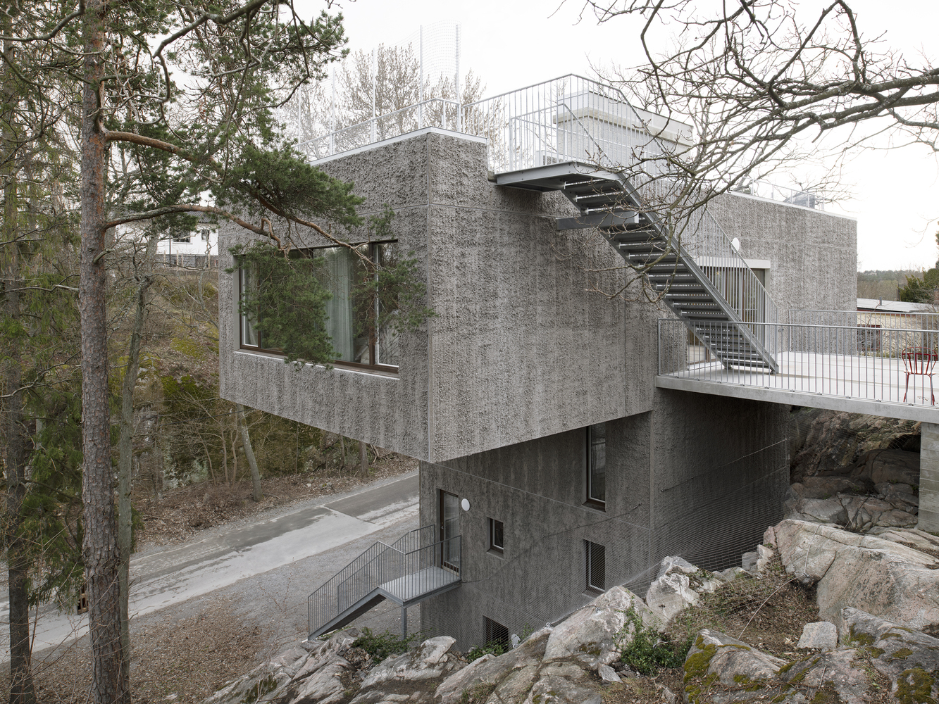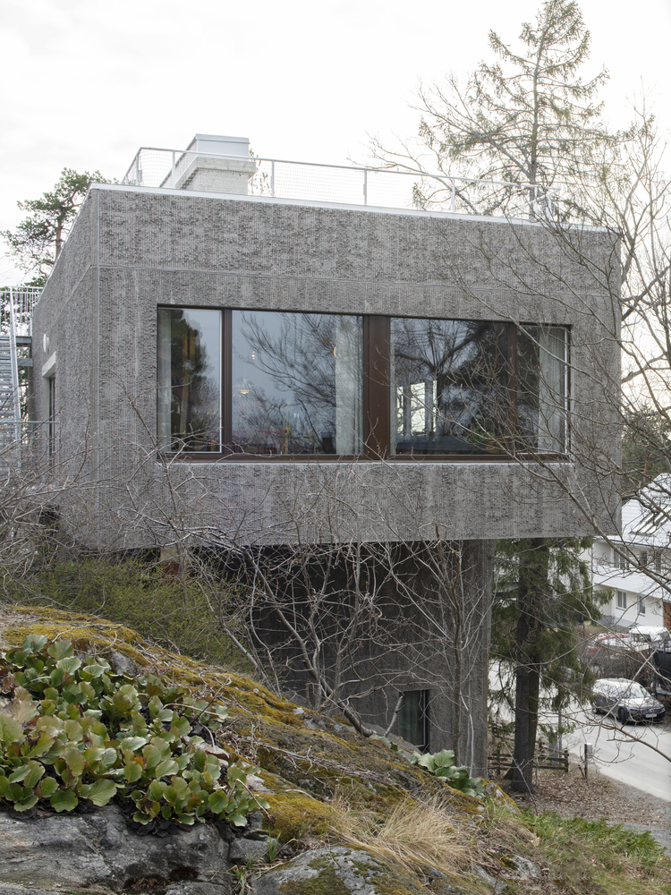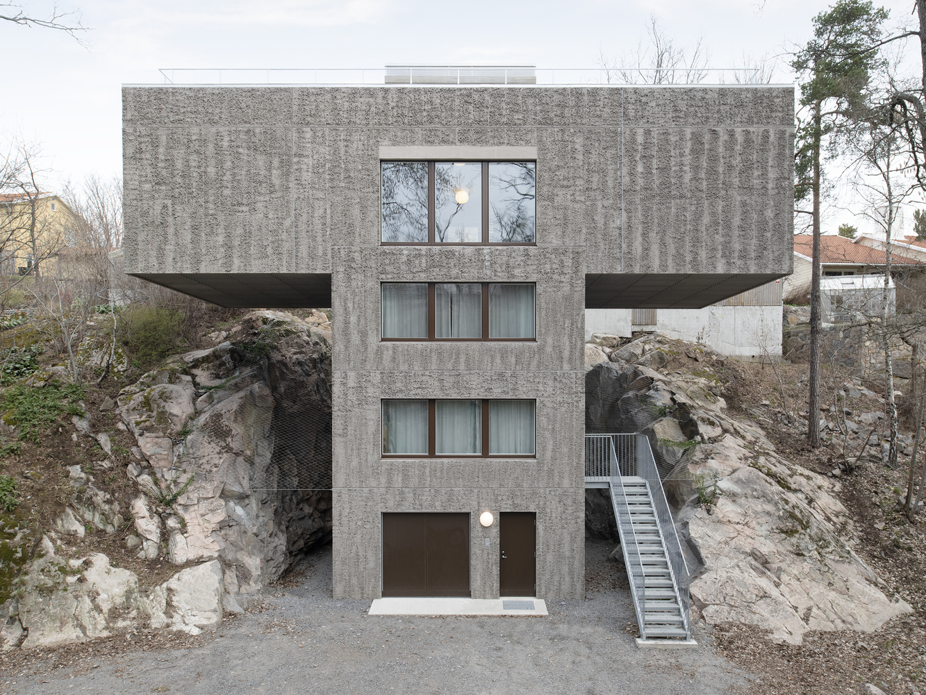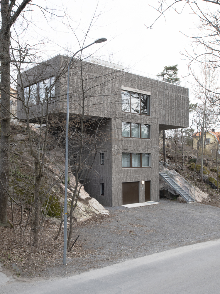 The sandwich panel with the mold side inwards allows for a manually raked treatment of the facade surface which visually blends with the bark of the trees. The choice of concrete as a building material derives from the moisture-exposed position in the rock. Materials have been used with untreated surfaces together with simple technology solutions such as the use of thermal inertia. The interior has a warm character with the exposed wooden surfaces in contrast with the hard exterior.