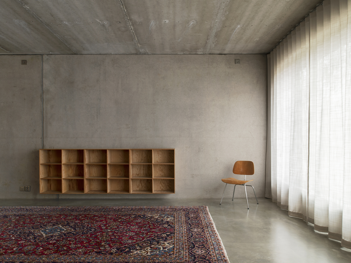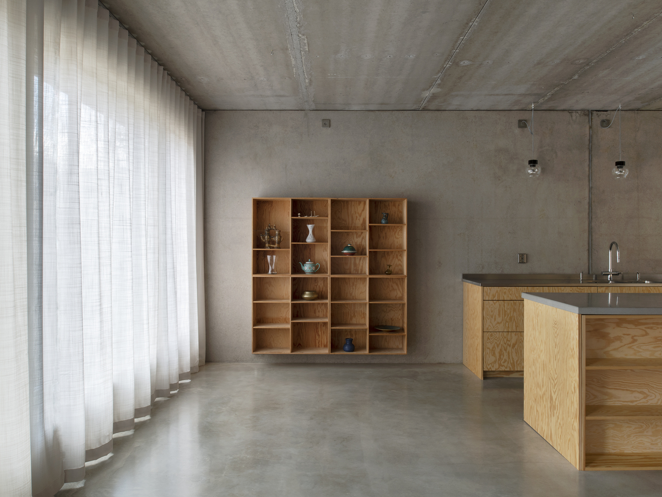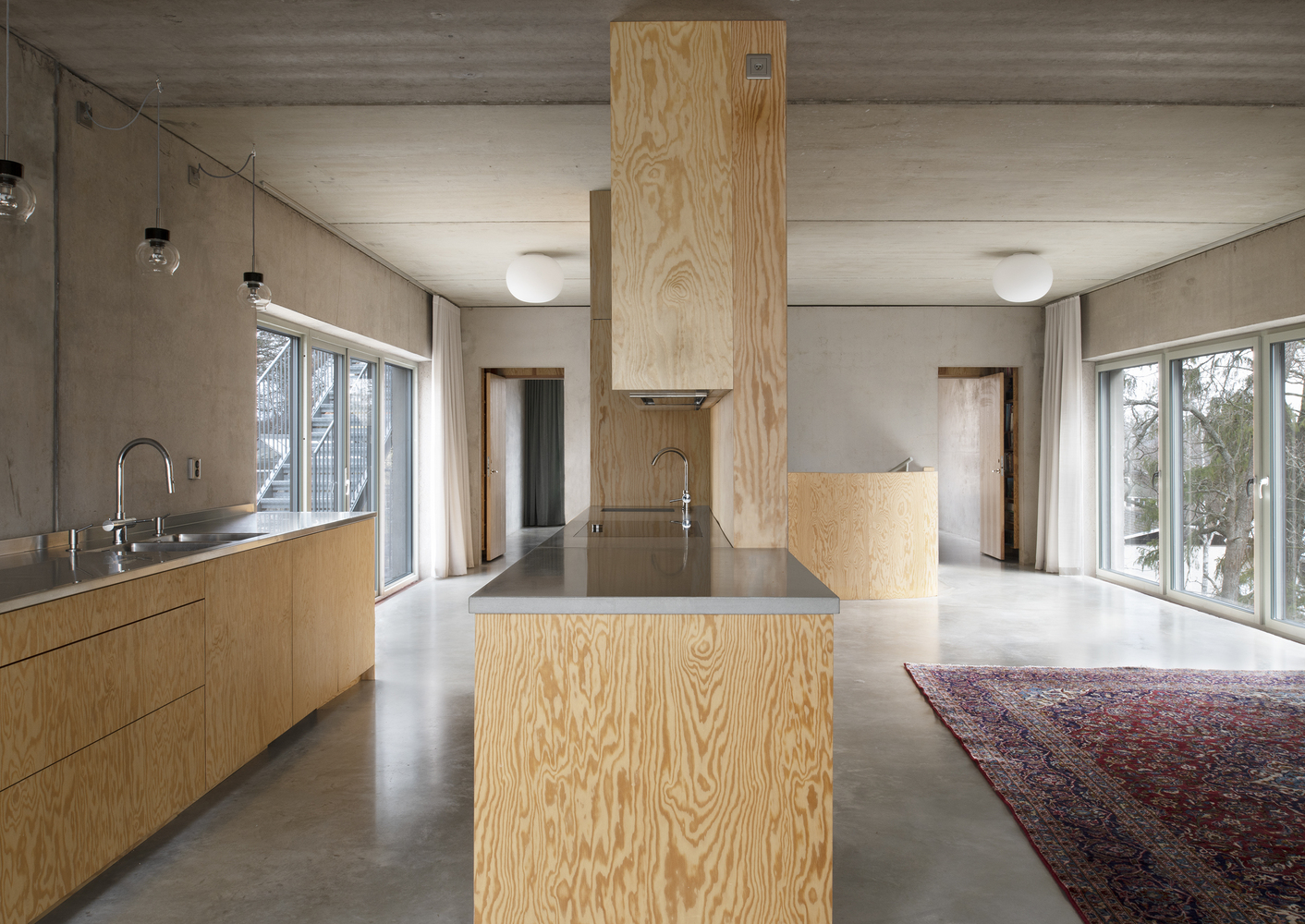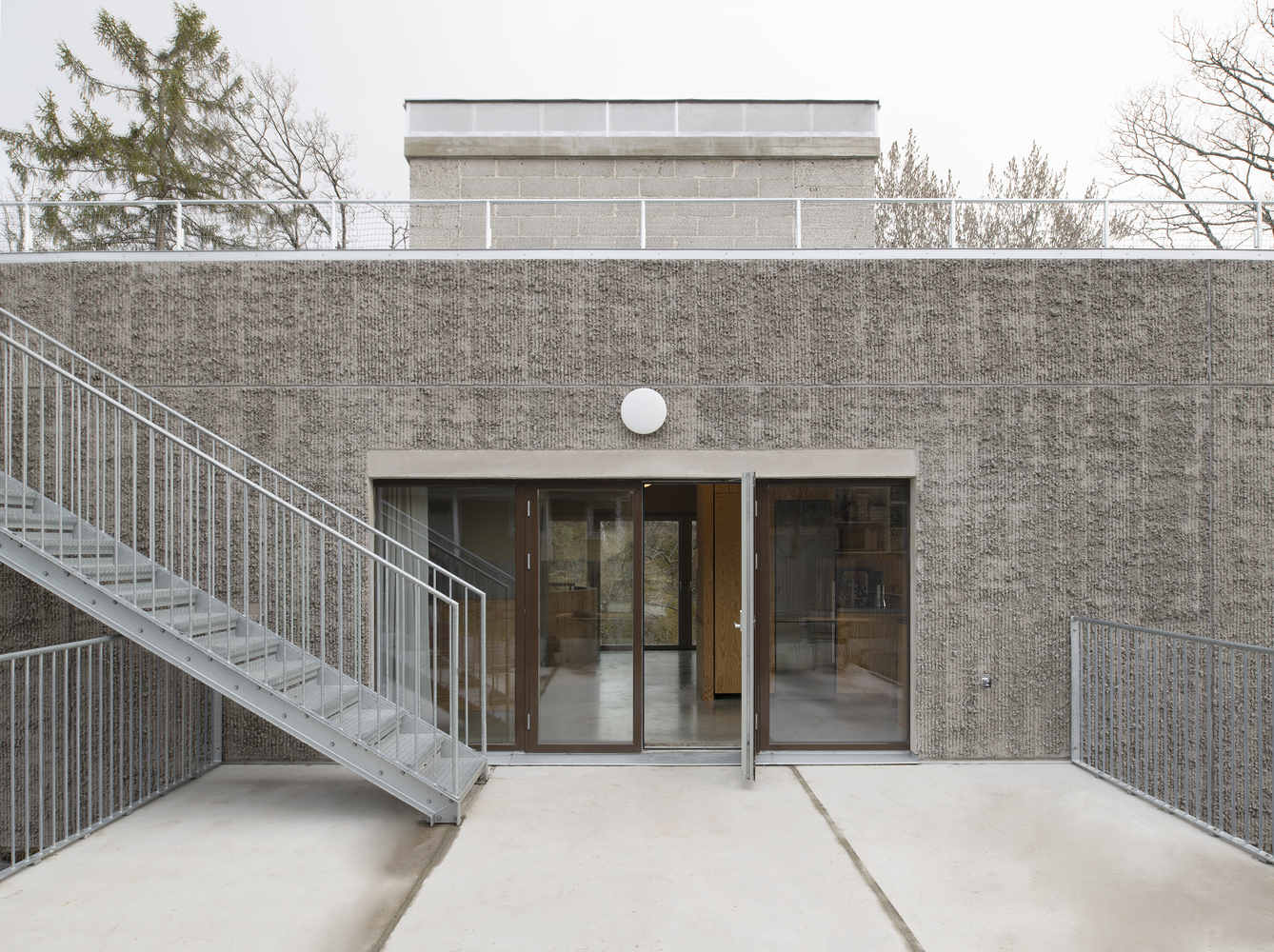 The sandwich panel with the mold side inwards allows for a manually raked treatment of the facade surface which visually blends with the bark of the trees. The choice of concrete as a building material derives from the moisture-exposed position in the rock. Materials have been used with untreated surfaces together with simple technology solutions such as the use of thermal inertia. The interior has a warm character with the exposed wooden surfaces in contrast with the hard exterior.