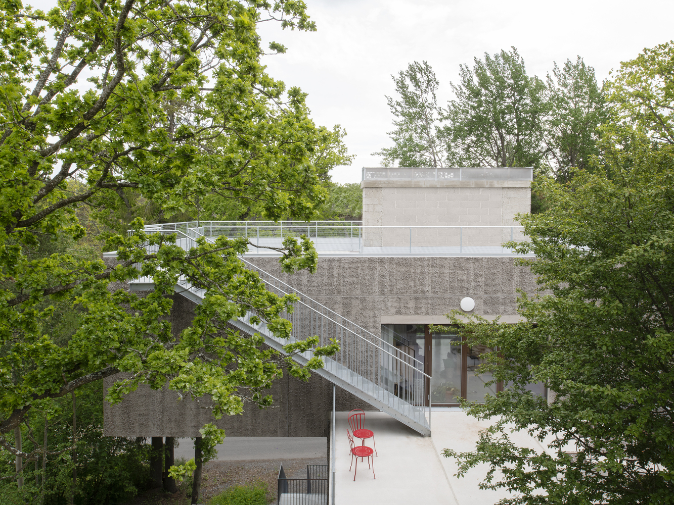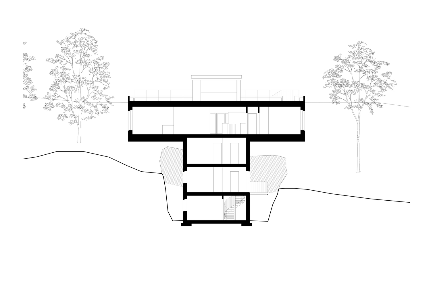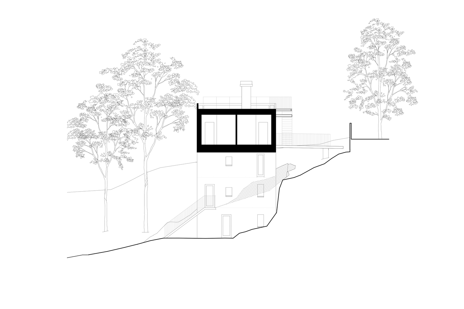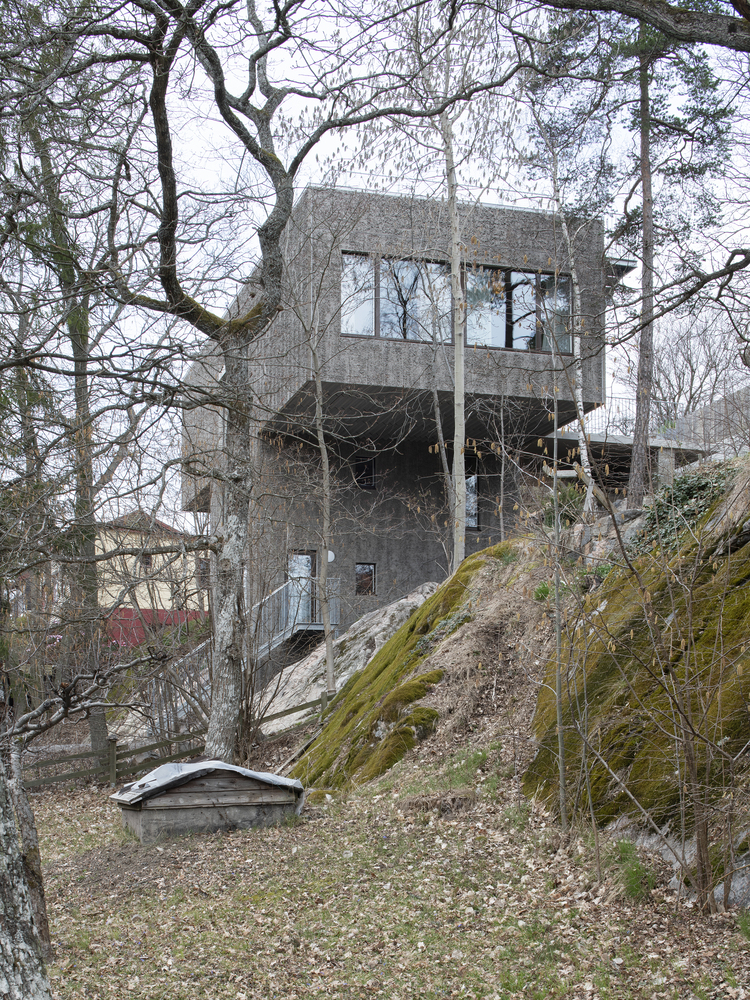 The trees around the house have been preserved and the house rises in the foliage. In the narrow body, the kitchen-living room is placed as high up as possible in order to get the views and the light. For good accessibility and function, the stairwell is in the center of the body from which all stories and functions are reached.