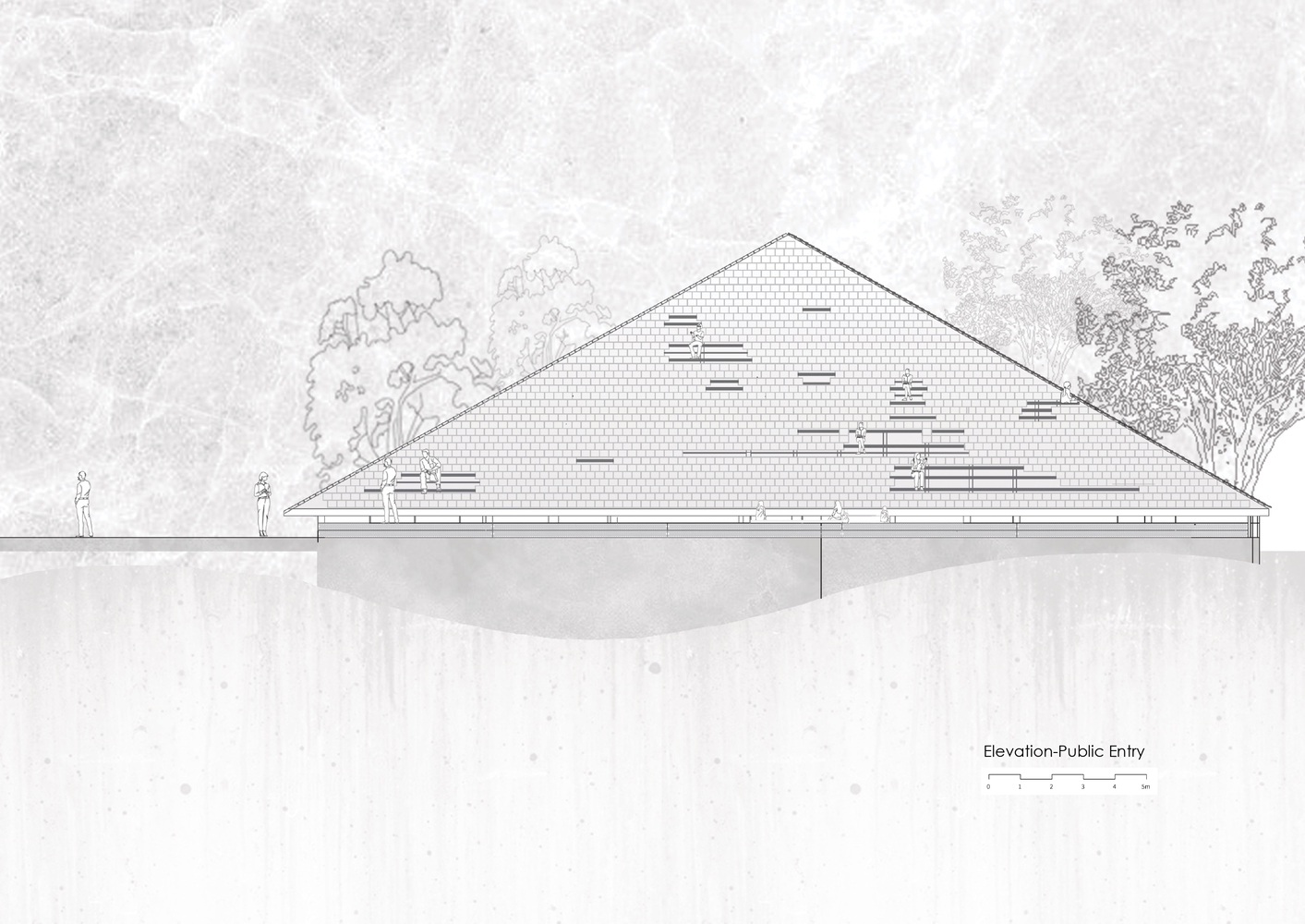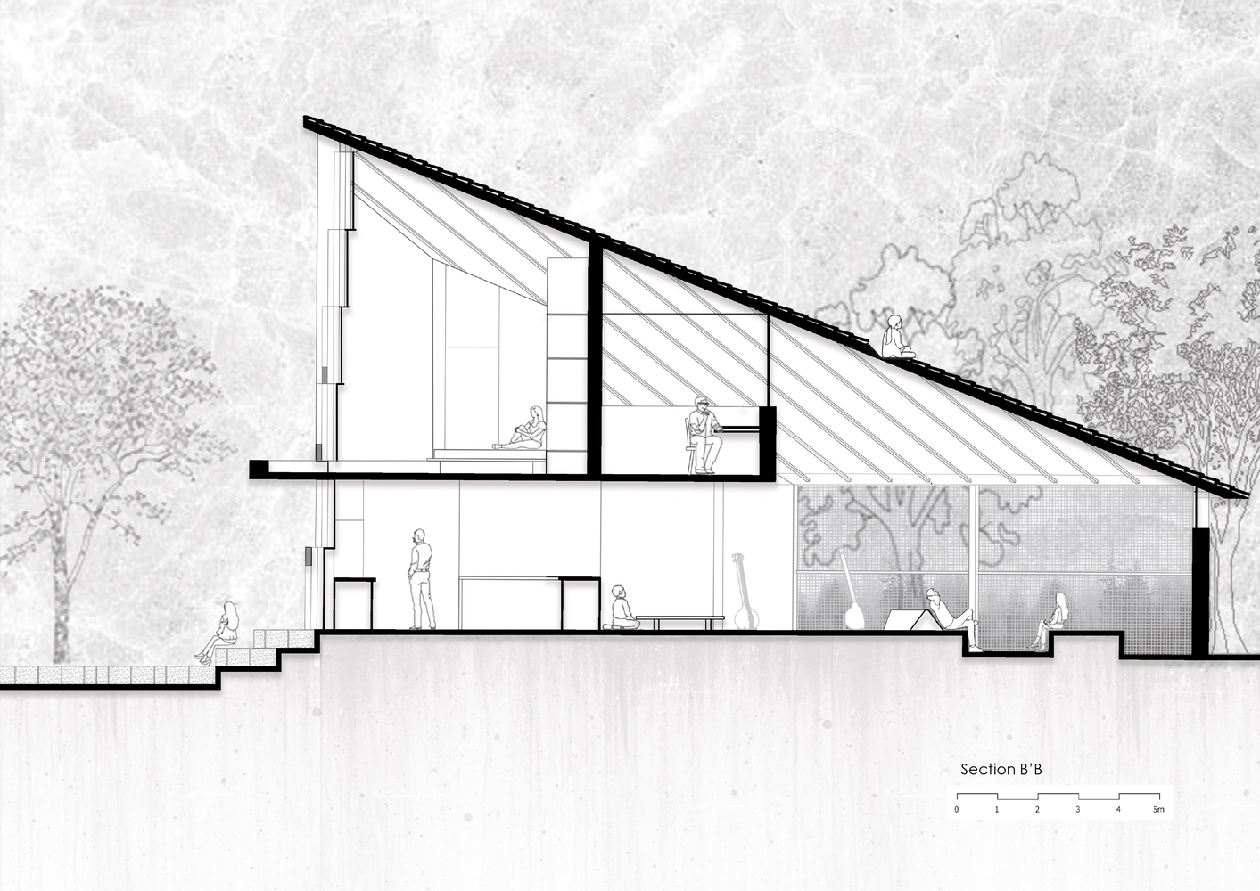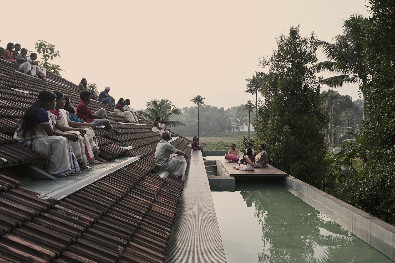 The 35° angle of the roof seemed to perfectly match the 30° angle of an Open-Air Amphitheatre, and the idea for the same skylights to become seating spaces for an audience was born. A series of wooden planks could be set on the swimming pool and immediately double up as a stage for open-air concerts accommodating 75-80 people.