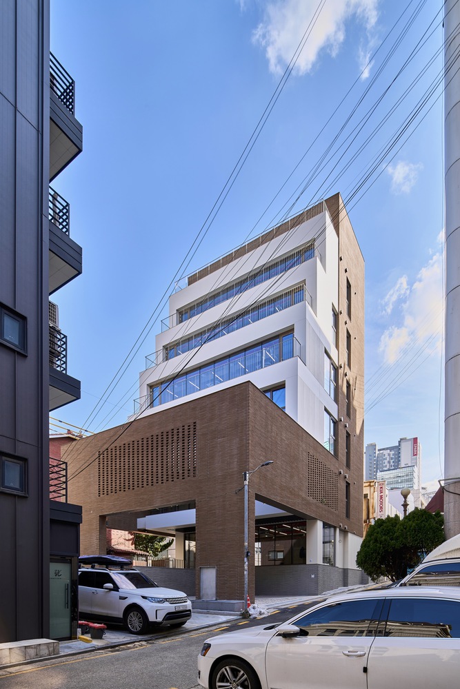 이 계단식 형태의 건물은 서초역 인근에 위치해 있으며, 도시의 활기와 조화를 이루면서도 주변 건물들과 자연스럽게 어우러지도록 설계되었습니다. 건물 하층부는 벽돌 외장으로 둘러싸여 외부의 소음을 차단하고 상업 공간에 독특한 분위기를 제공합니다.