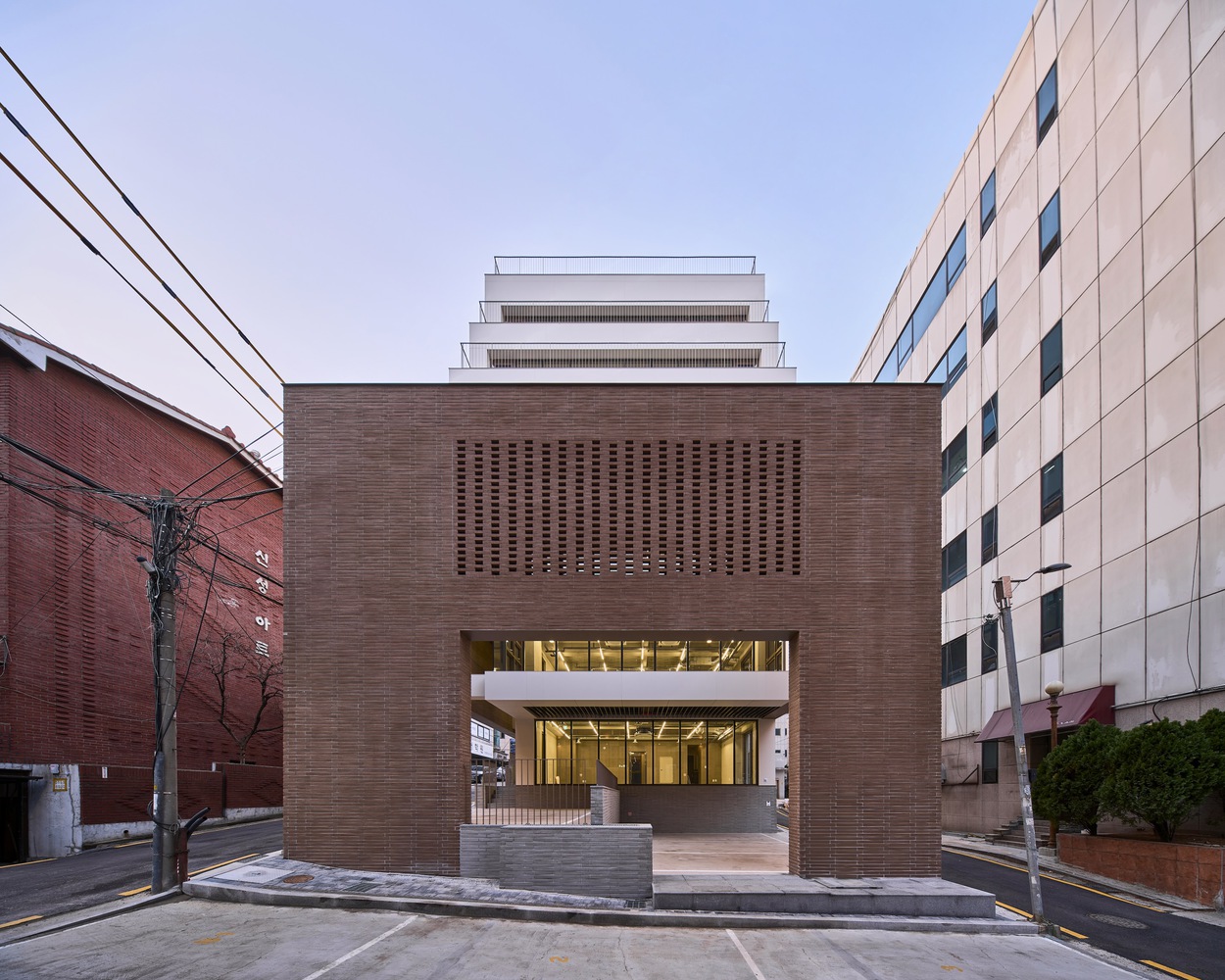 외부는 견고한 벽돌로 강렬한 인상을 주며, 내부는 가벼운 세라믹 패널과 투명한 유리로 시각적인 대비를 이루어 깊이감을 더합니다.