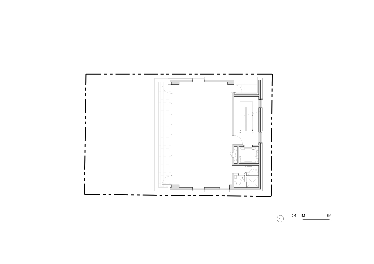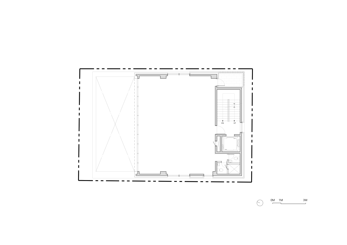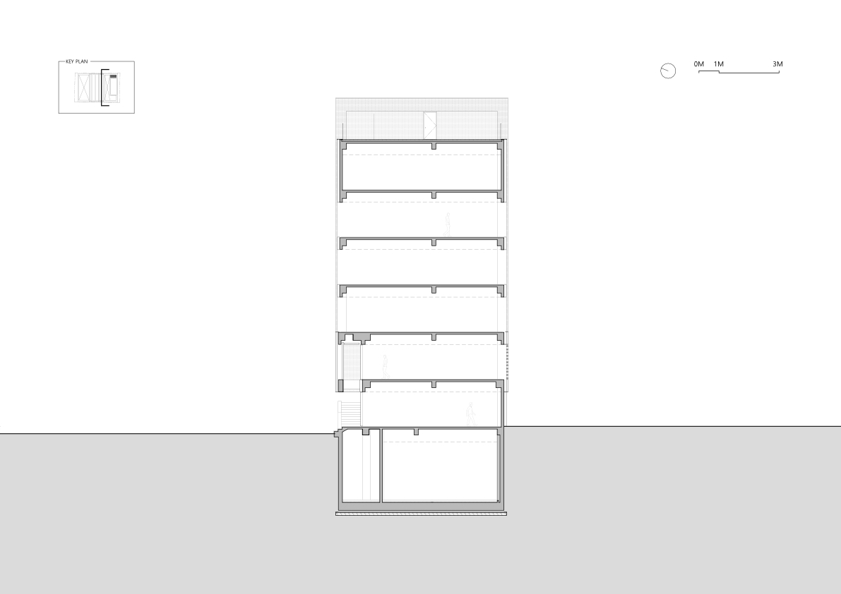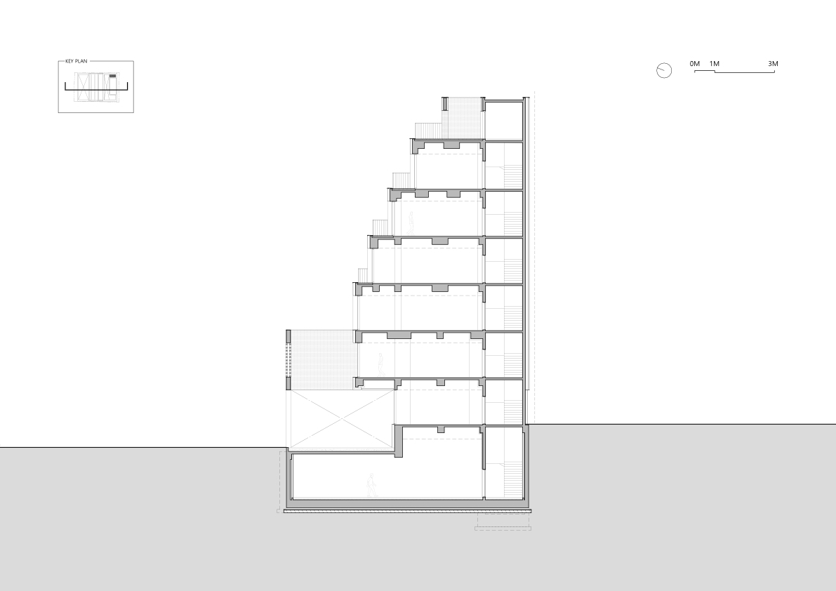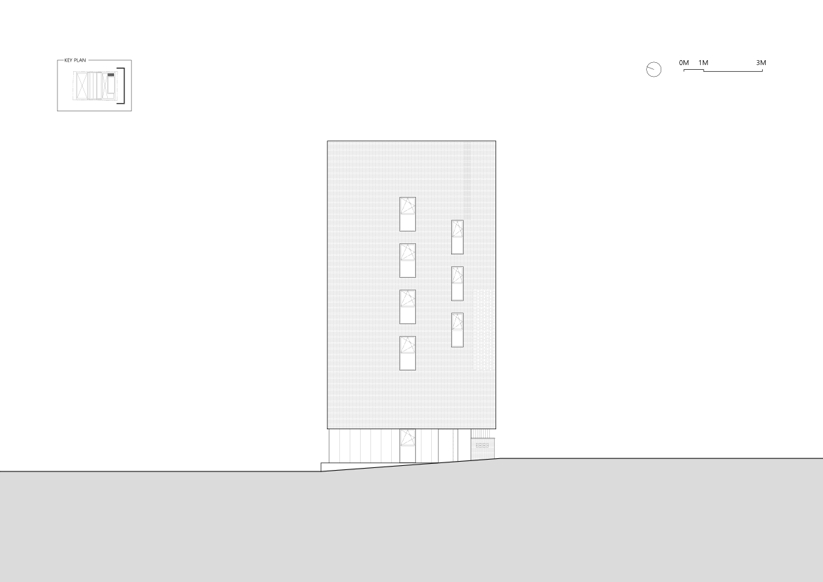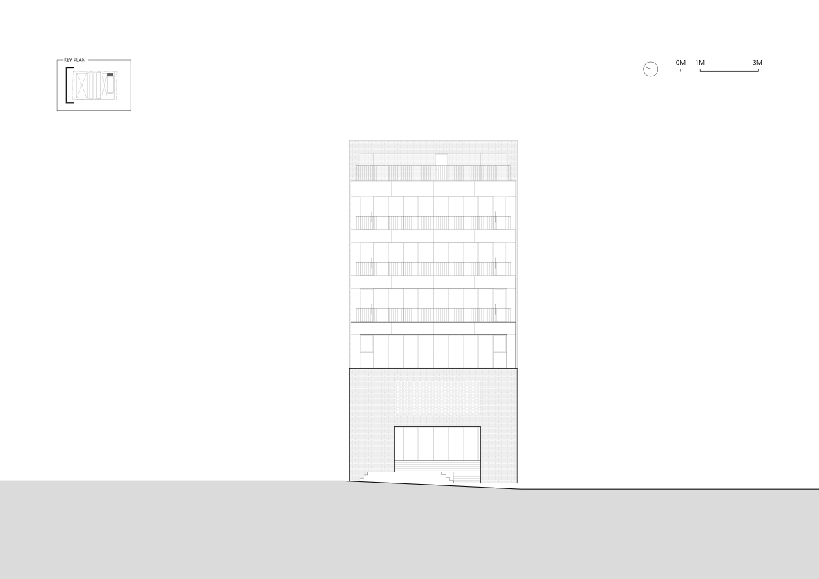 Commercial Space Utilization and Accessibility - The basement, first, and second floors are dedicated to commercial use, focusing on optimizing space utilization and accessibility. A screen wall is installed on the lower levels to provide visual privacy while forming the main access route. This pathway blocks external views while enhancing the vitality of the lower-level commercial spaces with various forms of exterior lighting. These lights highlight the commercial areas at night, making them more accessible and inviting to visitors.