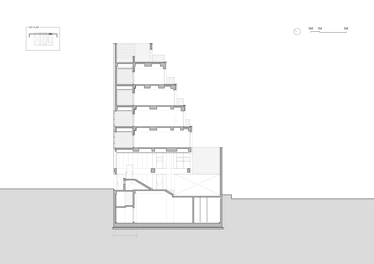 Private Terraces - Taking advantage of the mass setbacks created by the northern sunlight regulations, private outdoor spaces were designed on each floor. Though compact, these spaces allow for various activities, offering building users a unique spatial experience. These terraces, which are not counted as part of the building’s gross floor area, serve as tranquil retreats within the urban environment, enhancing the building’s overall value. Here, users can take a break and enjoy a moment of respite, stepping away from the daily hustle.