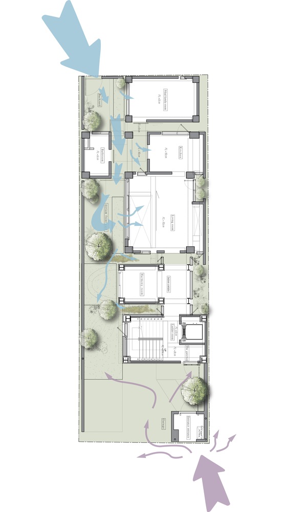 In response to the climate and surrounding physical environment, the standalone building is transformed into five unaligned structures. The vertical circulation is placed in the first building facing the northeast wind, while the living spaces are pushed backward, reducing the adverse effects of cold wind and humidity. The height of the buildings on the southwest side is reduced to receive the southwest wind. By narrowing the wind passage and accelerating wind speed, it can penetrate through the courtyard and follow the buildings and trees upwards, or enter the interior through gaps between the buildings. Thus it creates a favorable indoor microclimate and a comfortable experience. One can fully experience the outdoor nature even staying indoors.