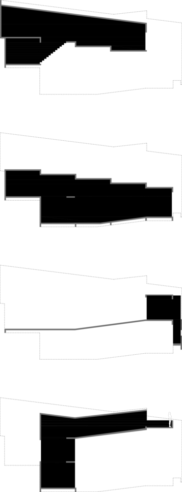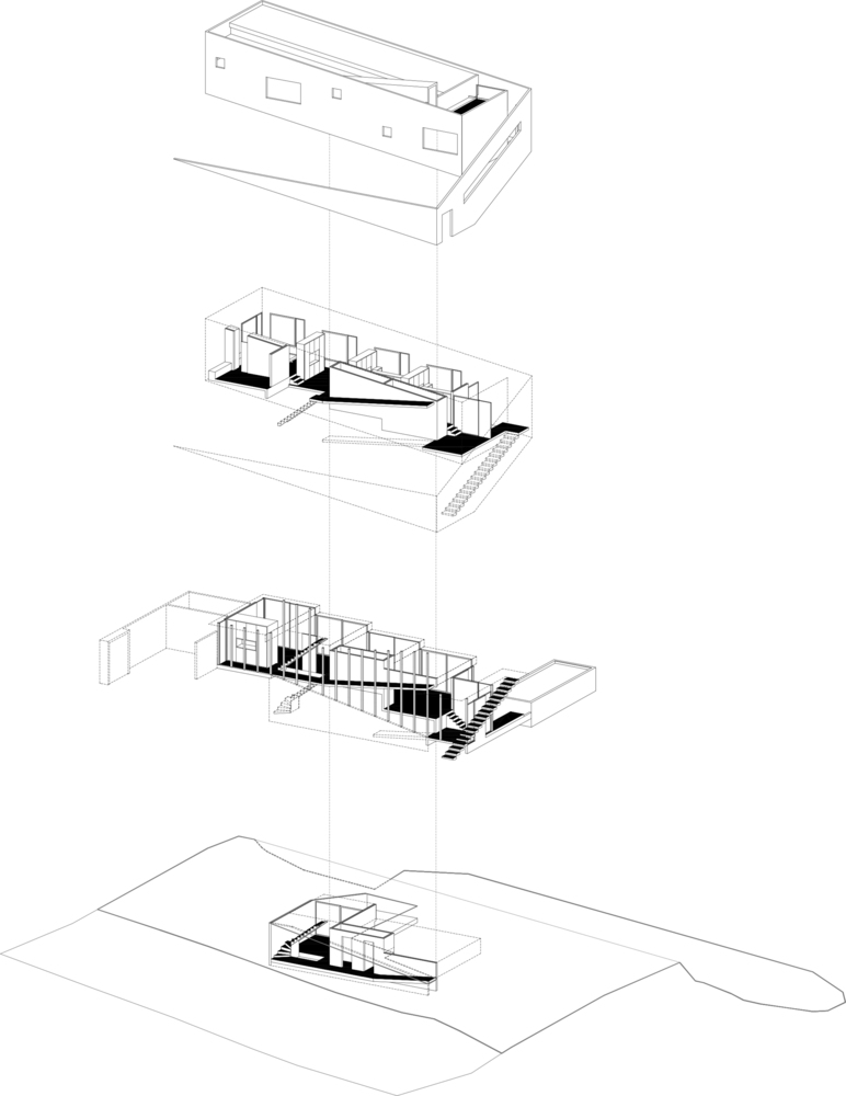 건물은 두 개의 계단식으로 연속된 공간으로 나뉩니다. 하층부는 주변 풍경을 감싸는 형태로 거실, 주방, 다이닝룸 같은 사회적 공간을 담고 있으며, 상층부는 더 내향적인 성격을 지니며 침실, 사무실, 가족실 같은 친밀한 공간으로 구성됩니다.