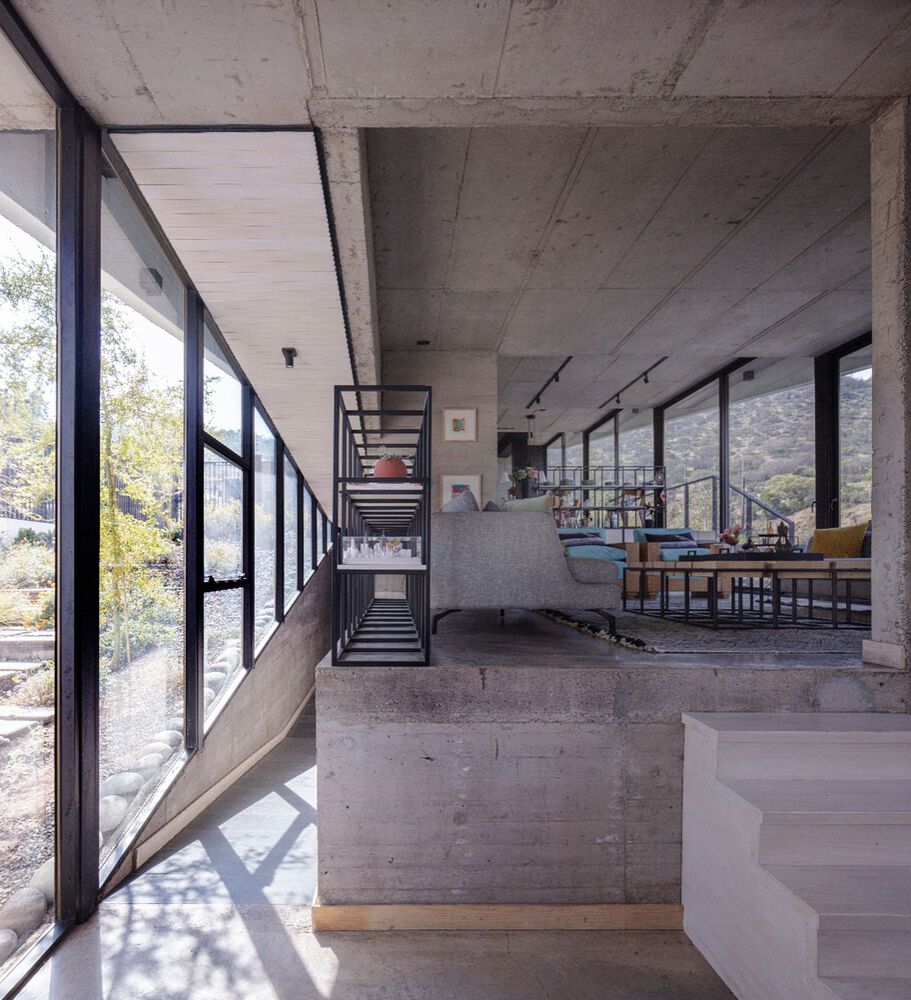 The Sloping House owes its name to the dual condition of assuming the slope of the pre-Andean range of Santiago and self-acquired family debt, which confronts us with the revisionism of our own way of living, inhabiting, and projecting. As the first decision in starting this family project, we took on the slope and inhabited the continuous space, embodying in this domestic space a conscious search experienced in almost 20 years of professional practice, which set a roadmap for the project: the house had to be traversed, it had to allow for communal and individual life, the social, work, and contemplation, the functional and the aesthetic. As a foundational act, we traced the spaces with chalk on the ground and captured with a device the views that each one wanted to frame (see photos by authors).