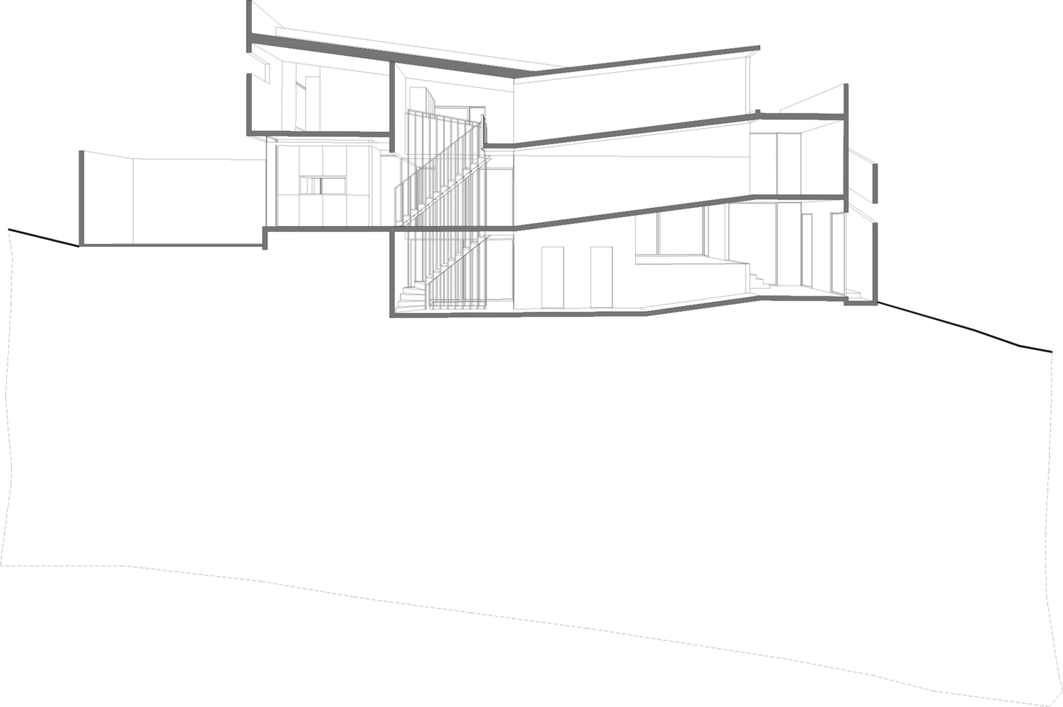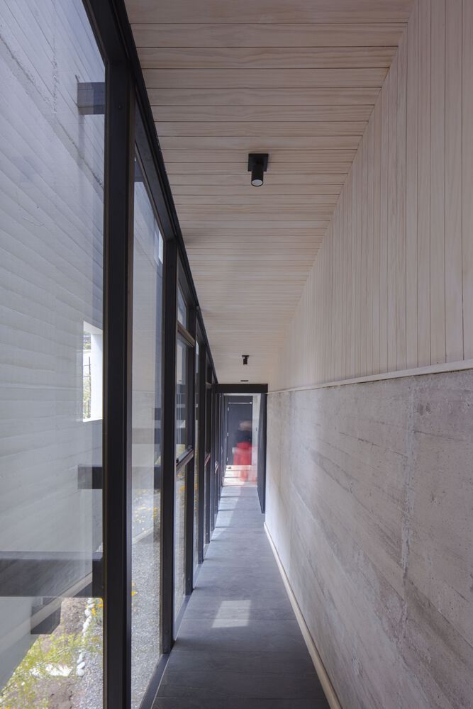 The pavements of refined concrete slabs and the exposed concrete walls form an austere interior atmosphere devoid of other finishing elements, which only appear as punctual applications within the interior journey. This material austerity is also carried into the interior of the bathrooms, which are worked as monochromatic spaces with glass mosaic on walls and floors. The stairs and ramps, as elements of the natural connection between the two superimposed naves, generate new relationships between them and propose different speeds of movement. The staircase for faster walking connects the spaces directly, while the ramp allows for a slow ascent against the slope and a gradual discovery of each room or the surrounding landscape.