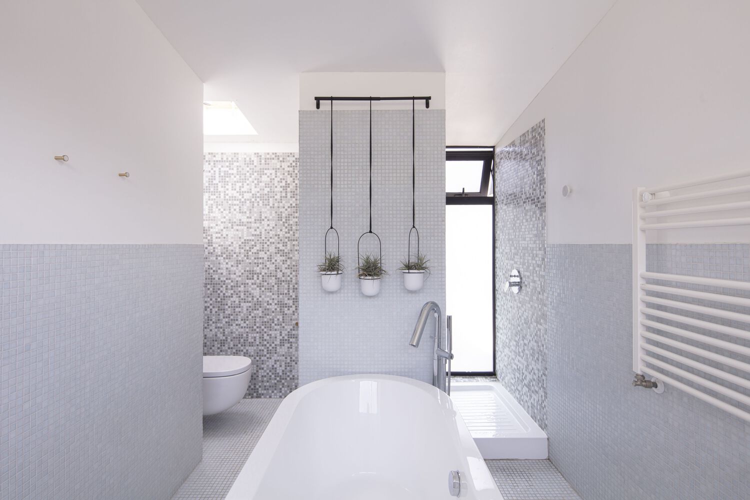 노출 콘크리트와 정제된 콘크리트 슬래브가 내부의 주된 재료로 사용되어 절제된 분위기를 형성하며, 별도의 마감재는 최소화되었습니다. 특히 욕실은 유리 모자이크로 단일한 색상을 적용해 일관된 디자인을 유지했습니다.