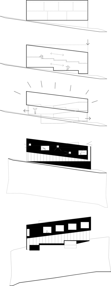 계단과 경사로는 두 개의 중첩된 공간을 연결하는 주요 요소로 작용합니다. 계단은 빠르게 이동할 수 있도록 설계되었으며, 경사로는 주변 경관을 서서히 감상하며 공간을 탐색할 수 있도록 만들어졌습니다.