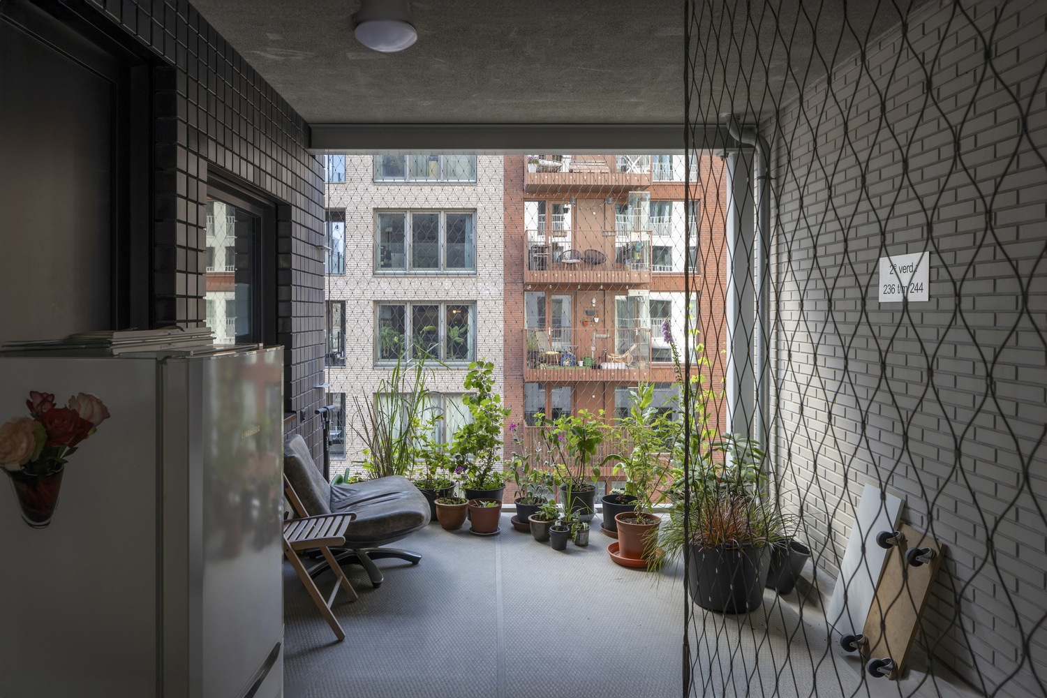 By covering the adjacent parking garage with greenery, it is incorporated into the courtyard garden design. This enhances biodiversity, appearance, and acoustics in the heart of the plot, and the garden's planting plan allows the various seasons to be experienced. The corner building translates the urban principle of contrasting individual buildings into architectural principles by splitting the building into two parts in terms of function and materialization, creating a double building. One part, 3 meters wide, serves as a spacious entrance for the residential building, vertical circulation, outdoor space, and a meeting place for residents. This part features a gold-colored entrance portal, an industrial materialization, and is finished with stainless steel mesh as fall protection, which will be covered with climbing plants on the garden side, blending it with the courtyard garden's greenery.
