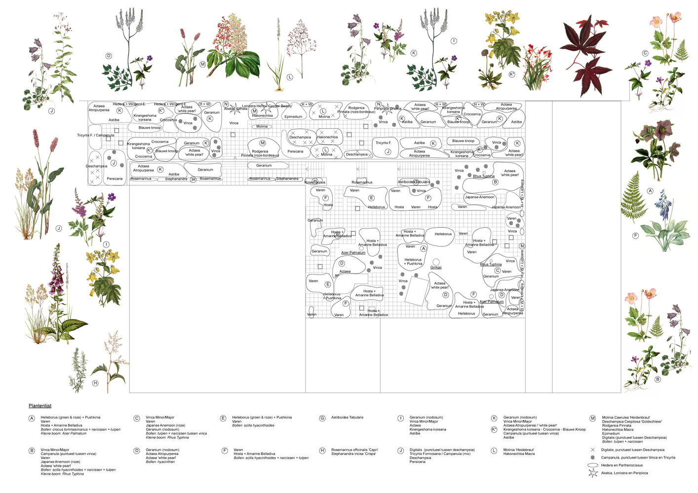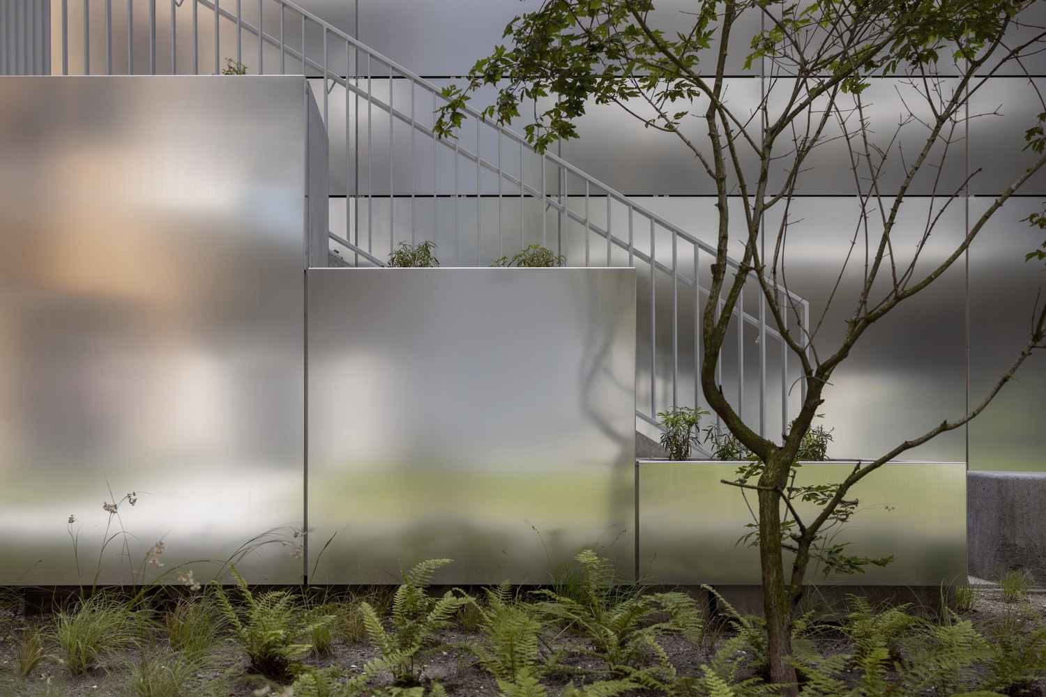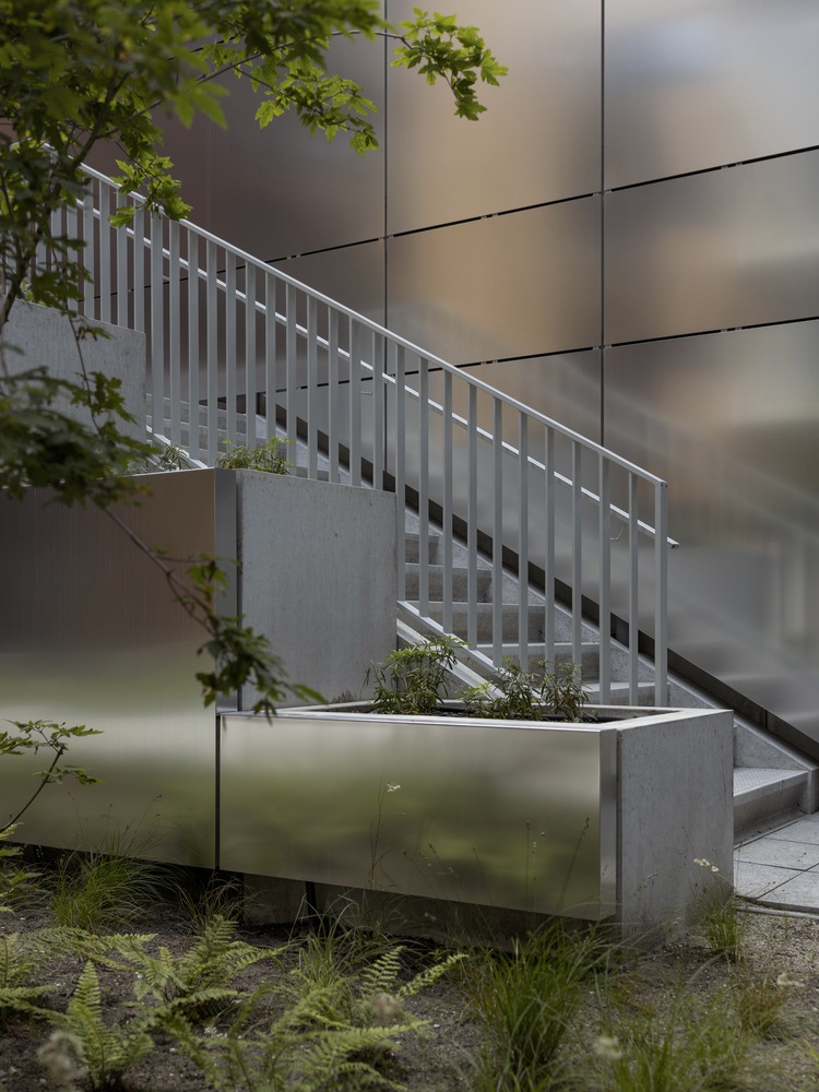 The garden is located on two levels, each with its own character and planting plan: a shady garden with trees planted in the full soil and a sunny garden on the roof of a logistical corridor running across the plot, intended for the municipal cleaning service. The levels of the courtyard garden are connected by a generous staircase equipped with planters, integrating the stairs into the garden. The staircase and corridor are clad with a matte reflective coating, making the relatively small garden appear larger and reflect as much light as possible into the garden.