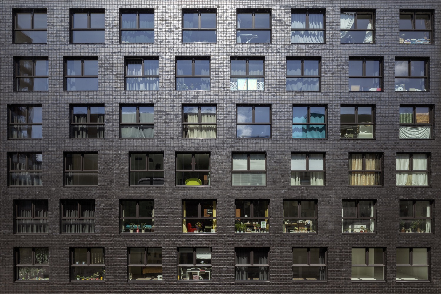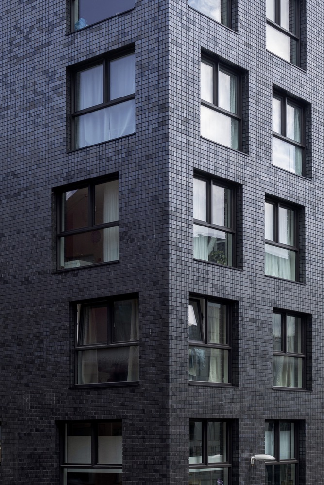 시니어 아파트는 검은 모듈 벽돌로 마감되어 있으며, 큰 창문들이 독특하게 배치되어 있습니다. 40m²의 컴팩트한 내부는 시니어들의 편의성을 고려해 중앙 코어(욕실, 화장실, 수납 공간) 주변으로 유연한 동선을 제공하고, 기능과 개방감을 극대화할 수 있는 레이아웃이 특징입니다.